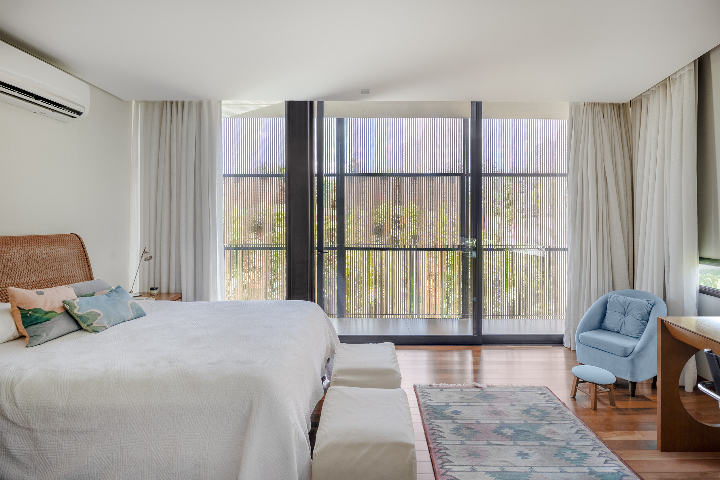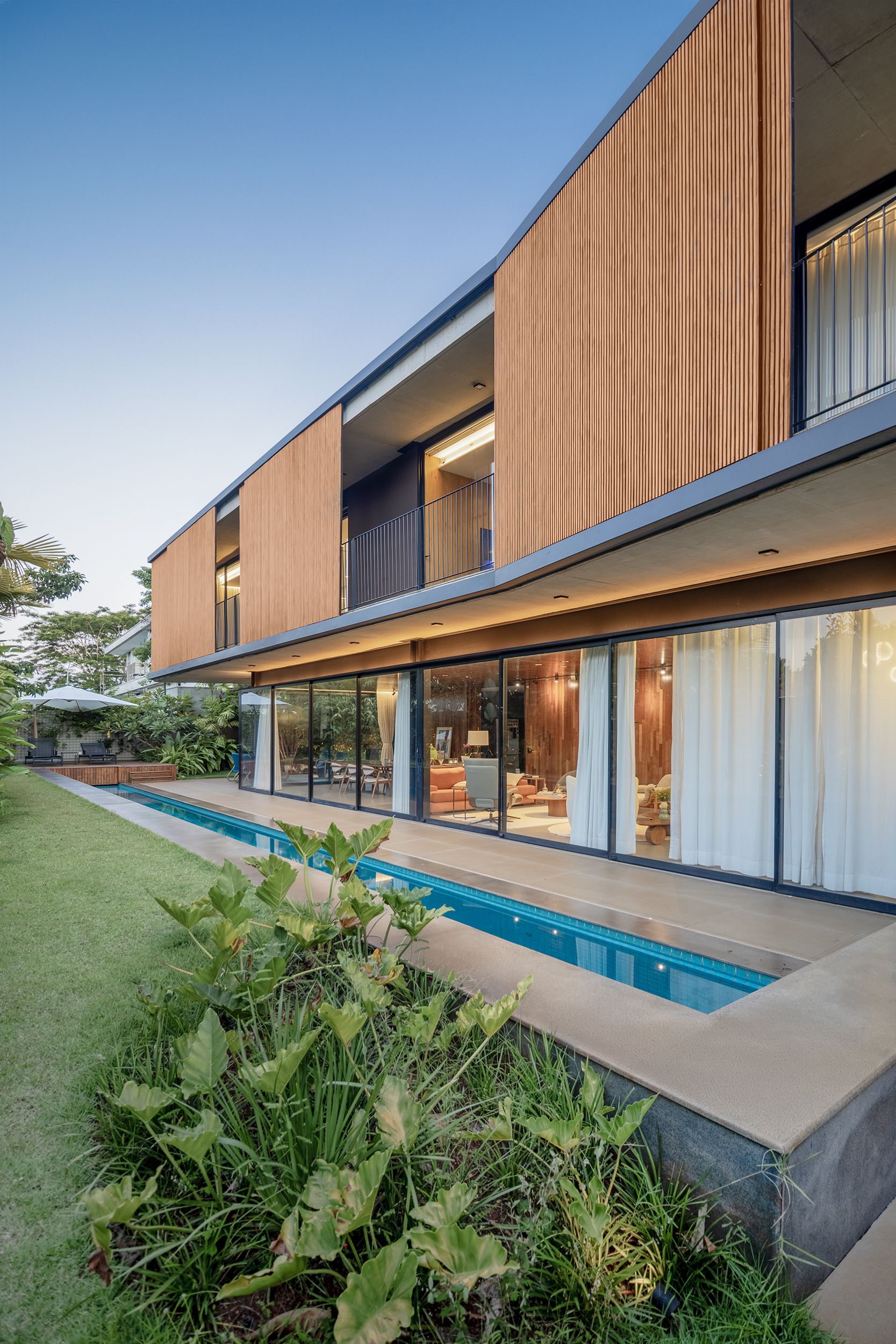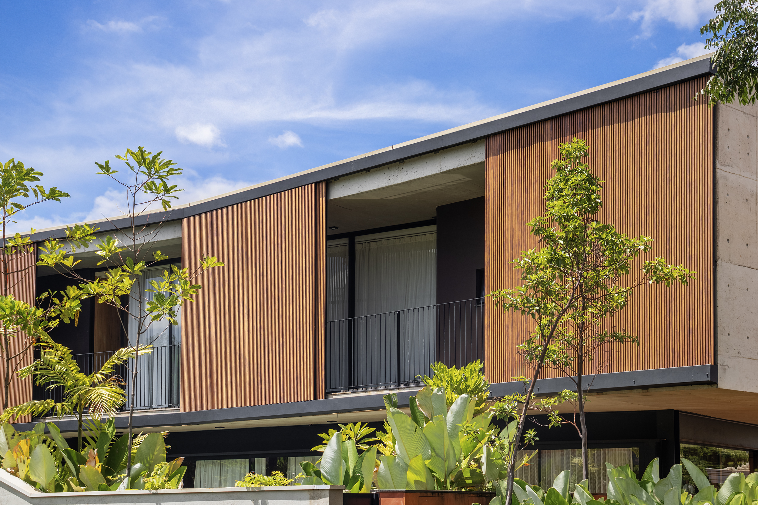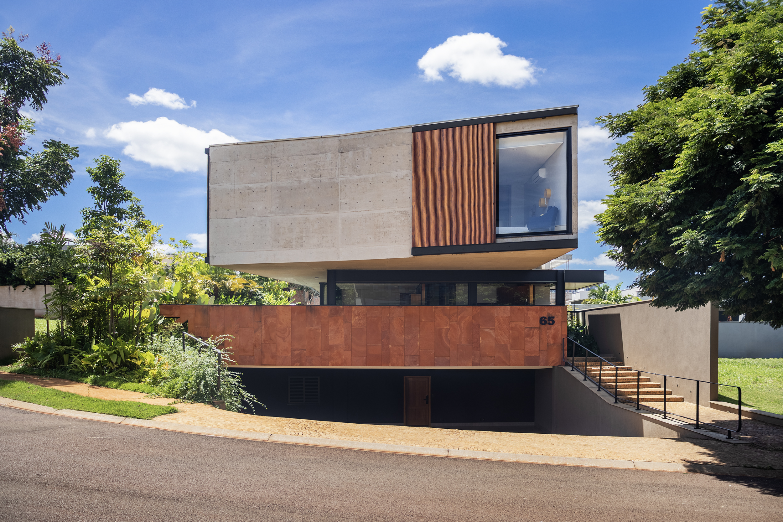 Located in Ribeirão Preto, in the countryside of São Paulo, this house occupies a plot of land with a geometry similar to that of a parallelogram with approximately 18m in front by 35m in depth. The strategy for occupying the lot aimed to create a strip built in the southern portion and an outdoor strip for the pool and backyard in the northern portion, which enjoys better sunshine conditions.
