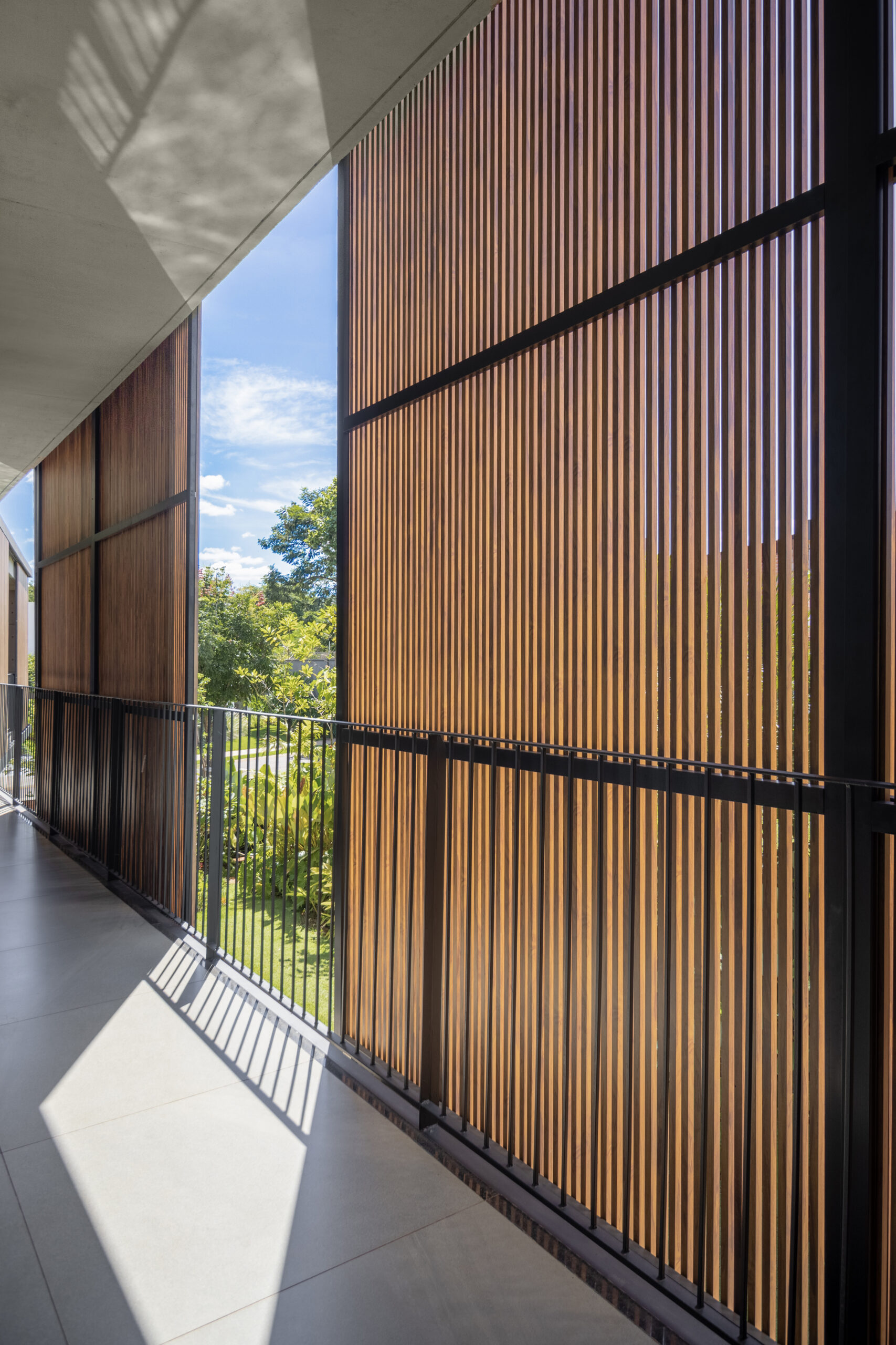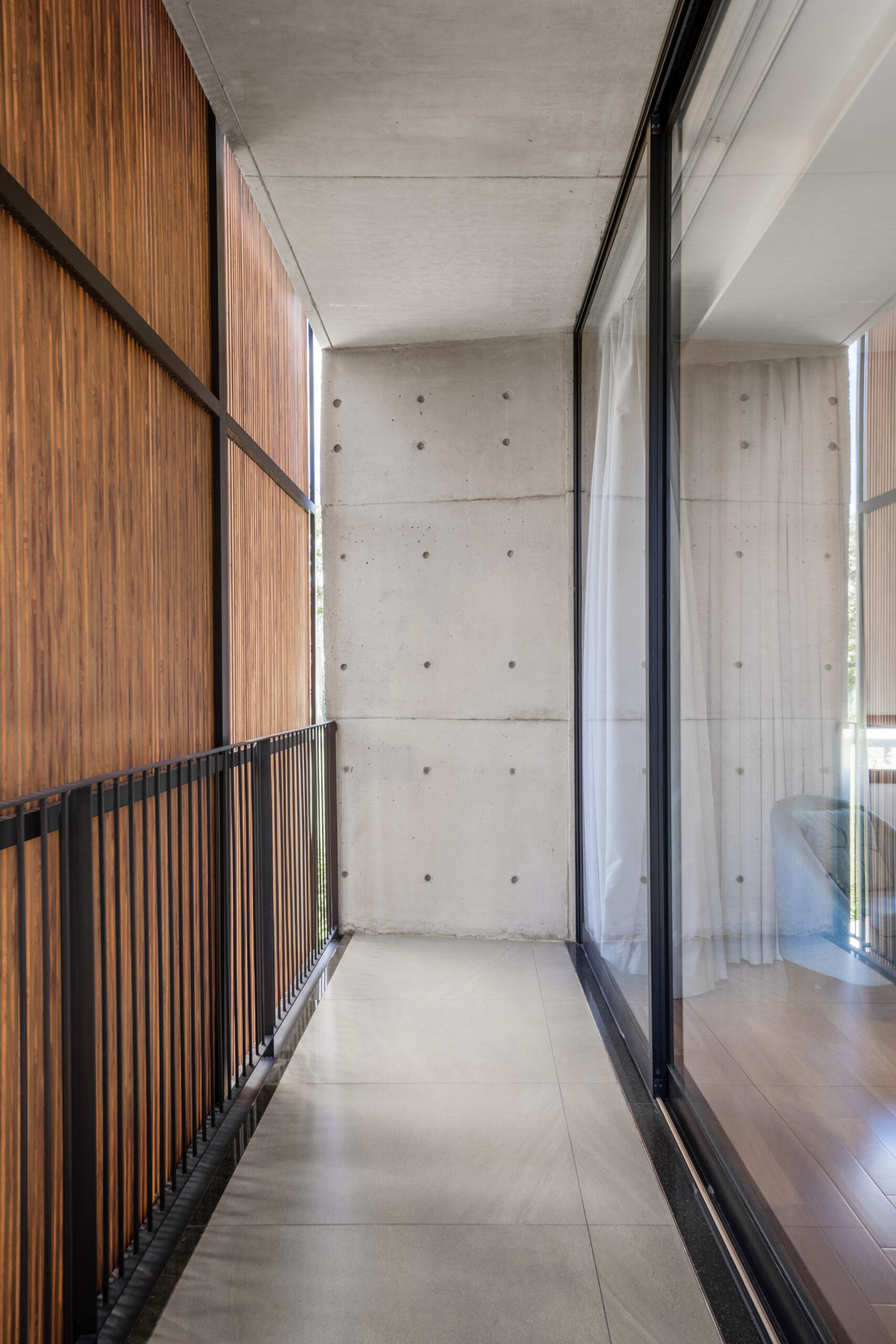 The expressive upper concrete volume houses the most intimate program consisting of the suites and television room. On the north face of this block, a long balcony protects the rooms from the most intense sunshine. The generous overhangs of the block suspended in the air also help to create shaded zones that provide pleasant living areas on the ground floor.