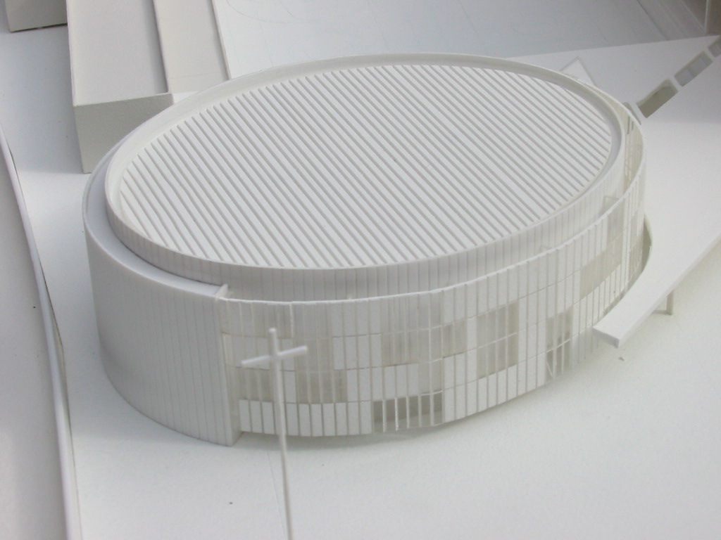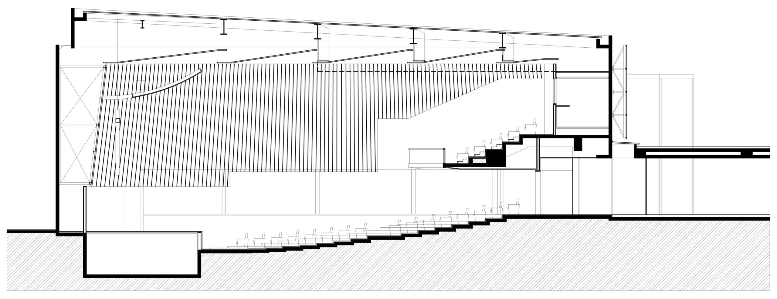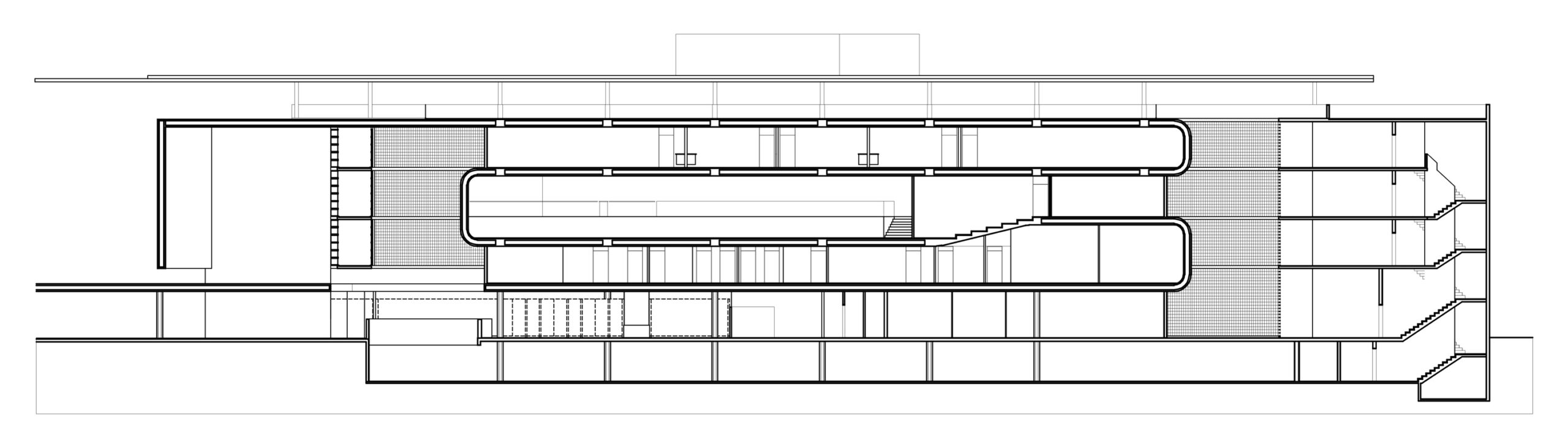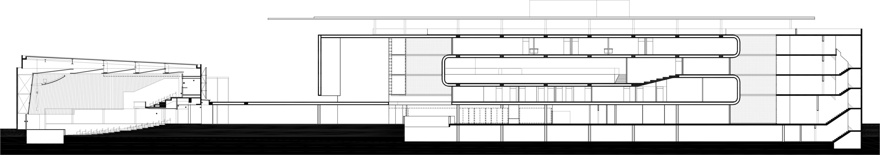A continuous slab – which rises next to the volume that incorporates the auditorium and the chapel – is originally configured as a marquee and winds through all levels of the front blade. With its rounded folds, it gives a dynamic that integrates the set and instigates the gaze.