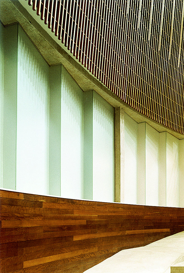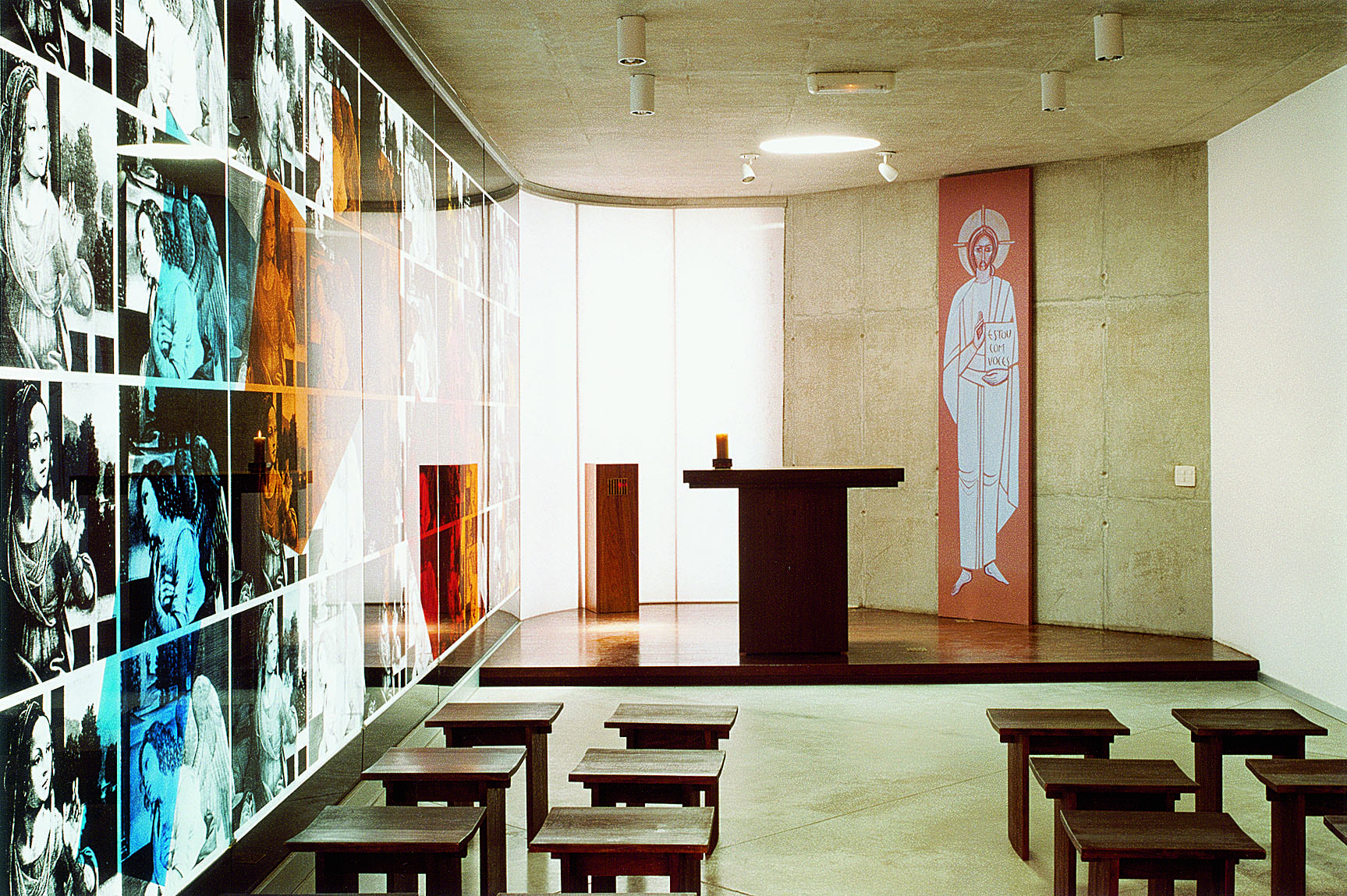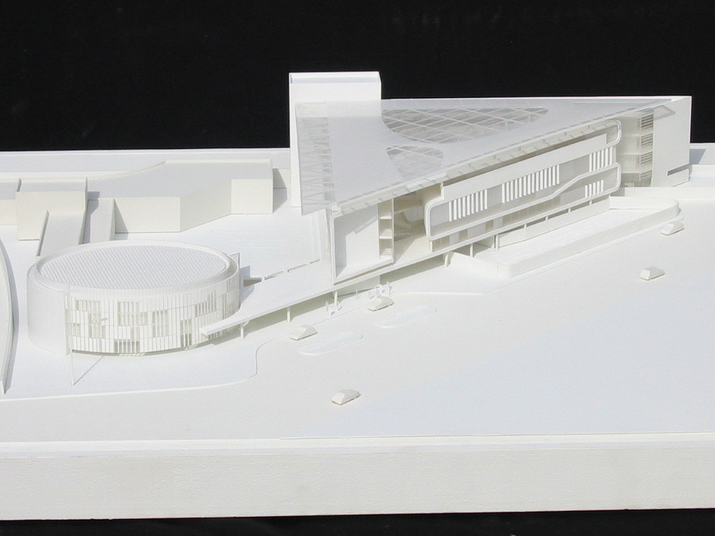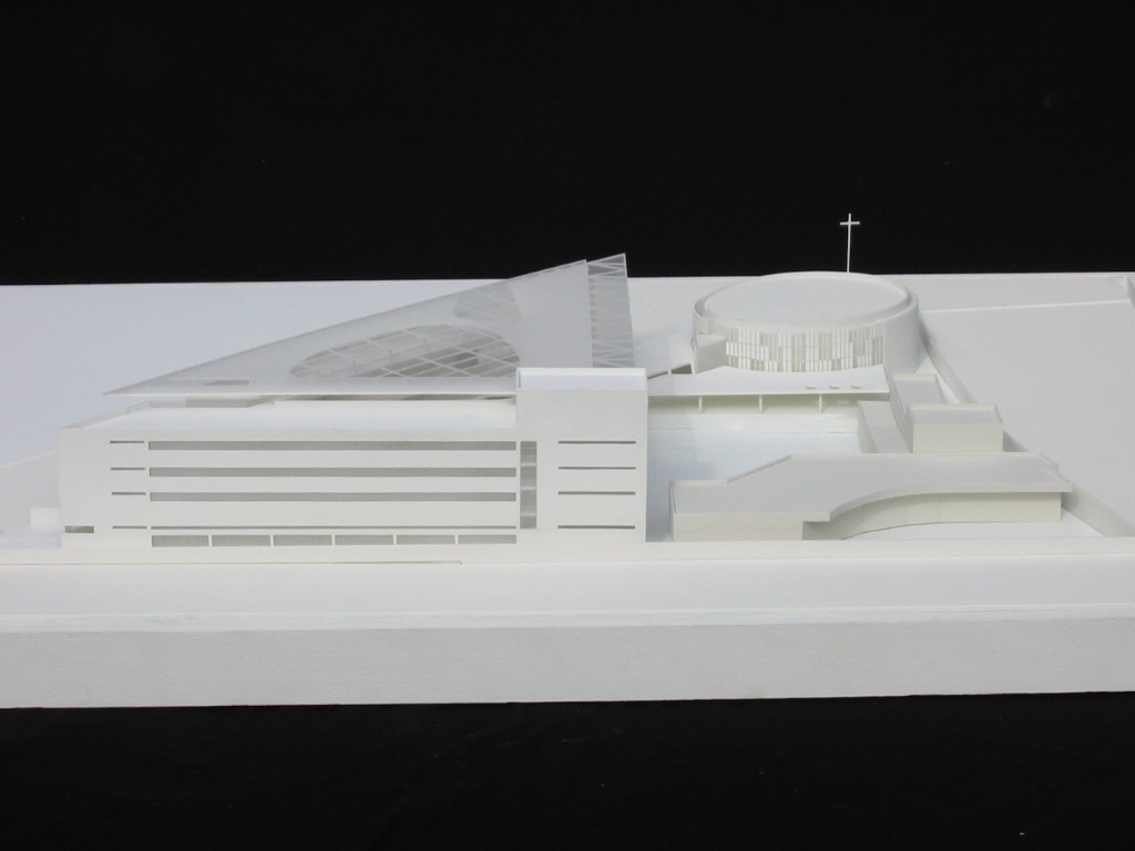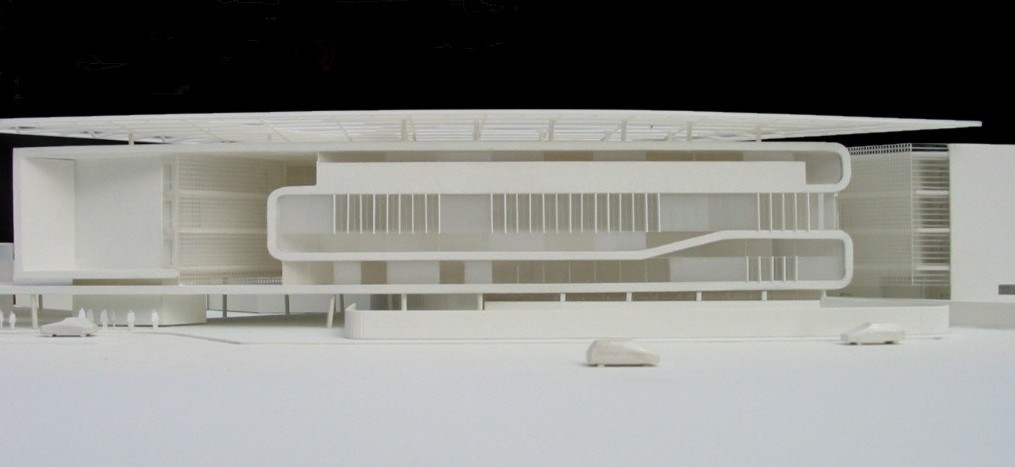 A continuous slab – which rises next to the volume that incorporates the auditorium and the chapel – is originally configured as a marquee and winds through all levels of the front blade. With its rounded folds, it gives a dynamic that integrates the set and instigates the gaze.