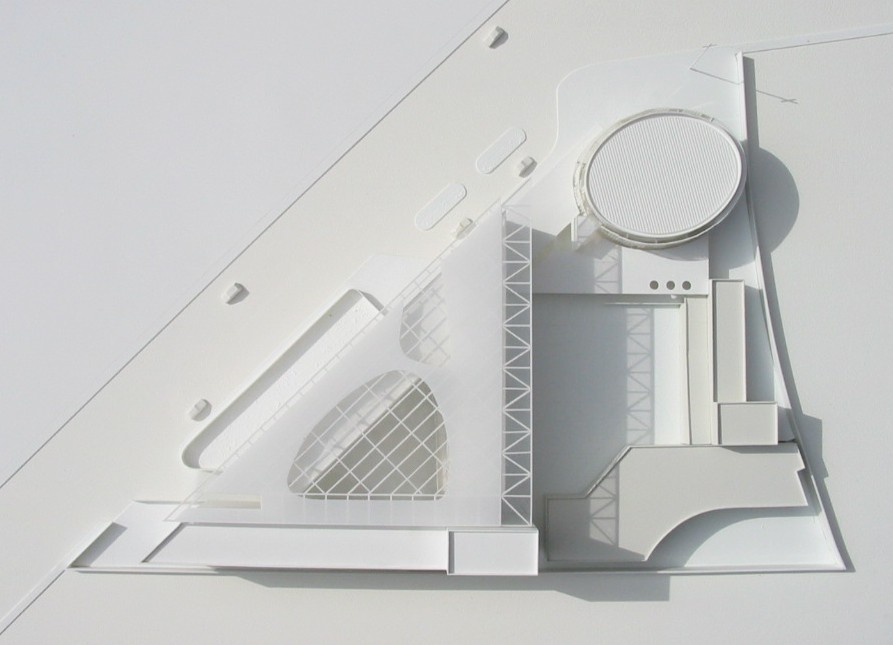 The vertices of the triangle are occupied by the horizontal connections and vertical circulations. The core of sanitary facilities, associated with the elevators, is strategically located at the internal apex.