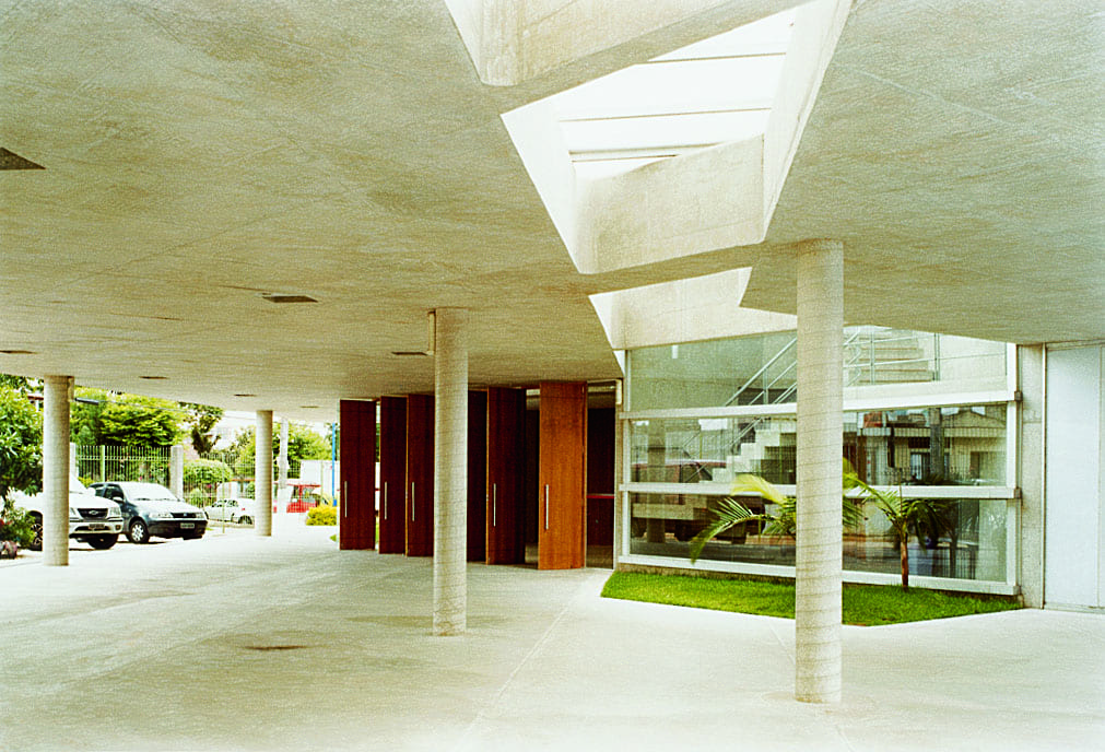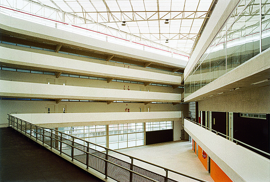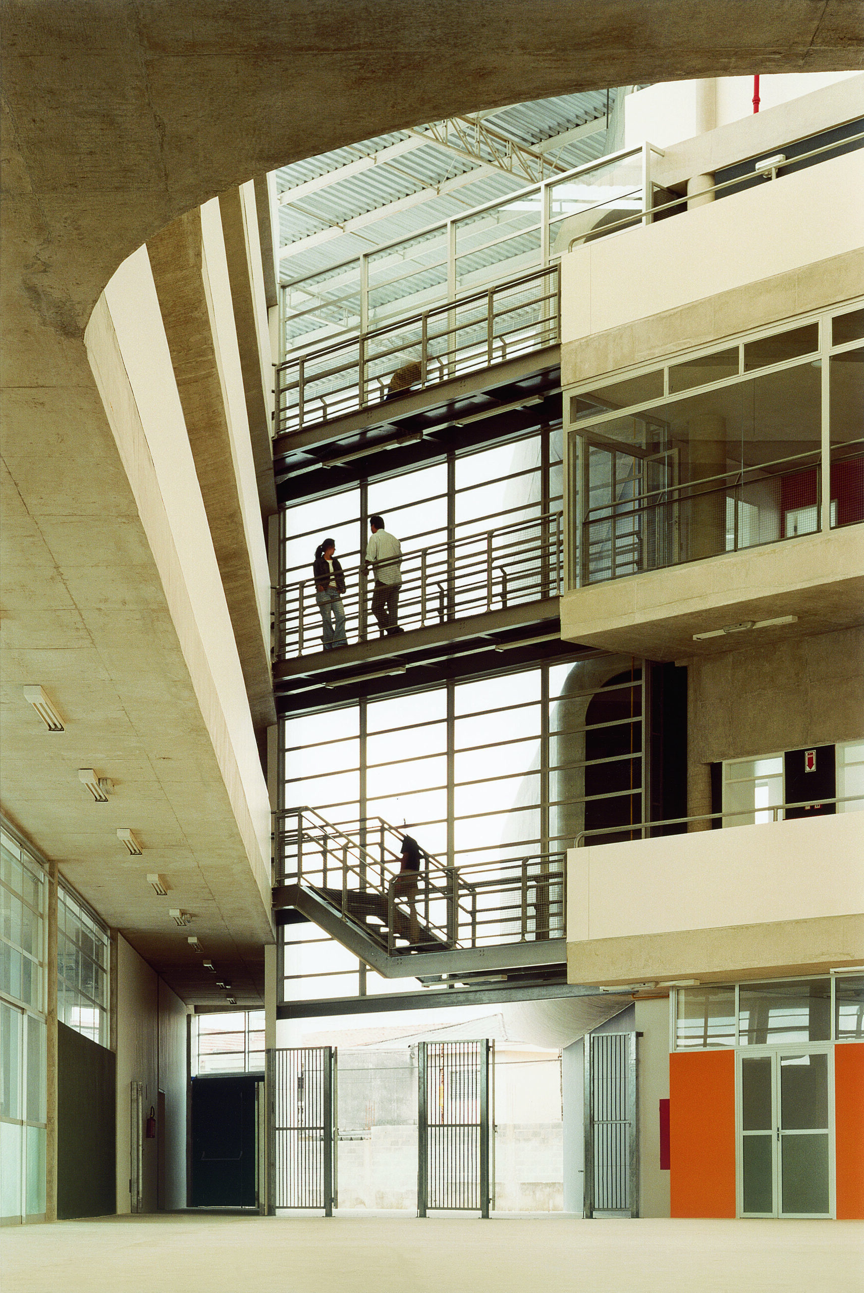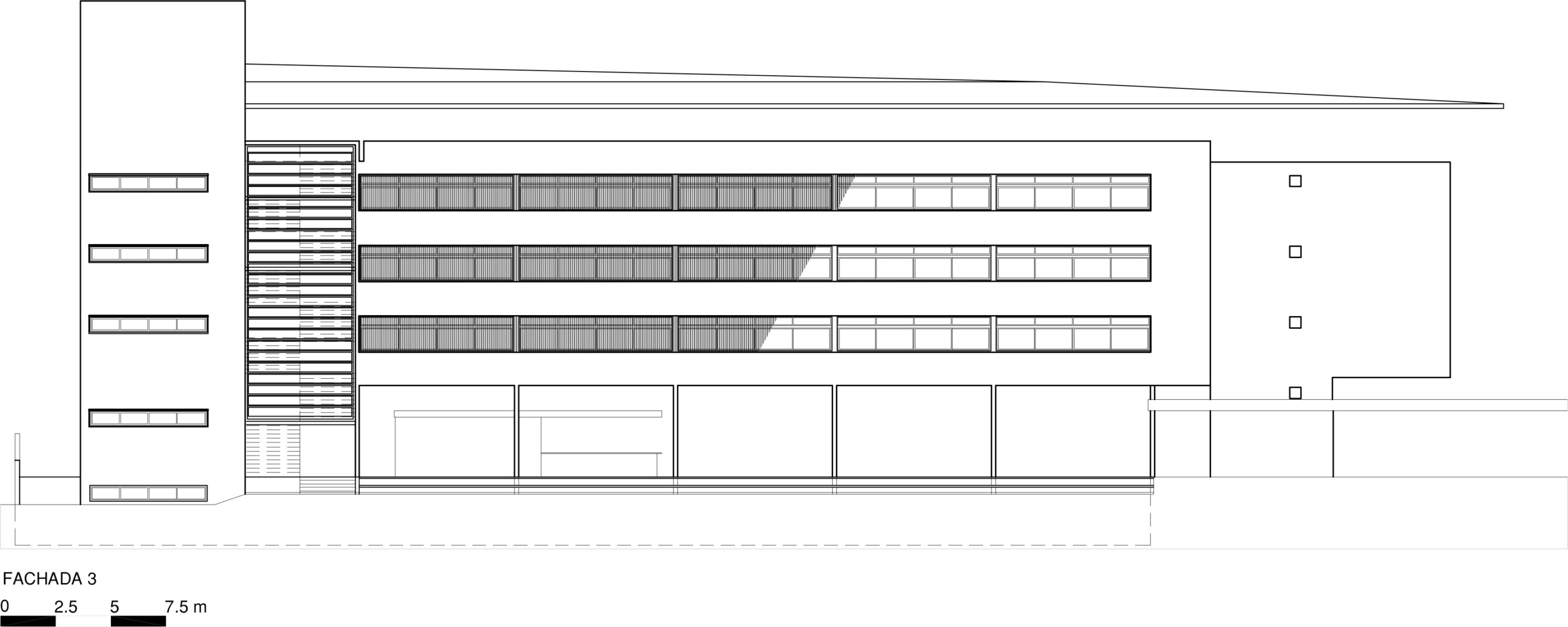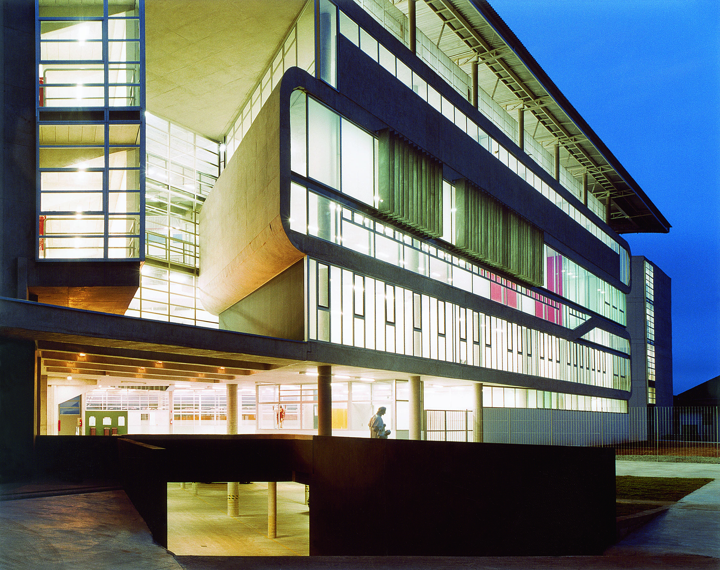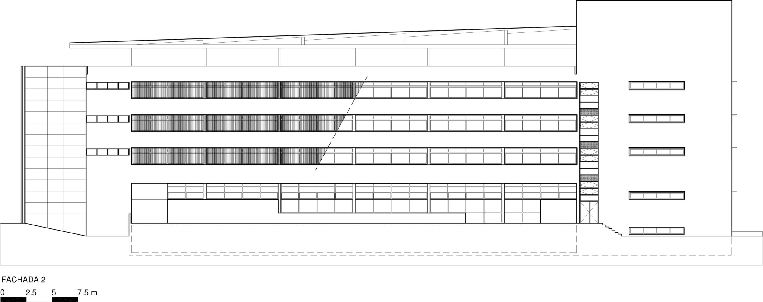 Three five-floor slats associated and unified by a light metal roof define the volume of the main body of the set. The configuration generates a central covered patio, delimited in its entire height by corridors-balconies. On the front blade, more than 50 m long, are located the library, laboratories, video rooms and administrative and pedagogical areas. This diversity of use allows working with freedom, differences in ceiling height, full and empty and a differentiated frame. The two internal slats receive the classrooms on the upper floors, thus adopting a more homogeneous and discreet resolution in the openings. On the ground floor, on the blade parallel to the boundary of the lot, are the cafeteria and the kitchen, while the other blade on pillars functions as a transition between the building and the sports courts.