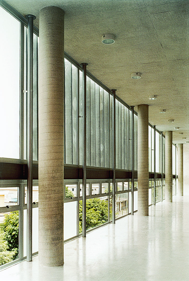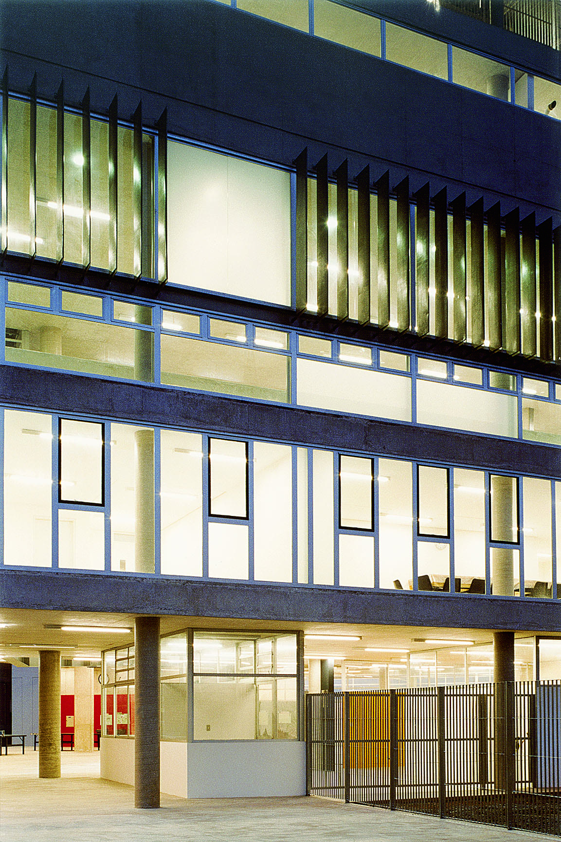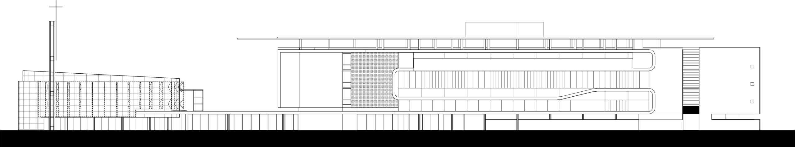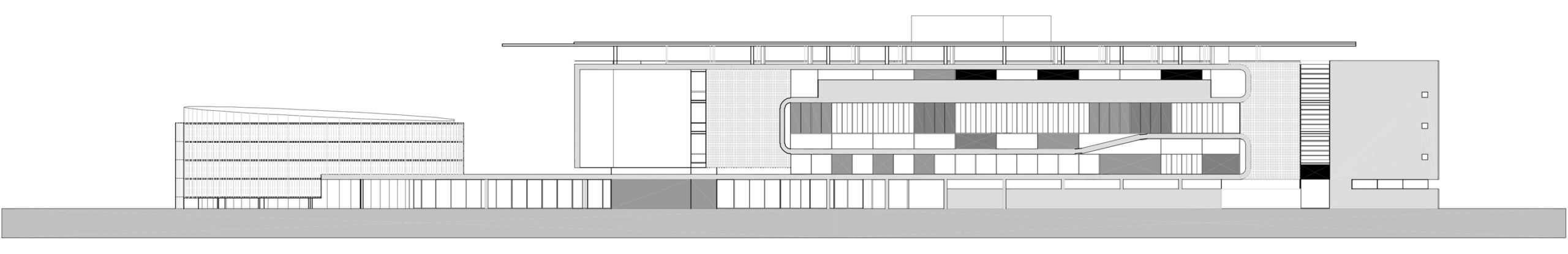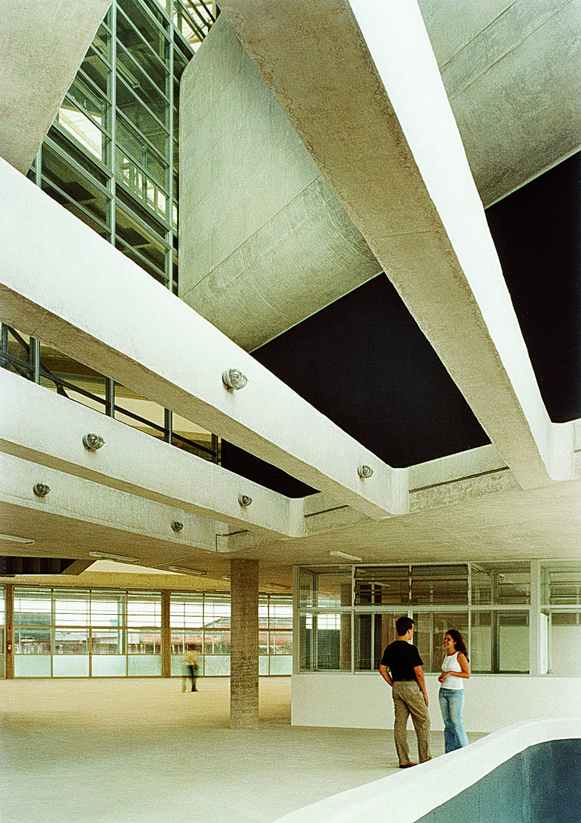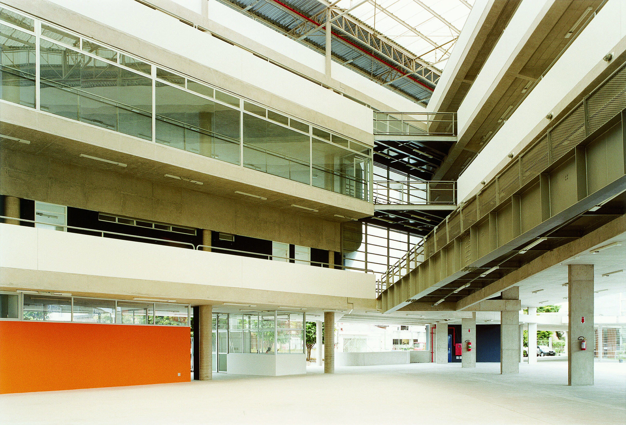 Three five-floor slats associated and unified by a light metal roof define the volume of the main body of the set. The configuration generates a central covered patio, delimited in its entire height by corridors-balconies. On the front blade, more than 50 m long, are located the library, laboratories, video rooms and administrative and pedagogical areas. This diversity of use allows working with freedom, differences in ceiling height, full and empty and a differentiated frame. The two internal slats receive the classrooms on the upper floors, thus adopting a more homogeneous and discreet resolution in the openings. On the ground floor, on the blade parallel to the boundary of the lot, are the cafeteria and the kitchen, while the other blade on pillars functions as a transition between the building and the sports courts.