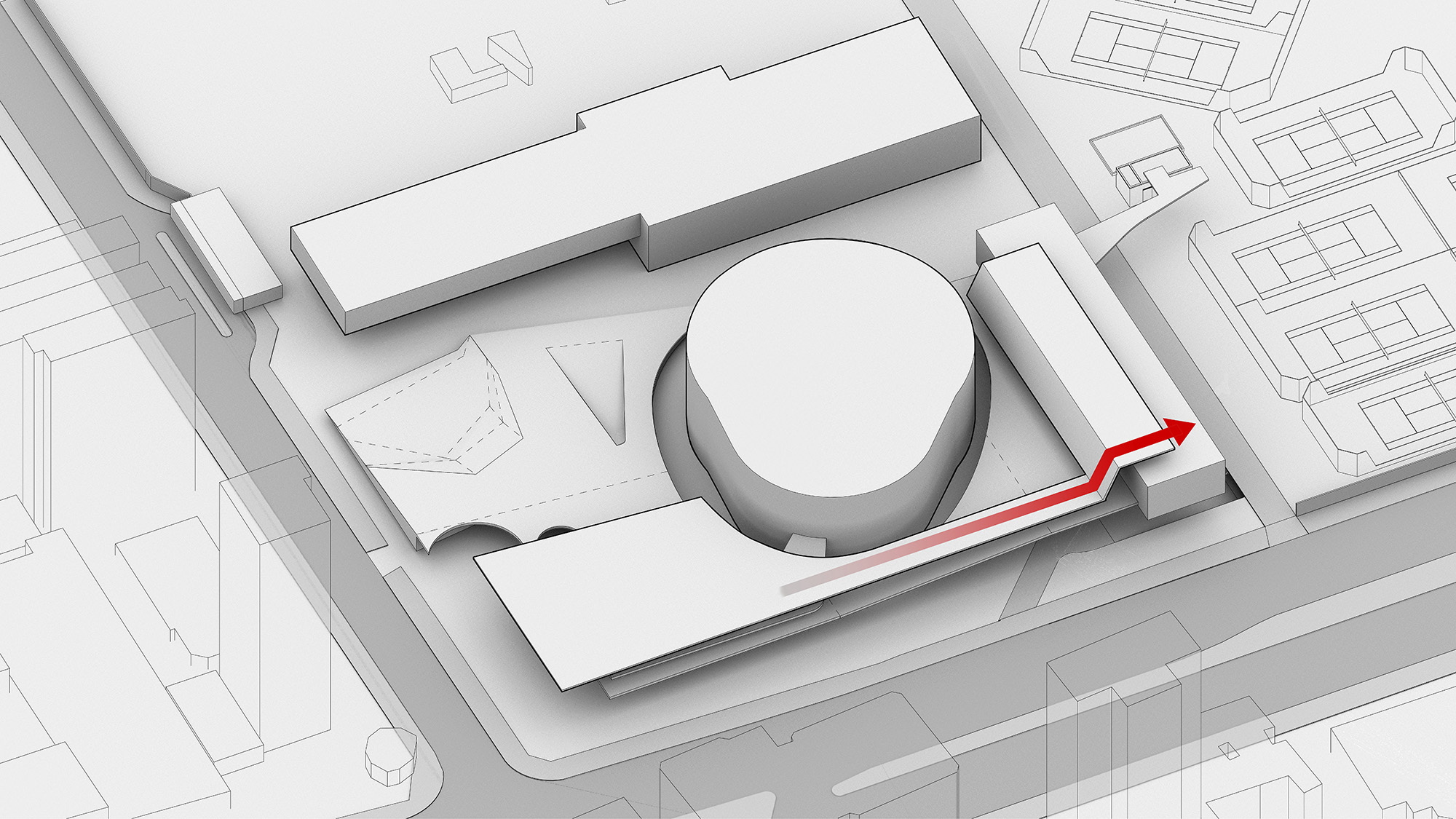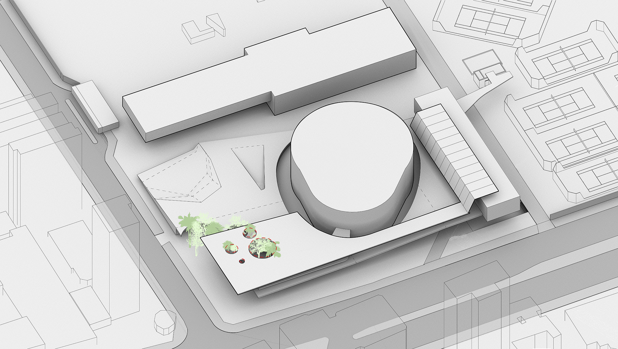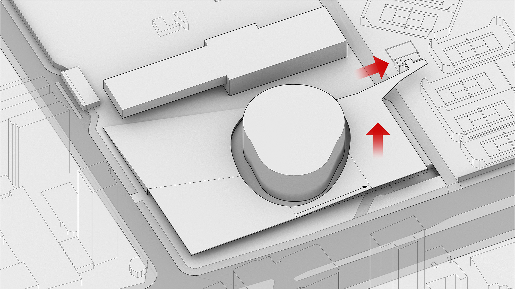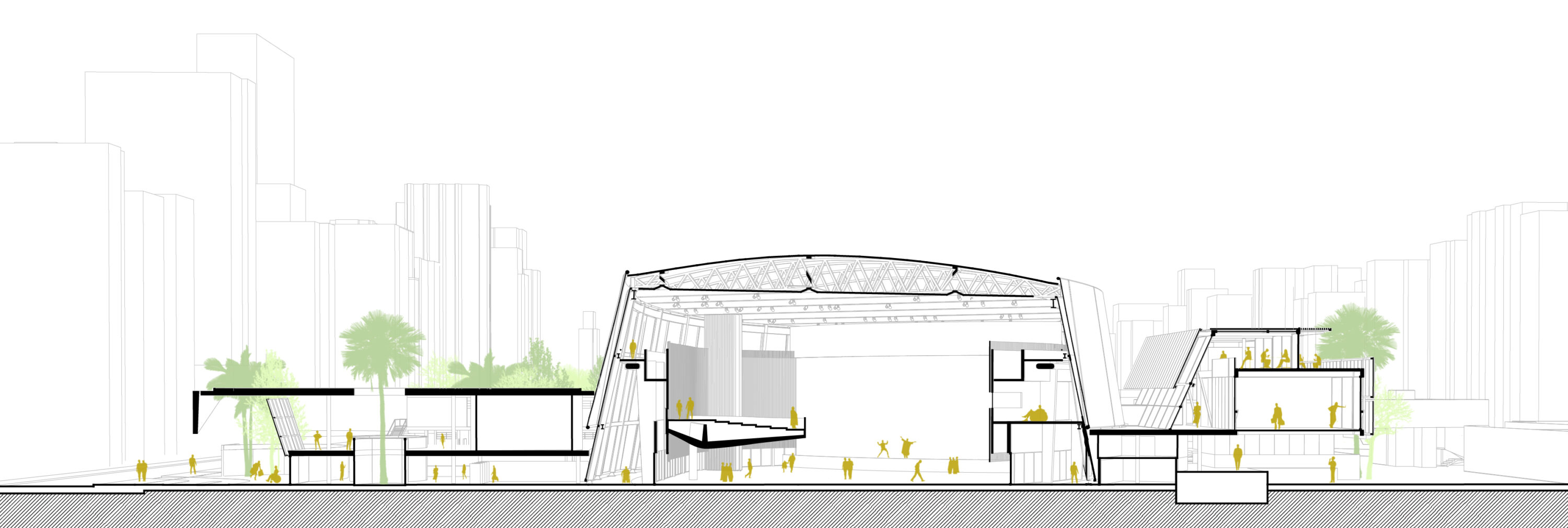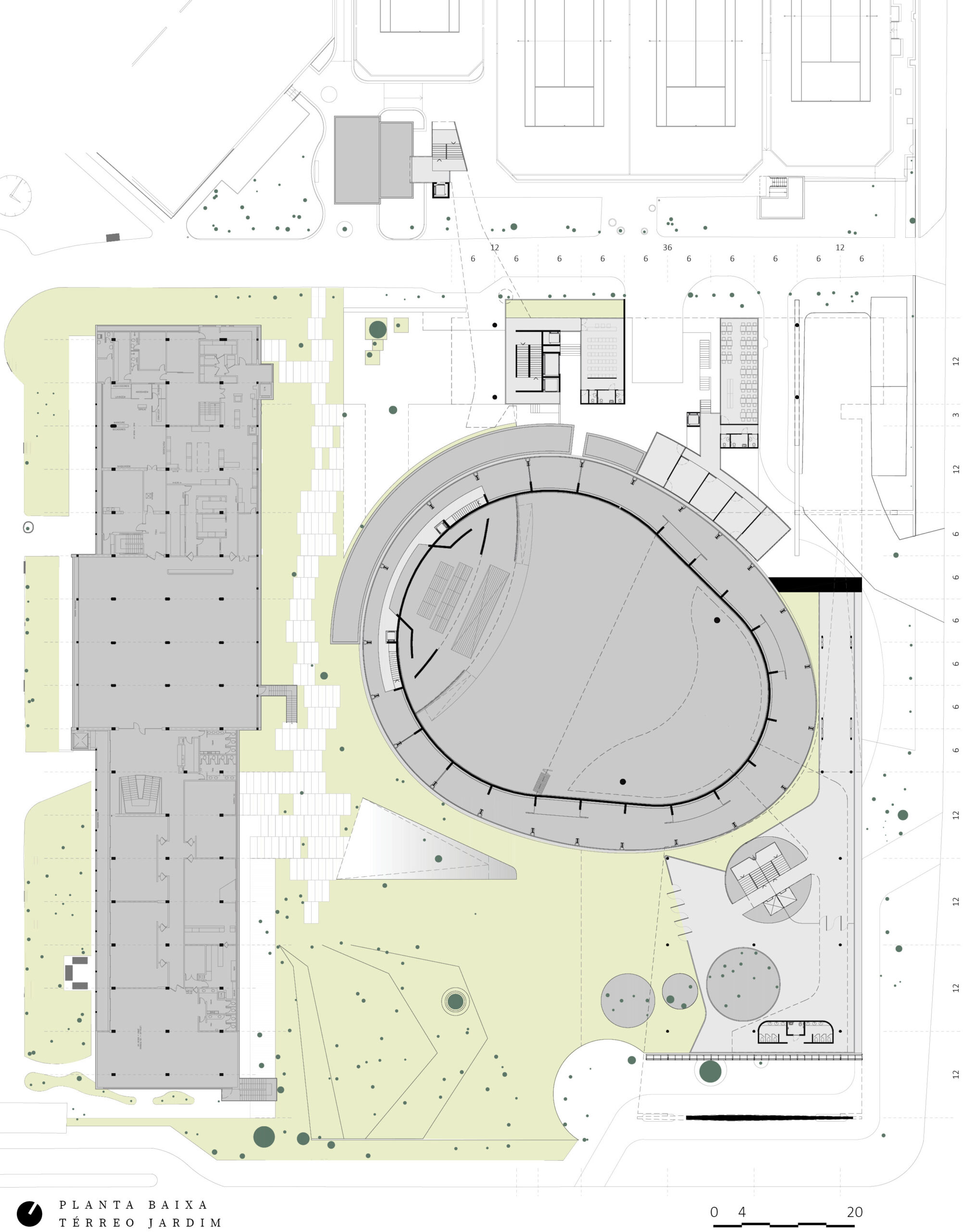 We understand that the primary function of the revitalization is to underline the semi-elliptical shape around an axis of the main nave of the hall, so that the entire support body is redesigned, reorganizing the accesses to all the additional program of events required.