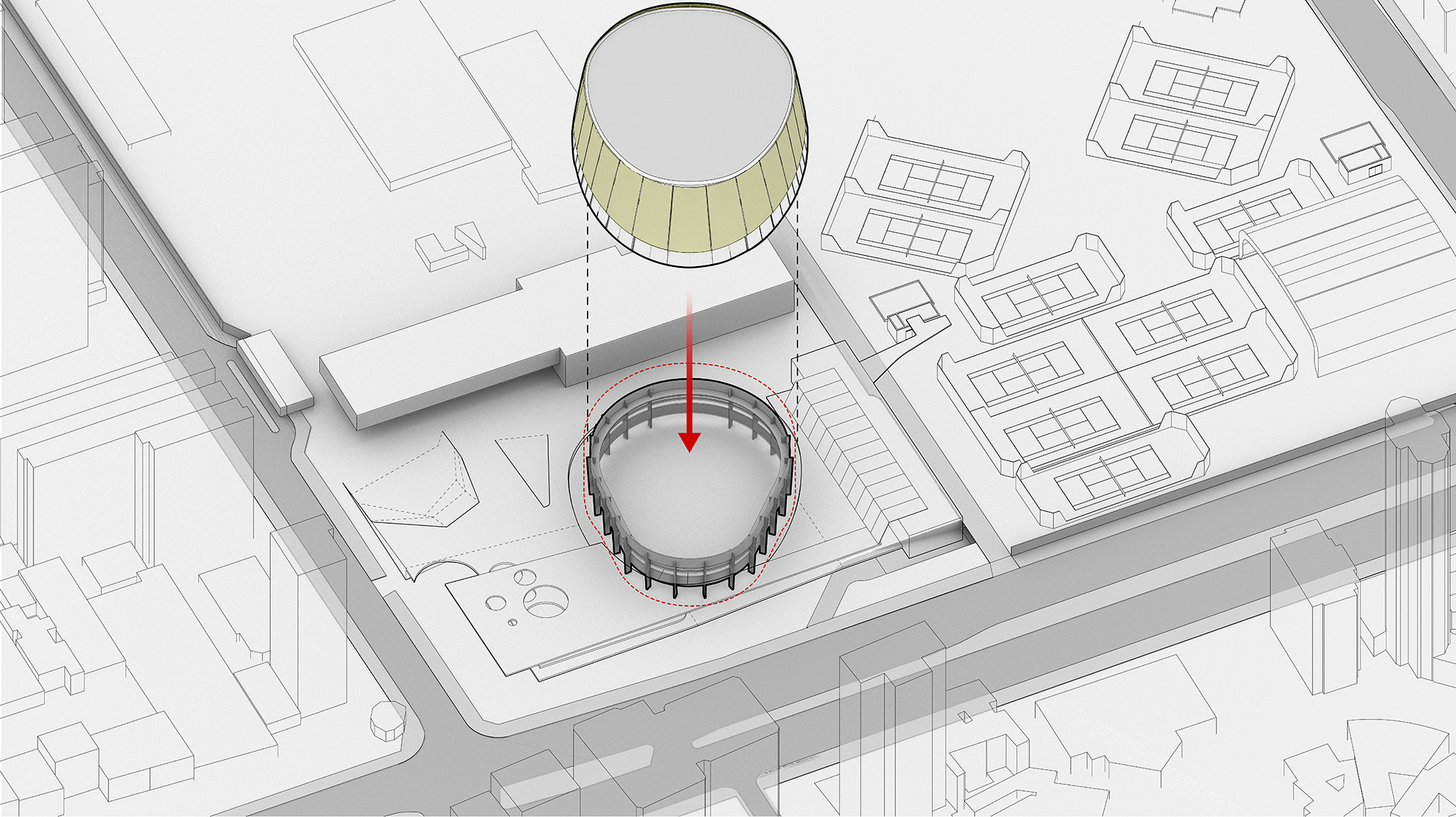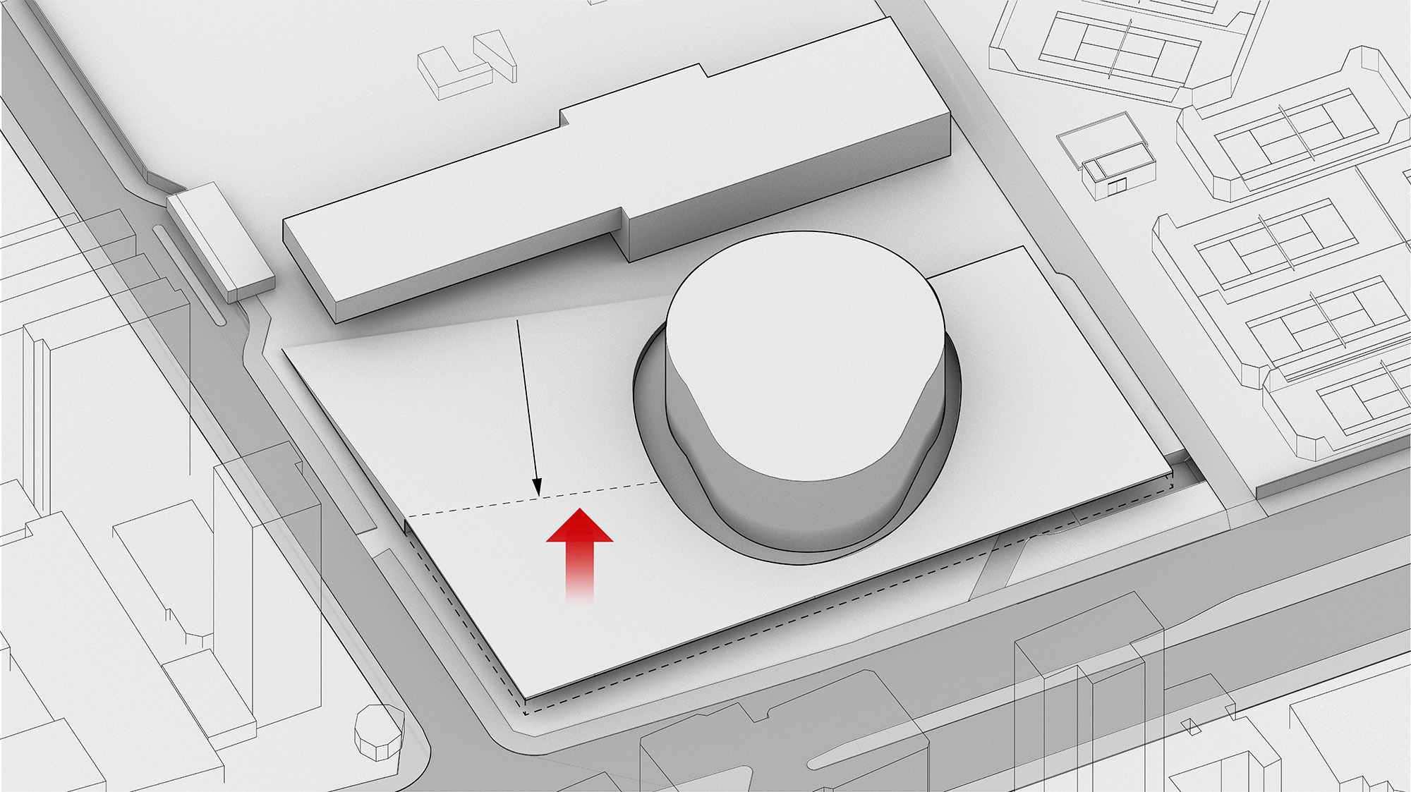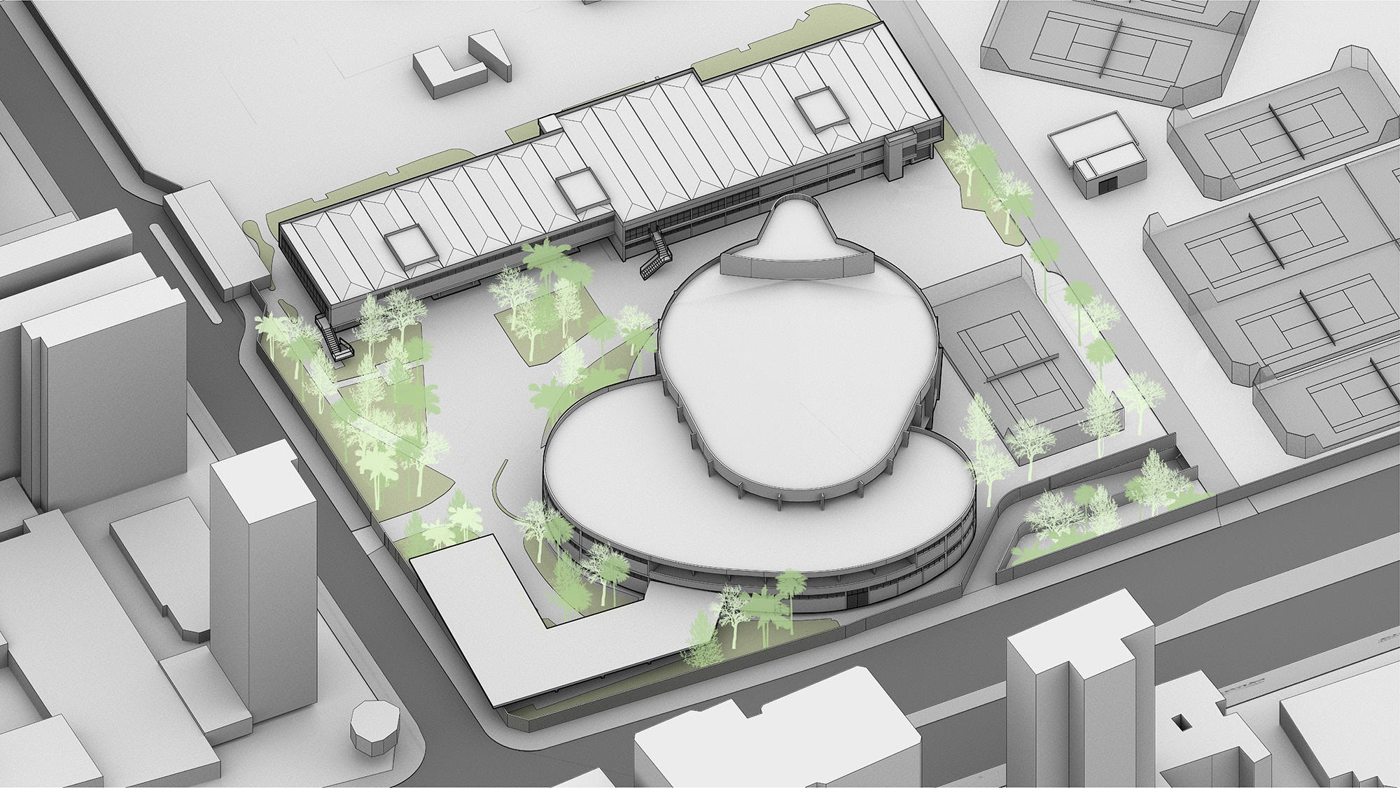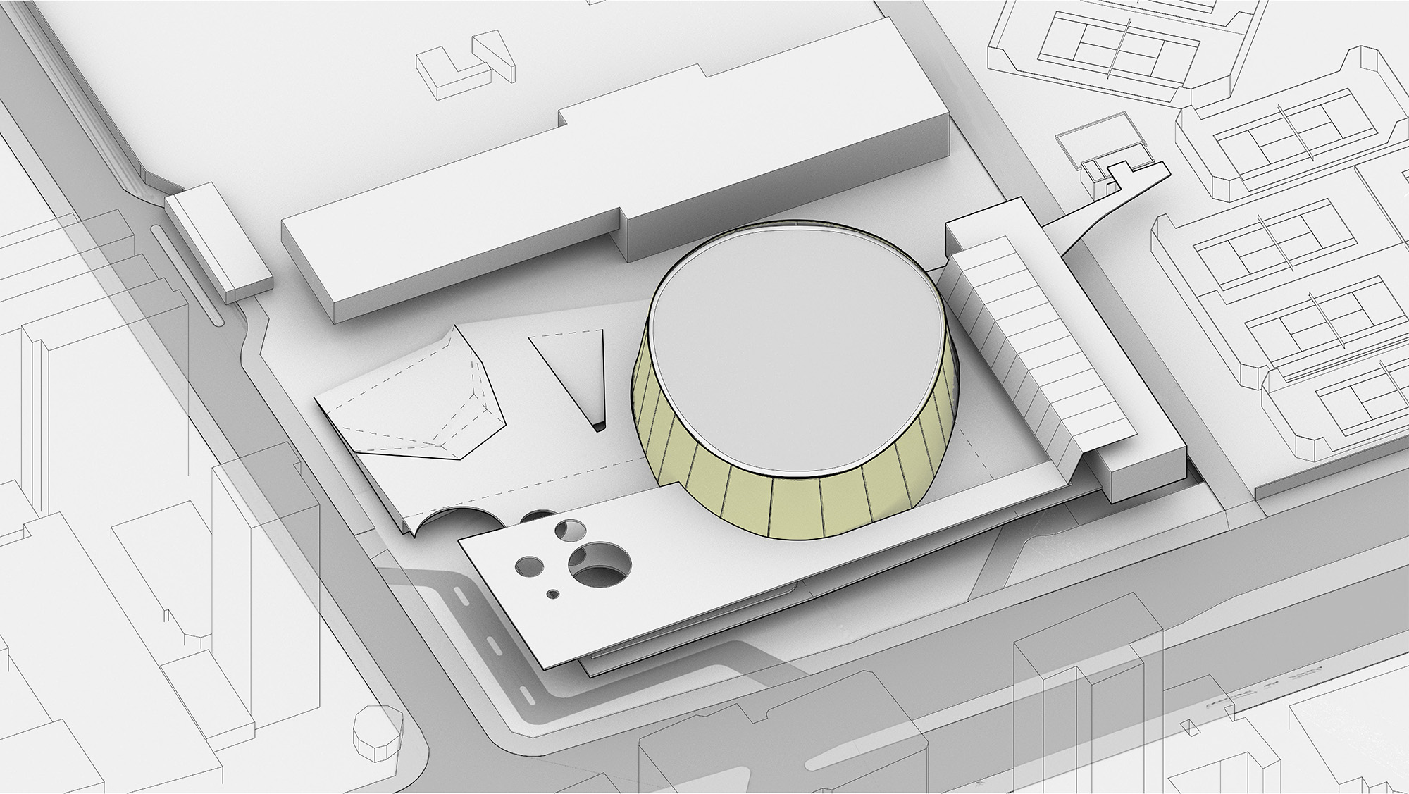 We understand that the primary function of the revitalization is to underline the semi-elliptical shape around an axis of the main nave of the hall, so that the entire support body is redesigned, reorganizing the accesses to all the additional program of events required.