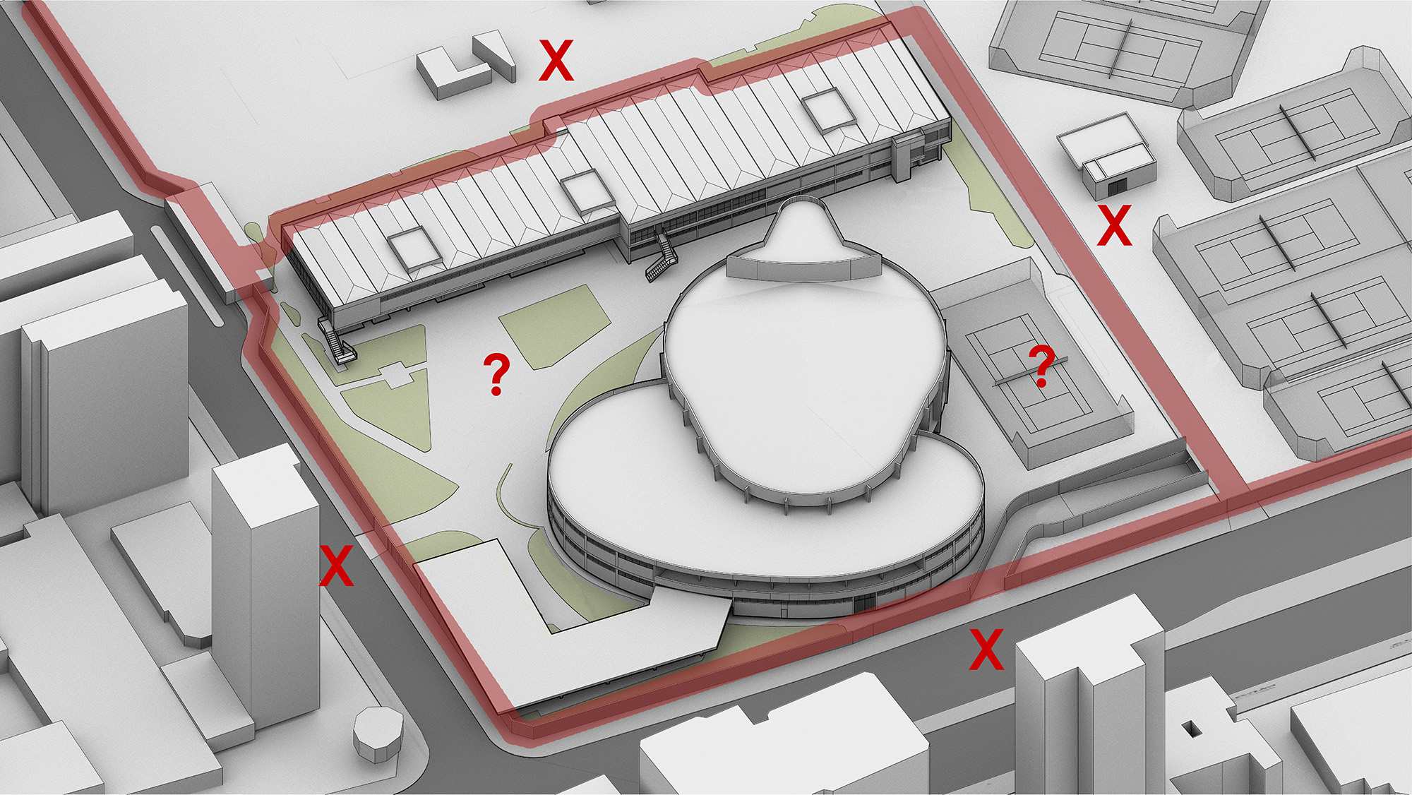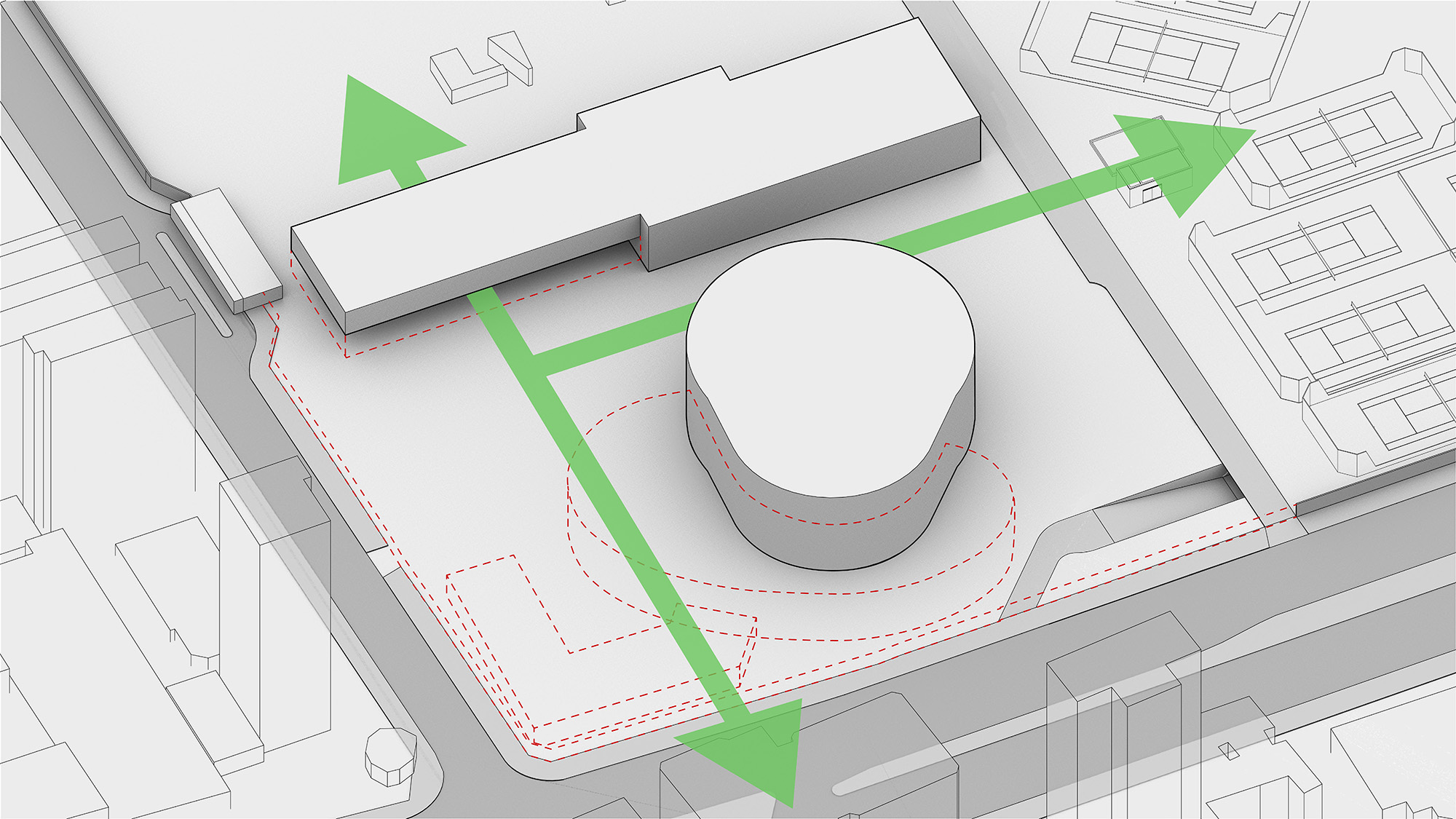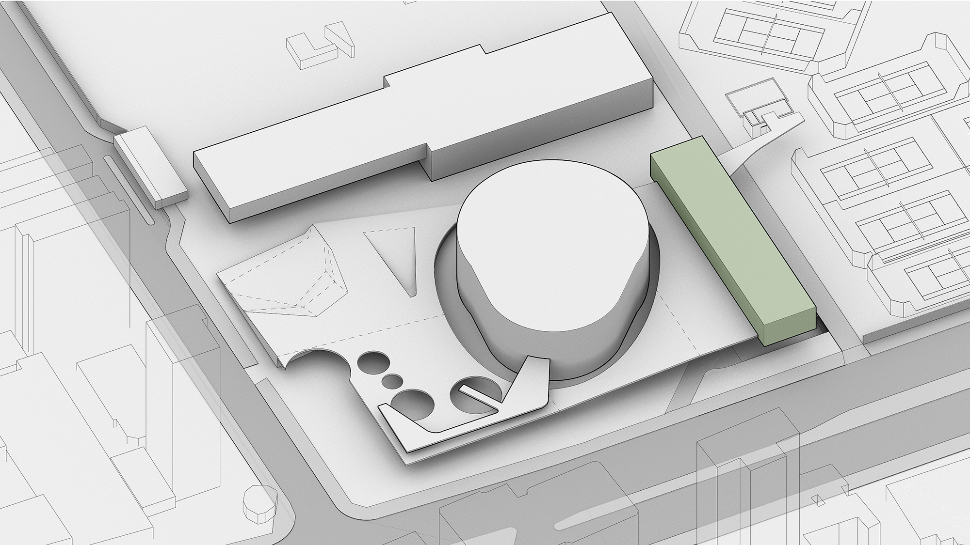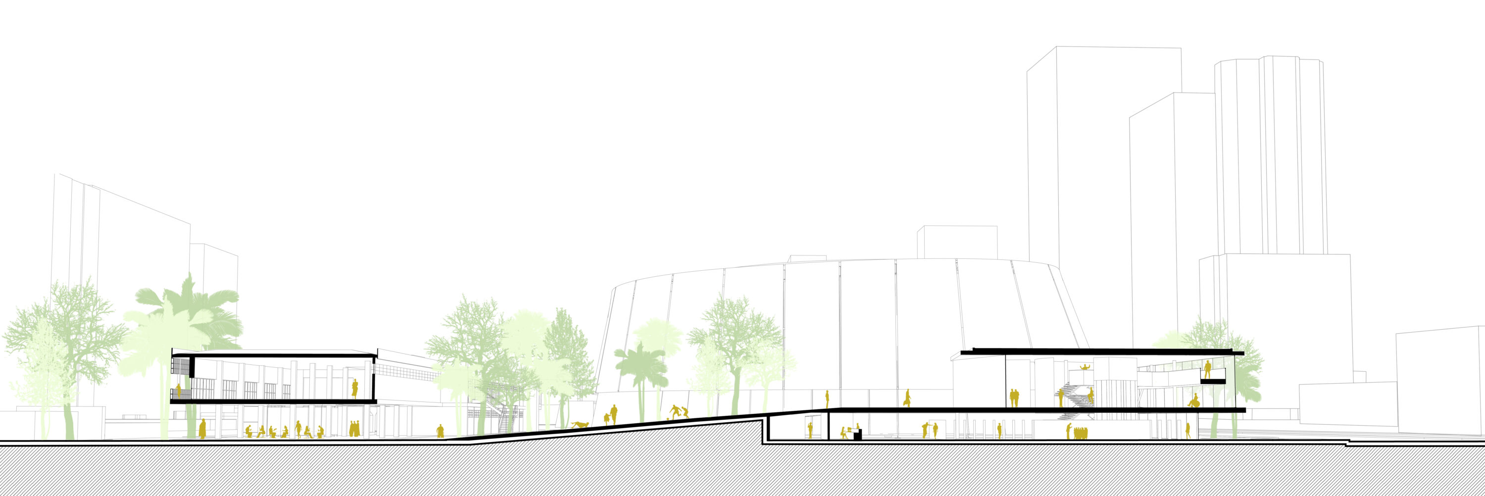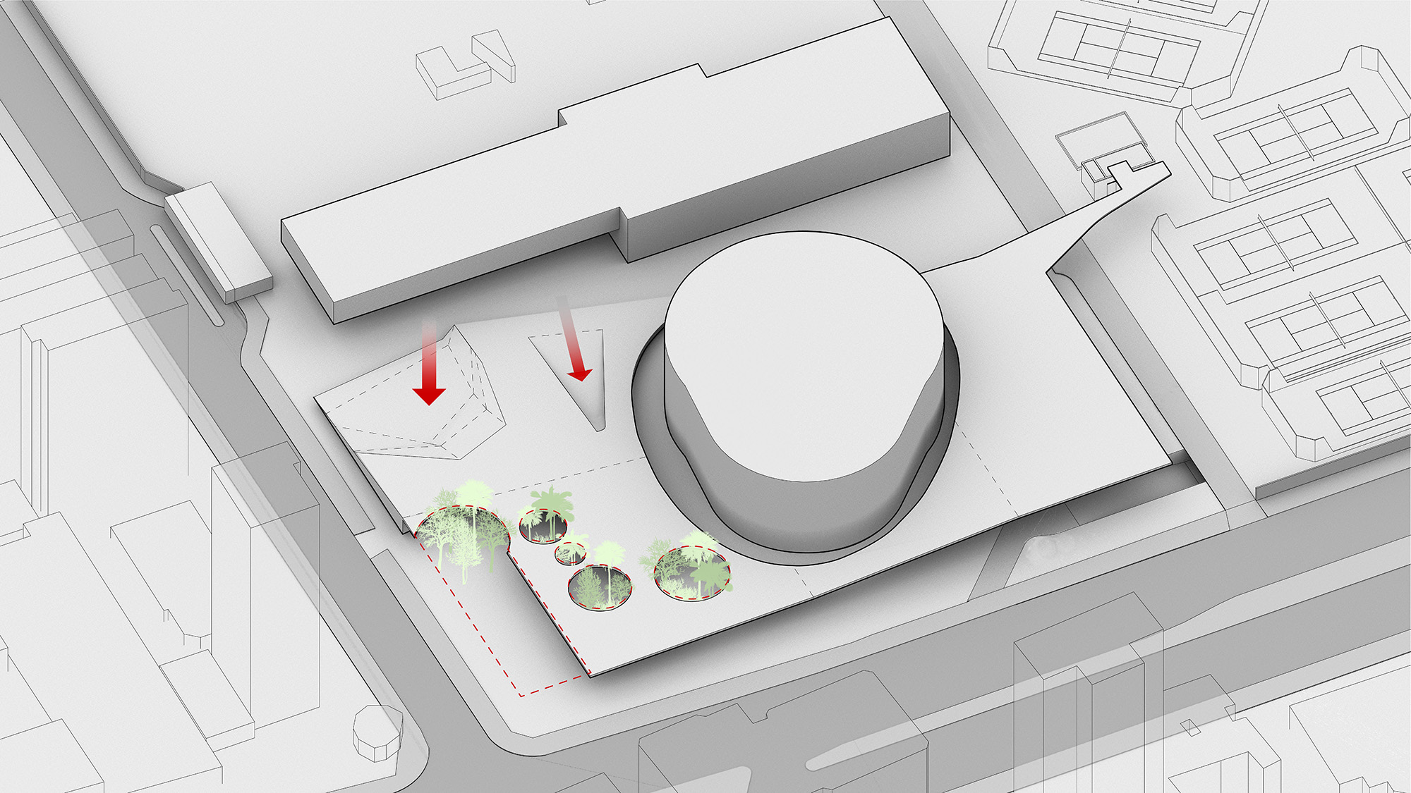 We understand that the primary function of the revitalization is to underline the semi-elliptical shape around an axis of the main nave of the hall, so that the entire support body is redesigned, reorganizing the accesses to all the additional program of events required.