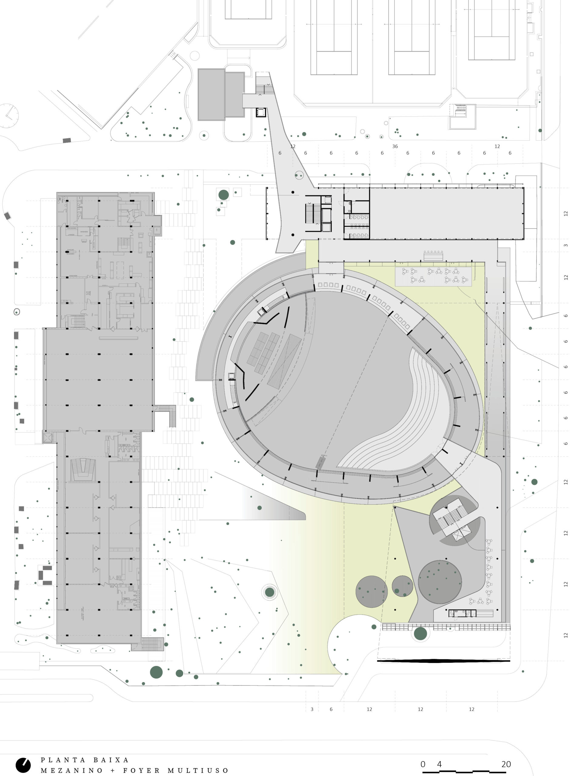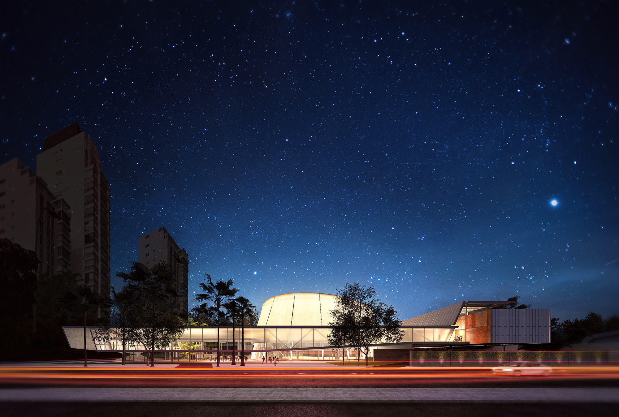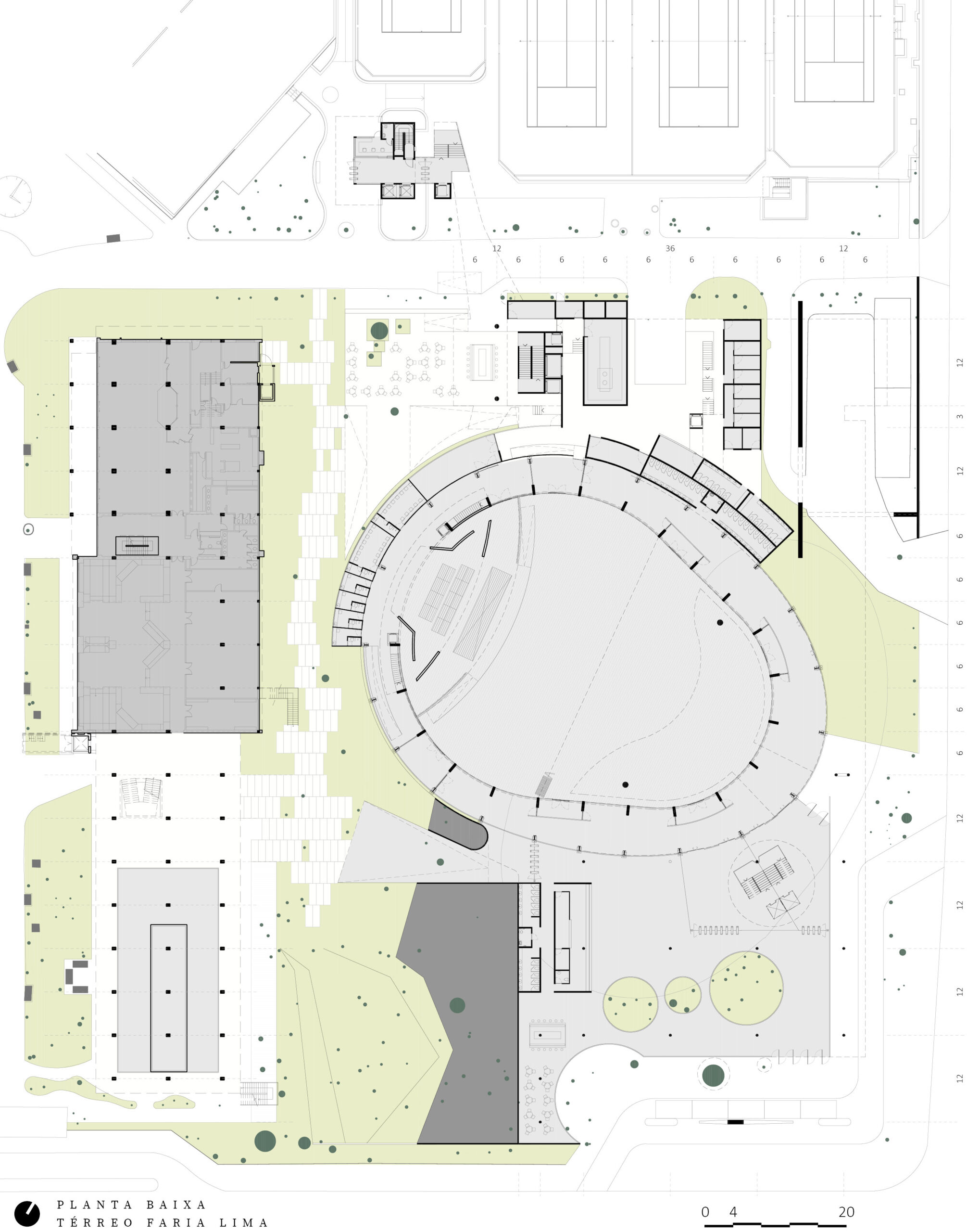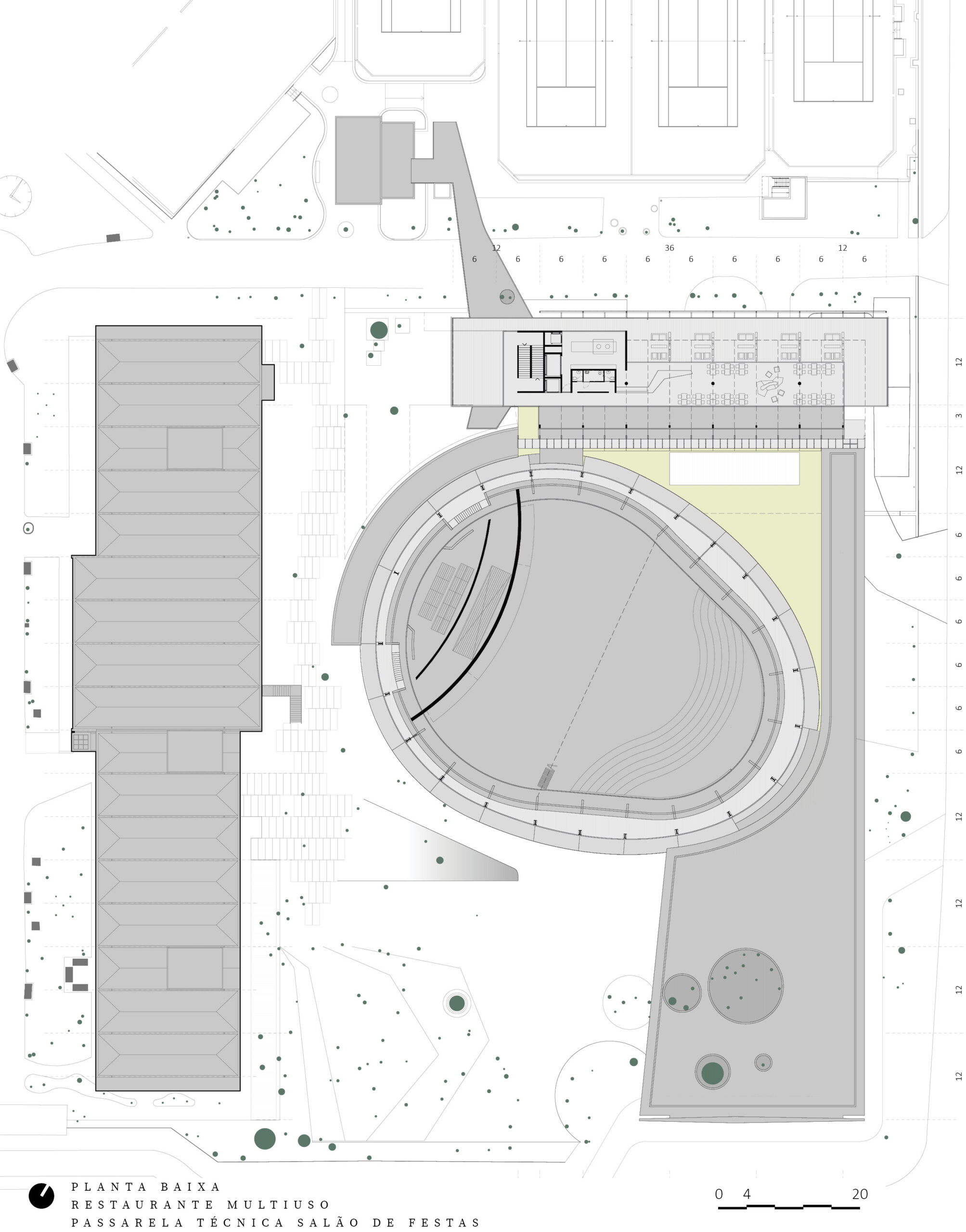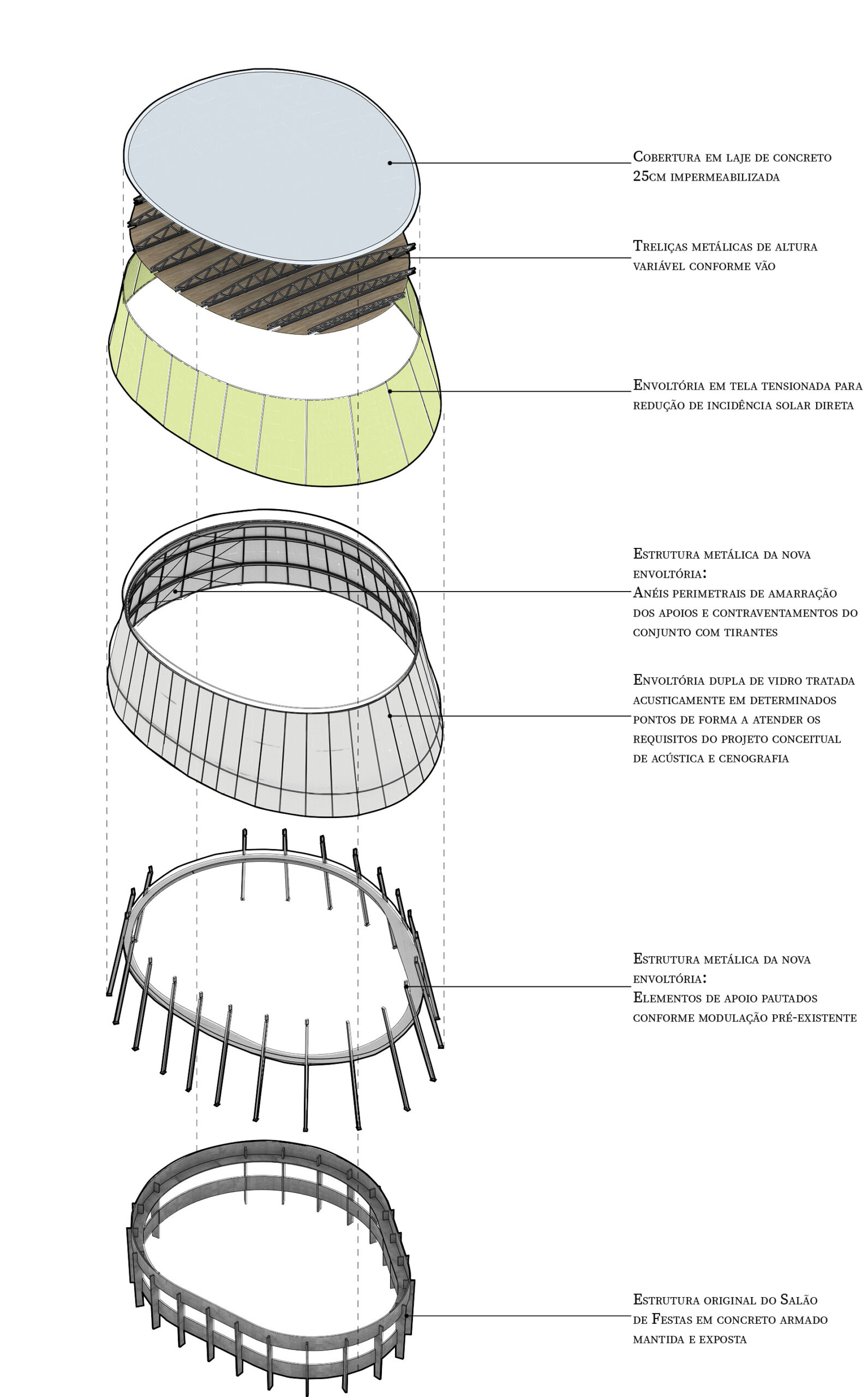 The semi-elliptical volume will have a perimeter structure executed following the modulation of the building, providing the hall with a glued laminated wood roof, referring to the memory of the original. Closing the vertical perimeter, we have a wooden closure strengthening the nave of the hall as a sign of the Faria Lima, and the gap between the closure and the illuminated roof announcing the events that will occur.