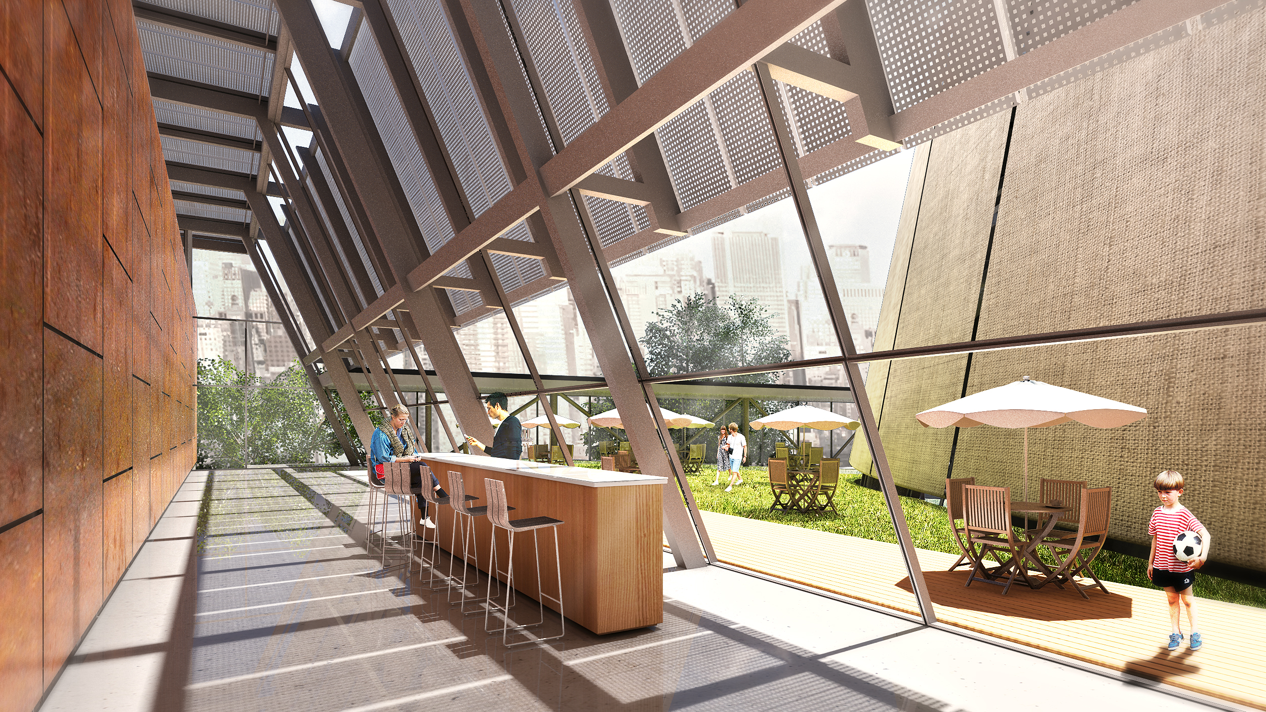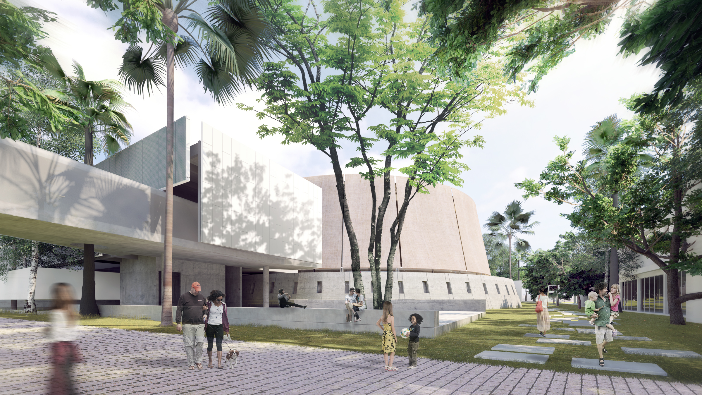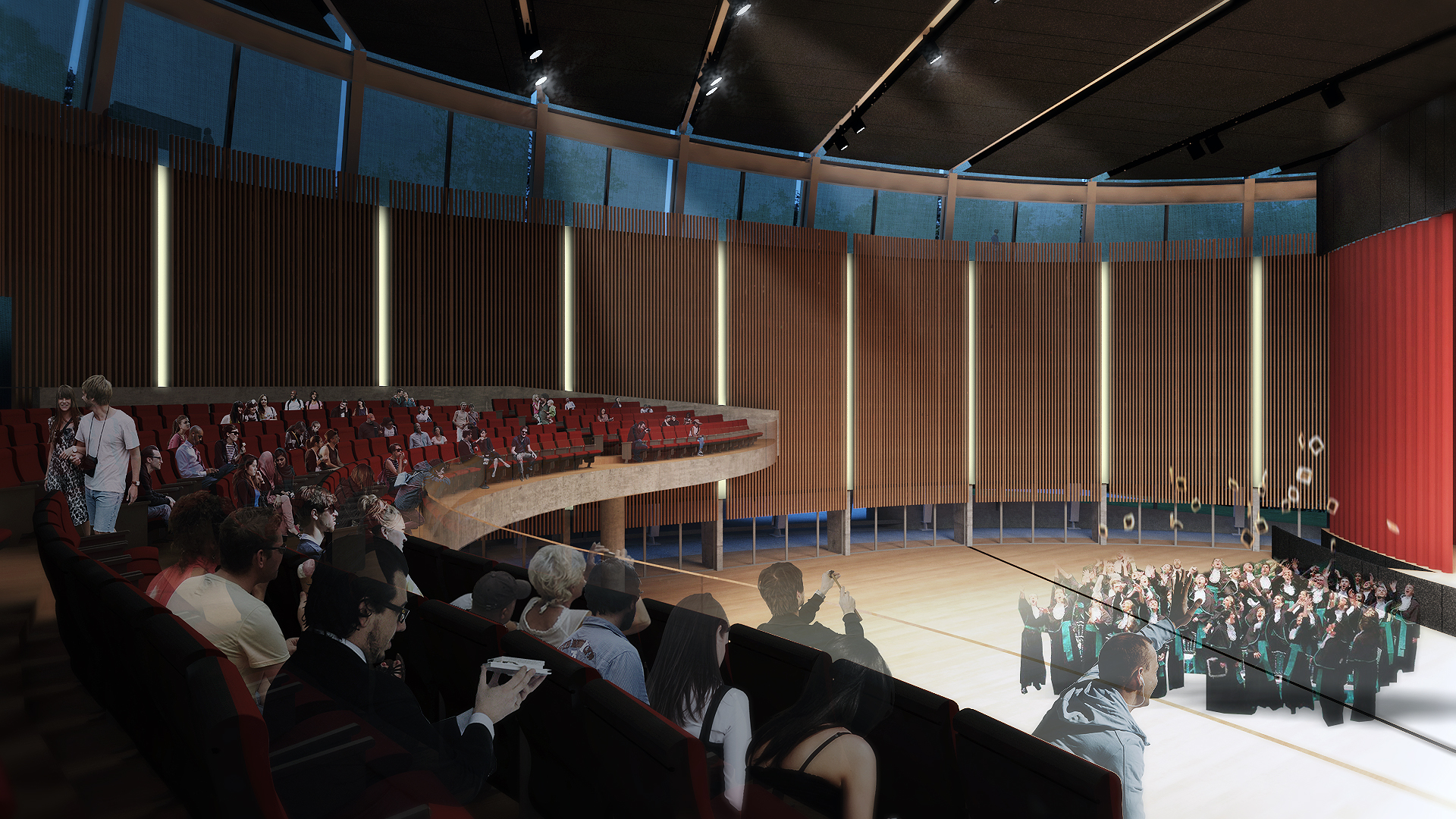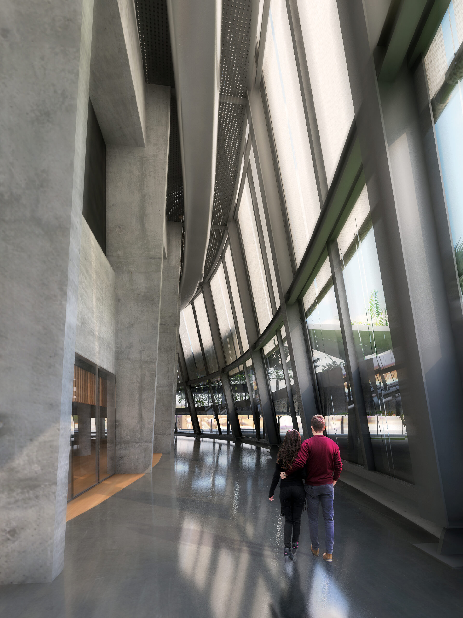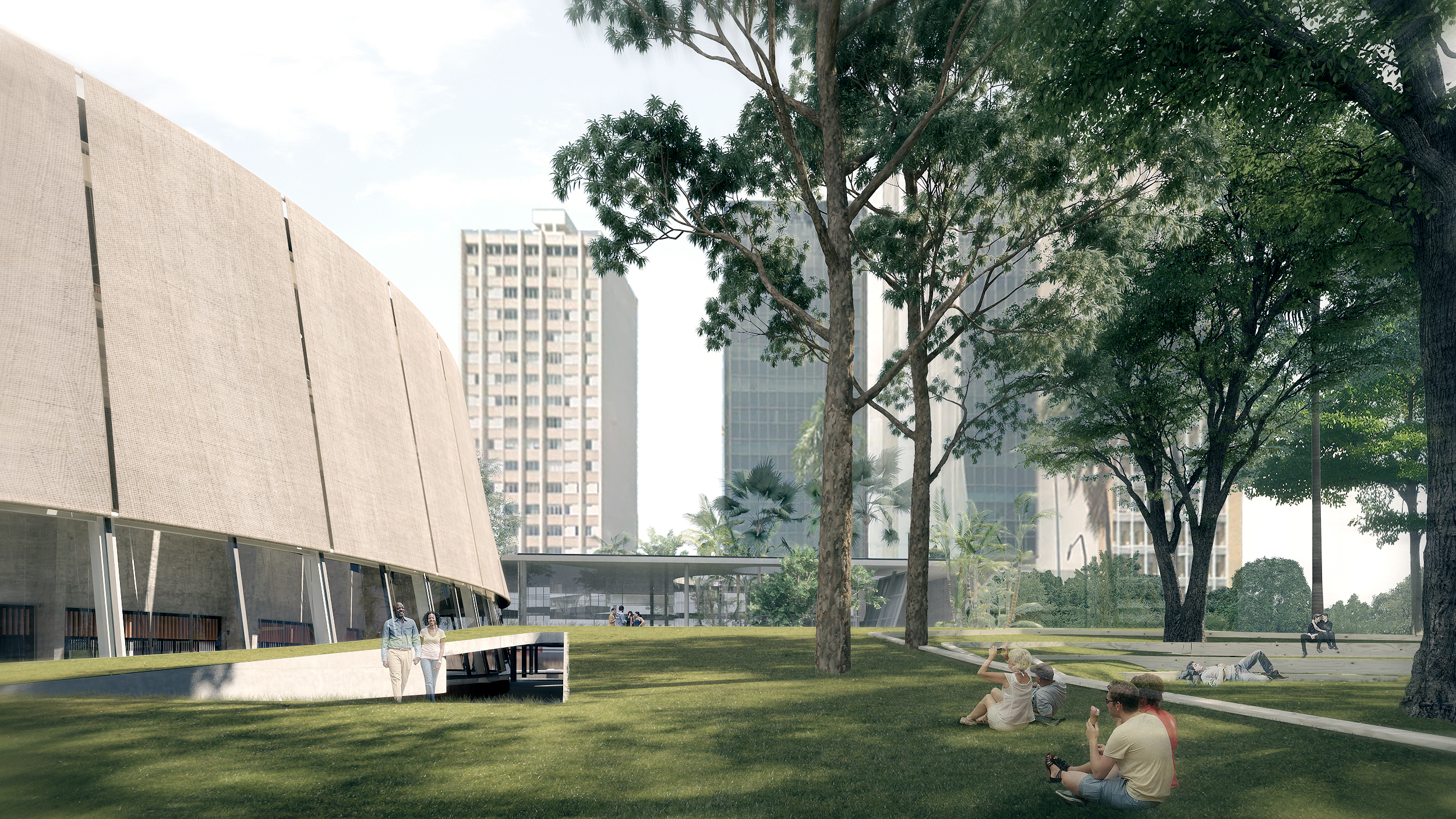 The semi-elliptical volume will have a perimeter structure executed following the modulation of the building, providing the hall with a glued laminated wood roof, referring to the memory of the original. Closing the vertical perimeter, we have a wooden closure strengthening the nave of the hall as a sign of the Faria Lima, and the gap between the closure and the illuminated roof announcing the events that will occur.