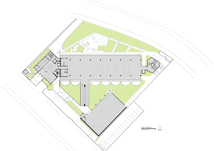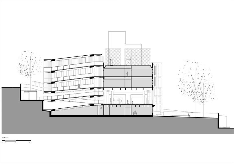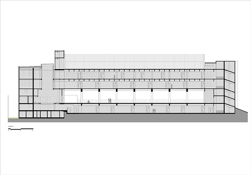 Since the building was designed as a school, in many ways the project takes advantage of certain conditions. This is the case of the covered patio, which in addition to being a desirable void in volumetry, organizes the uses; below, early childhood education with access from Mascote Avenue, above, elementary and high school, with access from Palestina Street.