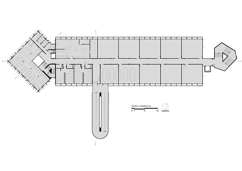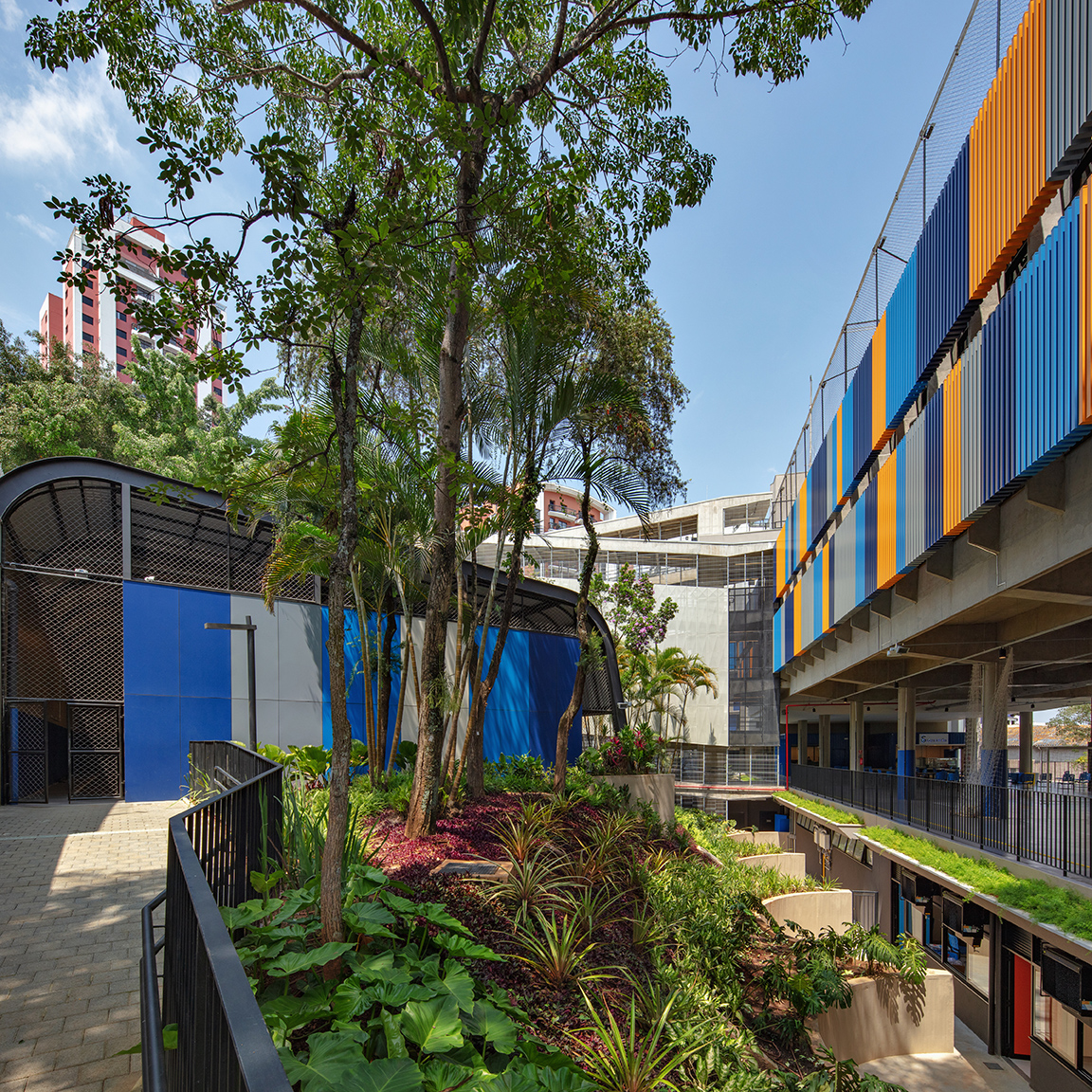 We took the use of the lot to the maximum allowed by current legislation, adding two floors to the administrative block. In this way, it was possible to accommodate the extensive program, which goes from kindergarten to high school. In this block, with a square plan, the central void was expanded, flooding all its floors with natural light.