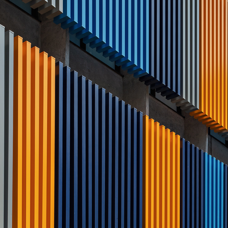 The chromatic project, which extends from the facades to the internal environments, including visual communication, unifies the blocks and establishes the visual identity of the educational institution.