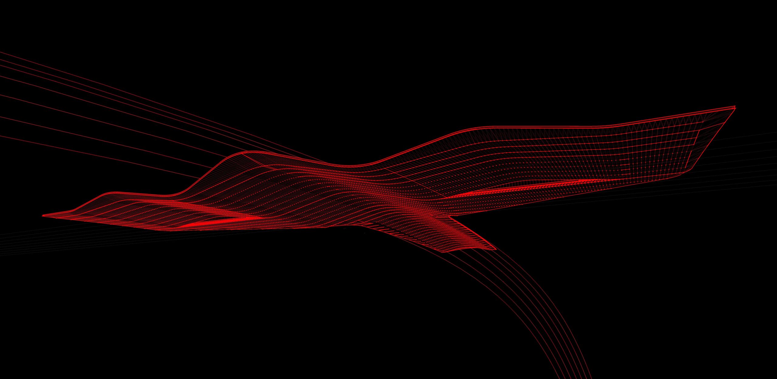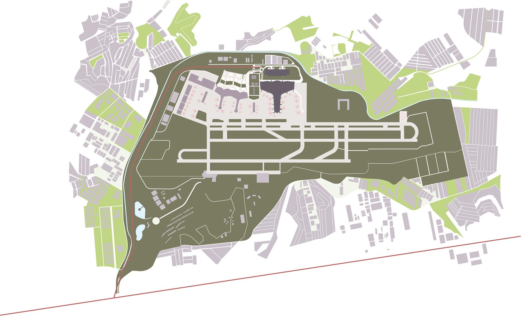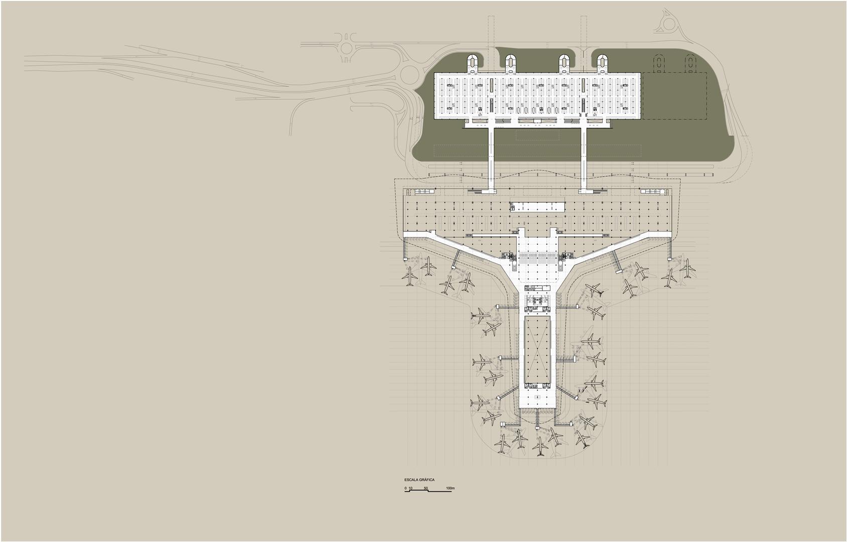 A cobertura, elemento morfológico único, reflete a horizontalidade do sítio e sugere uma topografia, alterada para abrigar a função precípua da edificação. Essa deformação da superfície horizontal se reflete diretamente em três grandes arcos ligeiramente abatidos, legíveis na escala do aeroporto, que fixam, a partir disso, as regras para a definição do sistema estrutural primário do plano da cobertura.