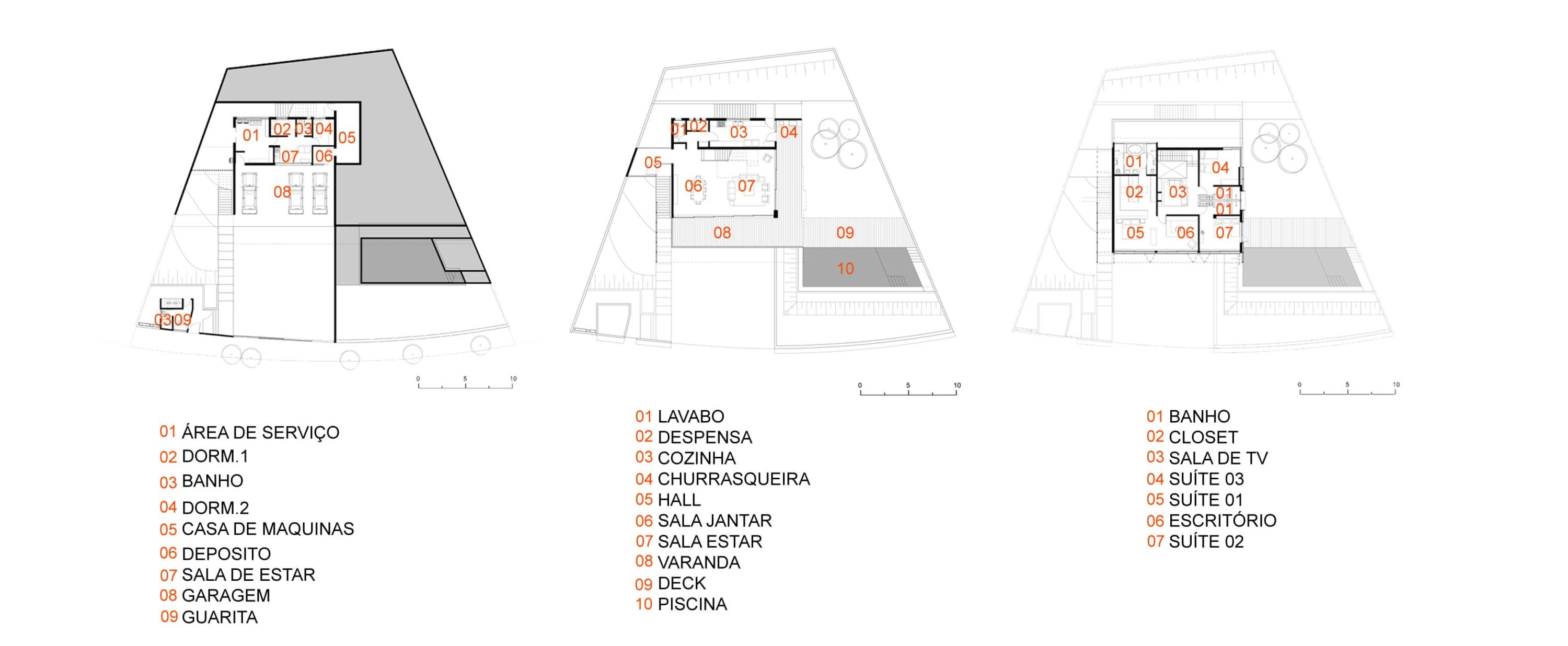 A residência está resolvida em 3 níveis, sendo o primeiro para garagem e áreas de serviço, o segundo para cozinha e sala, e o superior para os quartos e sala íntima.