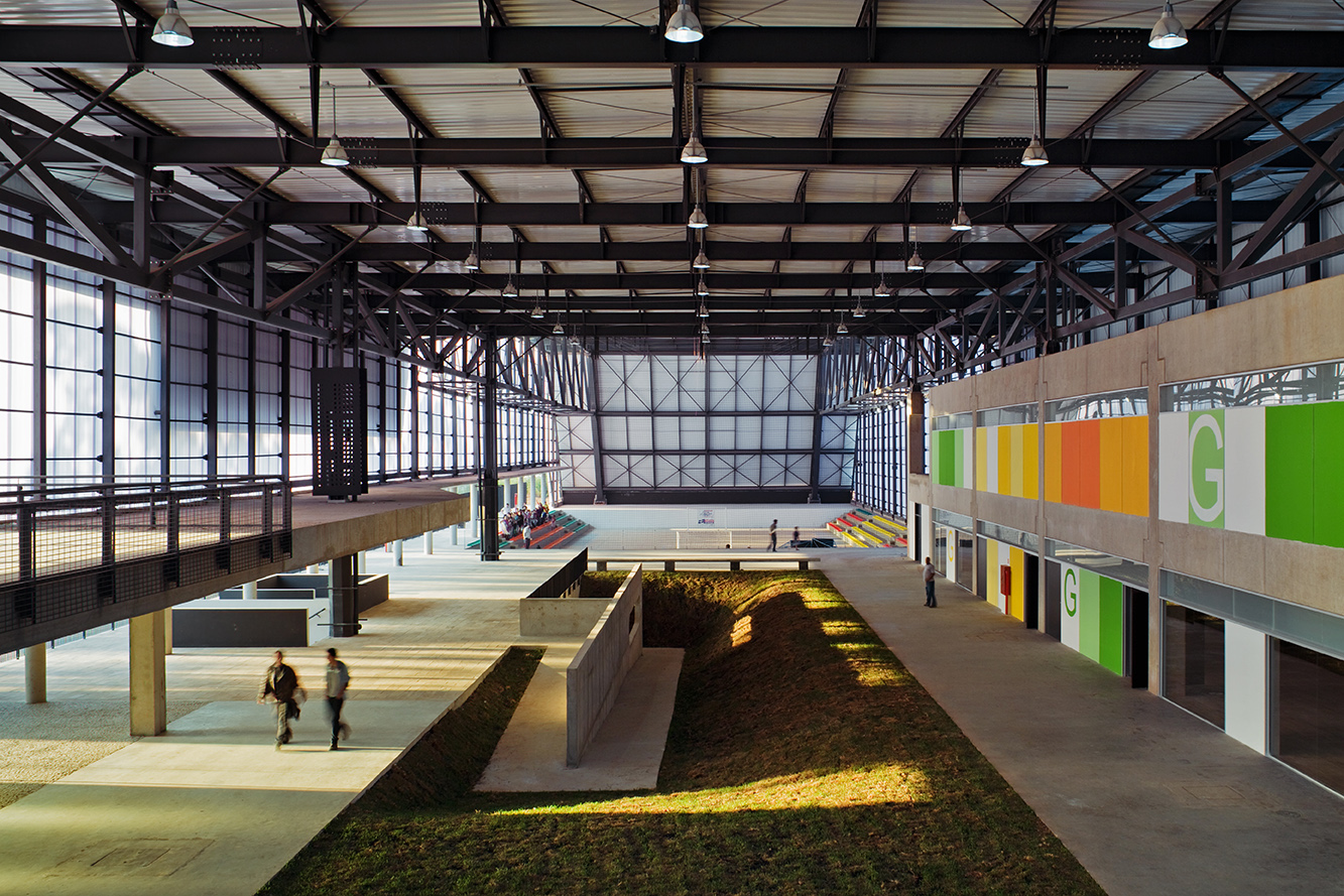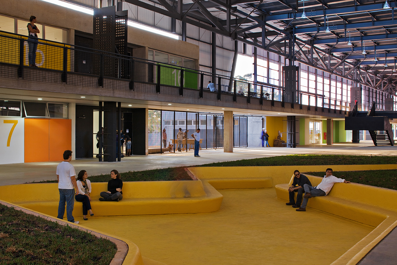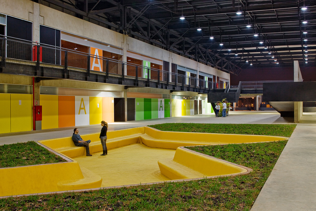O vazio central é a praça. Sem programa previamente definido, articula e da continuidade à programação ao seu redor através de percursos sugeridos no térreo e pontes no primeiro pavimento, acolhendo permanências e usos diversos ao longo de seus bancos espaços livres. Contribuem para essa diversidade e atmosfera lúdica as cores escolhidas para as fachadas internas, que variam do verde ao amarelo, em diversas matizes.