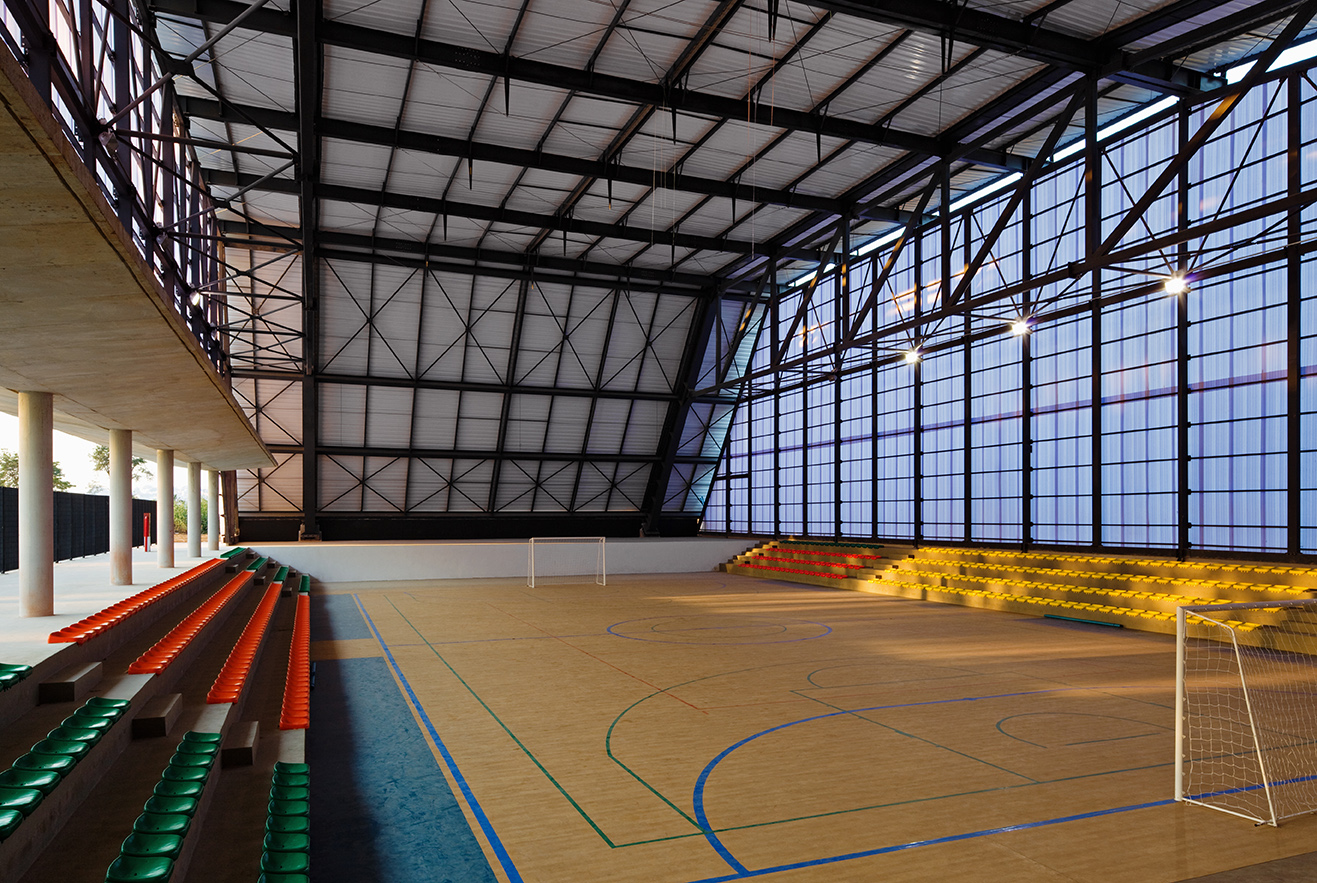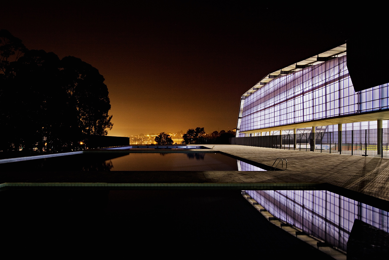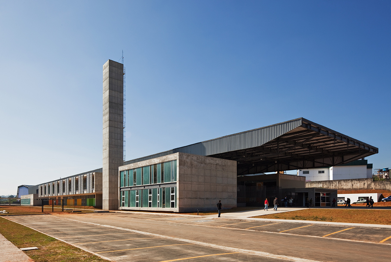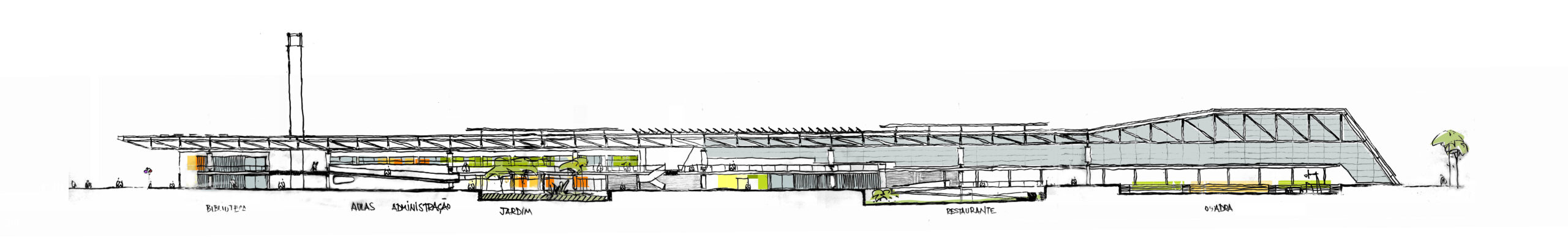 Os diversos usos se distribuem em blocos, ora em concreto pré-fabricado, ora em concreto moldado in-loco. Biblioteca, salas de aula e refeitório se localizam no lado oeste do eixo. No lado oposto, localizam-se os volumes das salas de aula, ginástica olímpica, dança e auditórios.