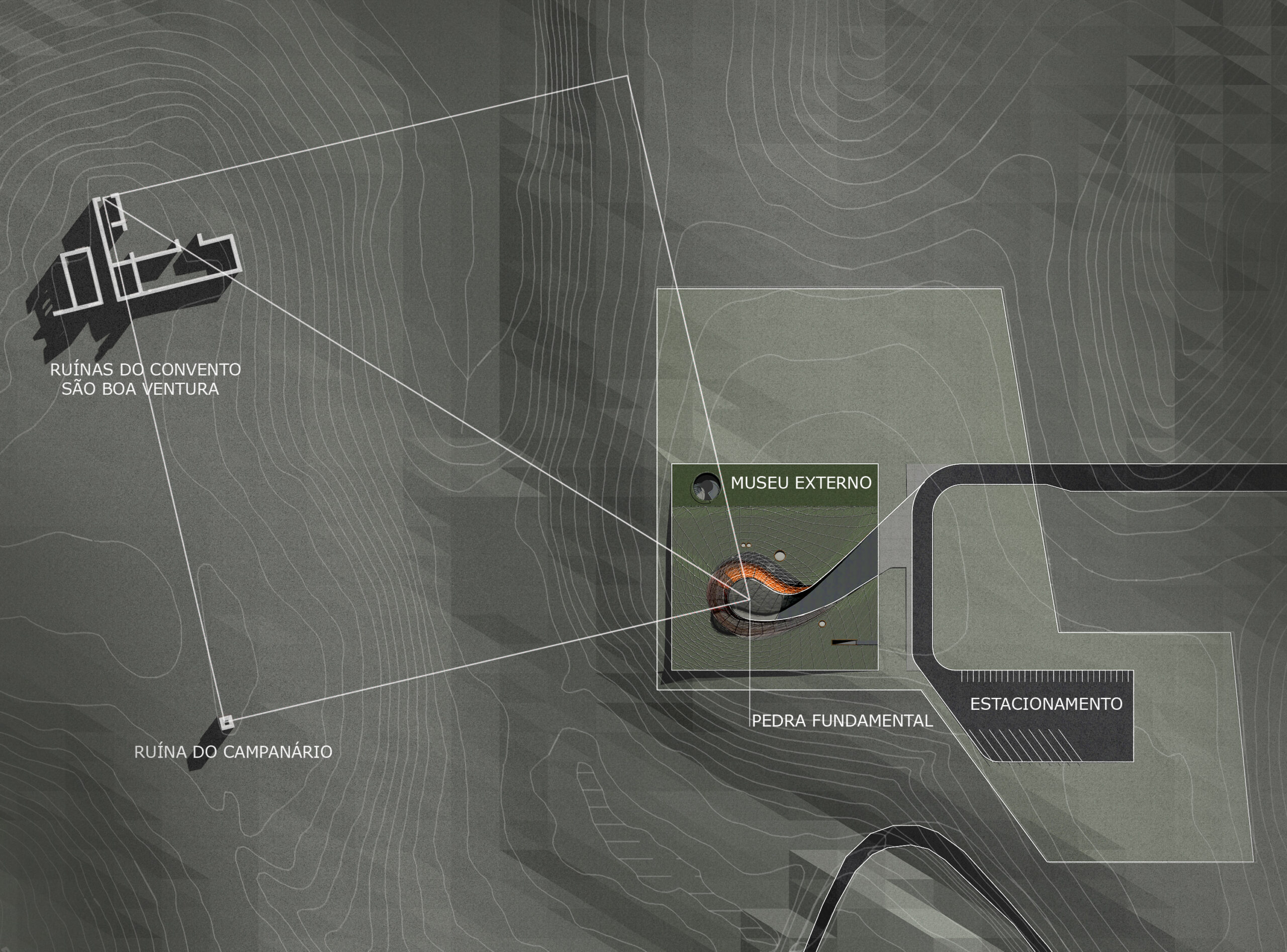 O desenho da implantação faz coincidir a cota da cobertura com a cota do convento, de modo a preservar as melhores possibilidades para a sua visualização e para a designação do museu a céu aberto no mesmo nível.