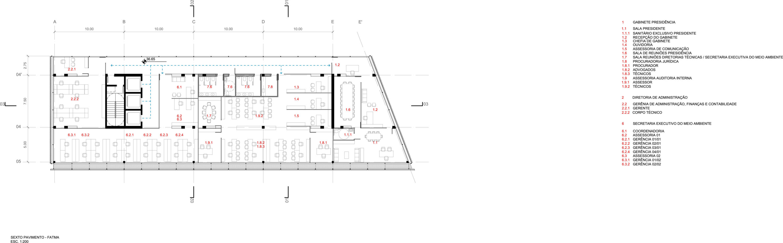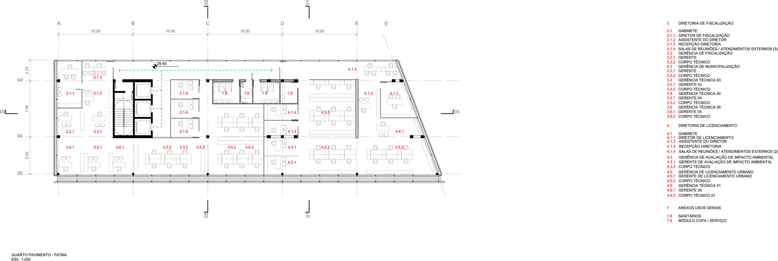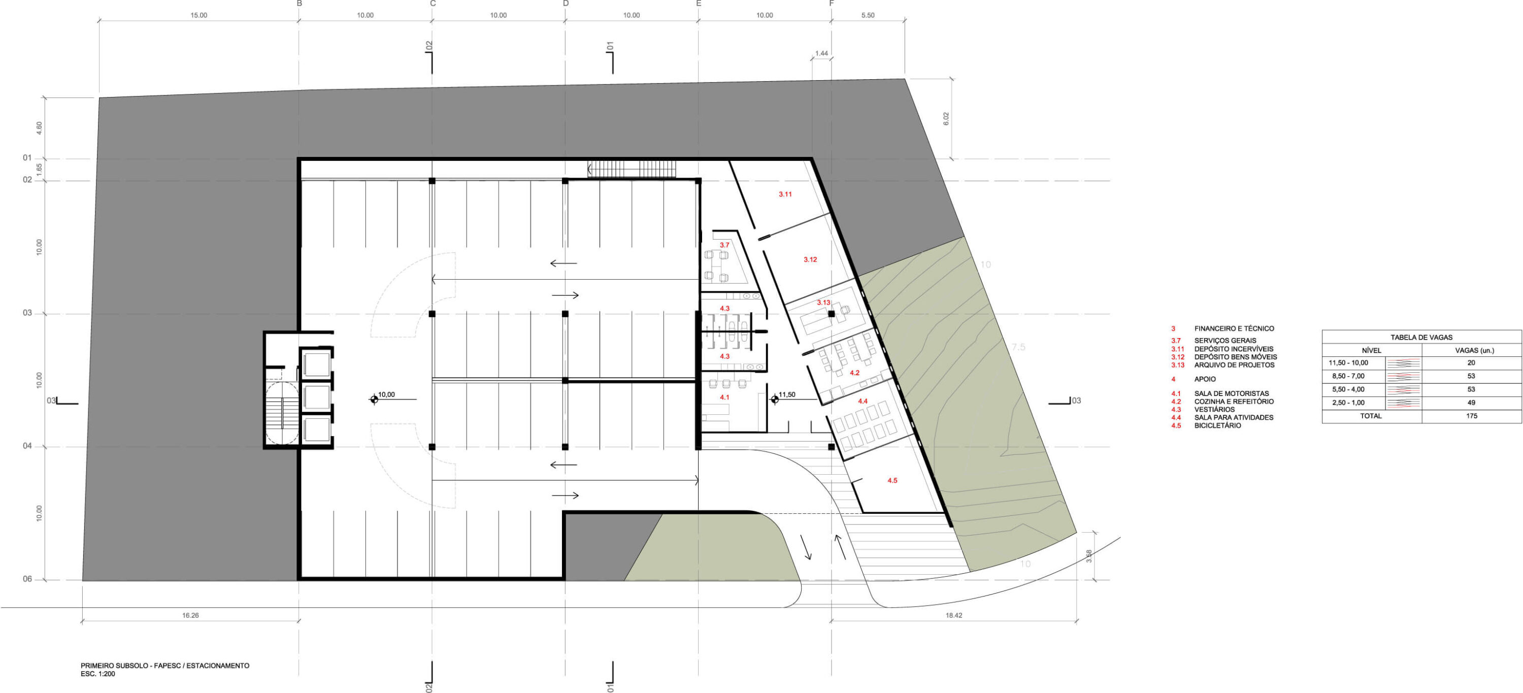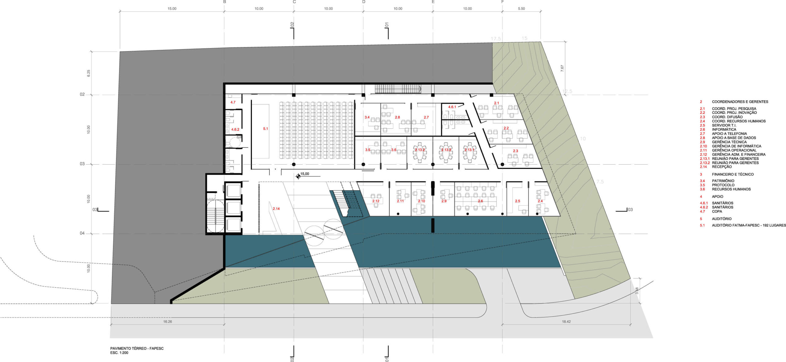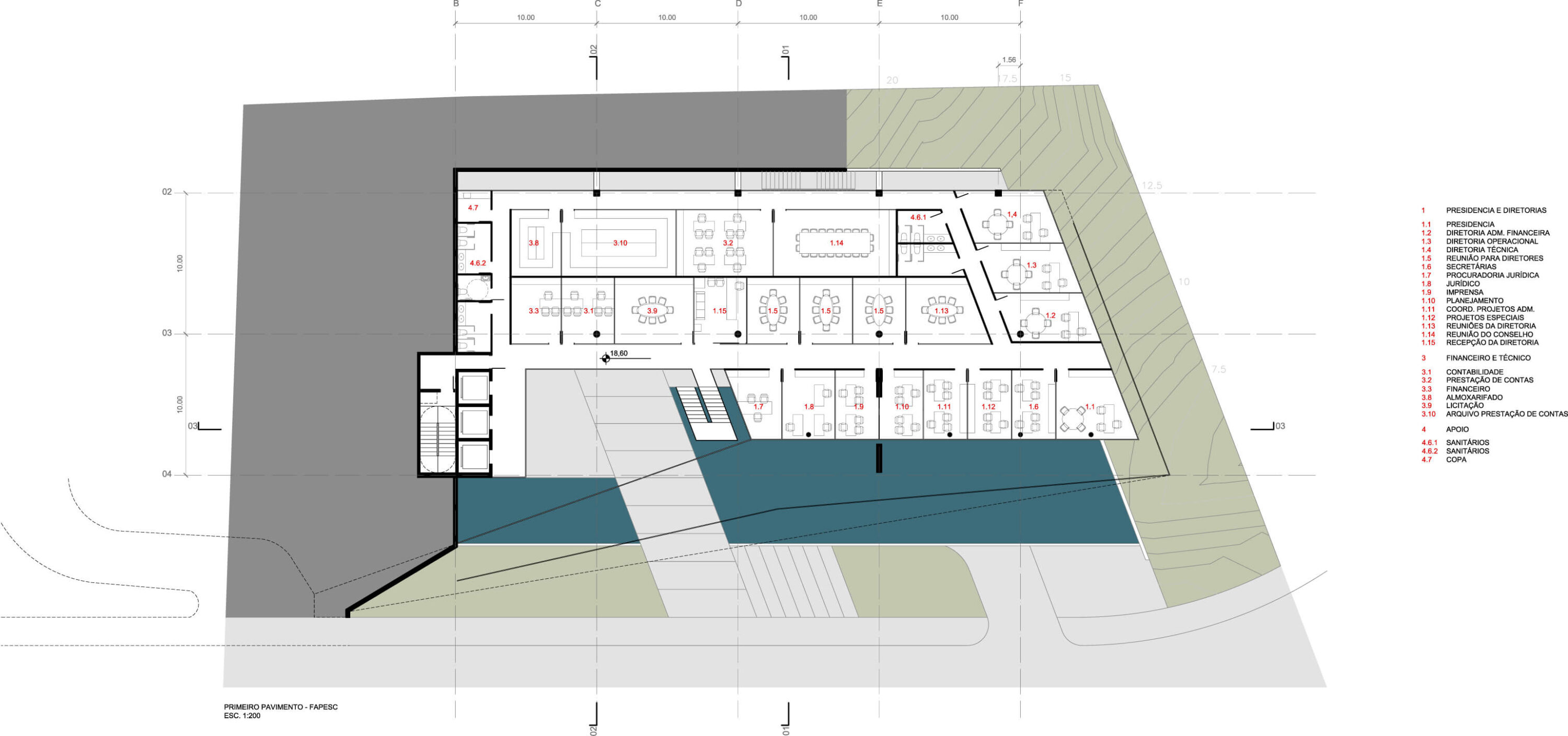 O Partido arquitetônico propõe uma clara divisão entre a sede da FATMA e da FAPESC, através da introdução de um pavimento livre de acesso público que configura uma praça, sem prejuízo da demanda por acessos controlados e da privacidade das áreas de trabalho. Este movimento se destina a reconstruir a topografia depois das necessárias escavações, e a recuperação dos percursos pedestriais através do sítio. Pode ser compreendido como uma generosidade das instituições que ali estarão instaladas, uma gentileza urbana para com o campus.