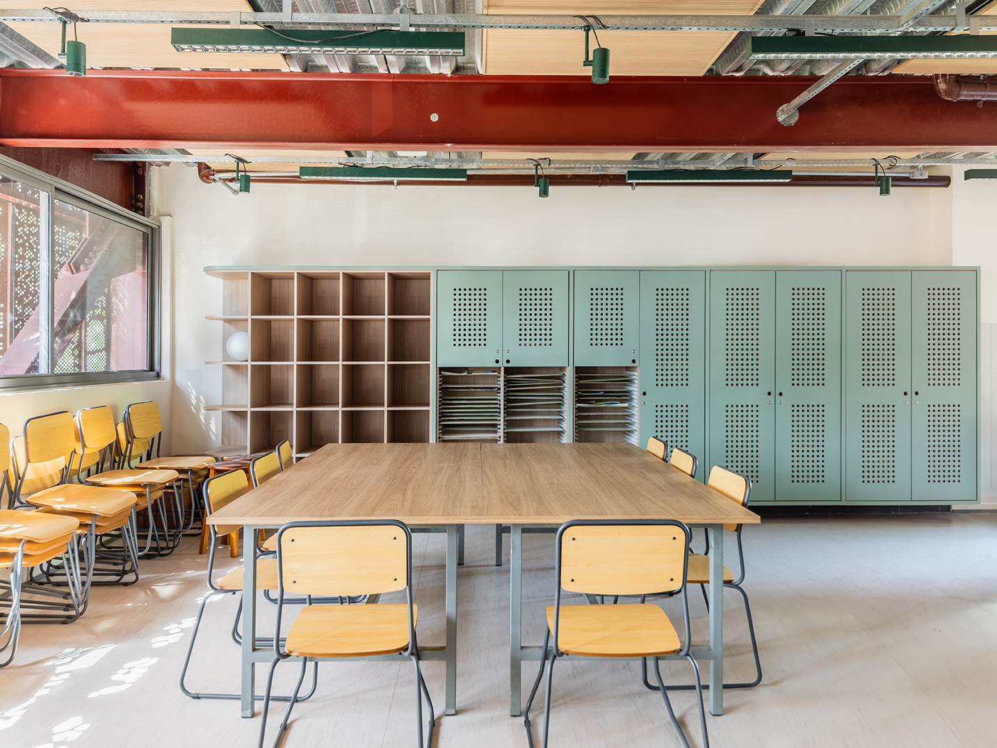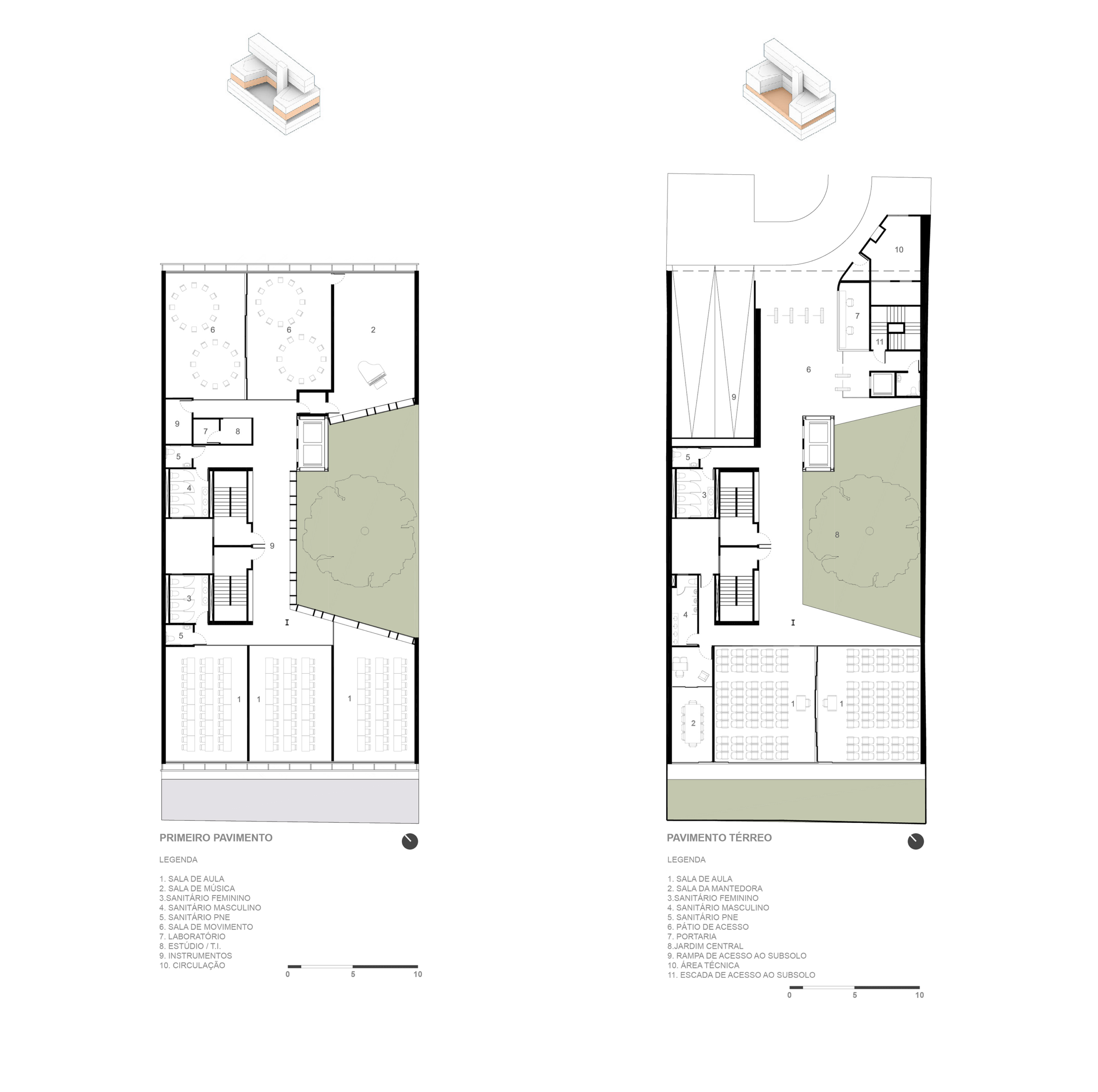 O edifício abrange três níveis: o térreo e dois andares superiores, cada um com seis salas de aula. Os espaços pedagógicos foram projetados para serem flexíveis, permitindo reorganizações conforme as necessidades evoluem e oferecendo maior usabilidade. Essa flexibilidade se estende à circulação vertical, projetada para estimular interação e socialização. No segundo andar, há um terraço que oferece um espaço para relaxamento e interação social, com móveis confortáveis e vista livre do entorno. Externamente, dois elevadores panorâmicos de vidro conectam os andares e oferecem vista da mangueira e da área ao redor.