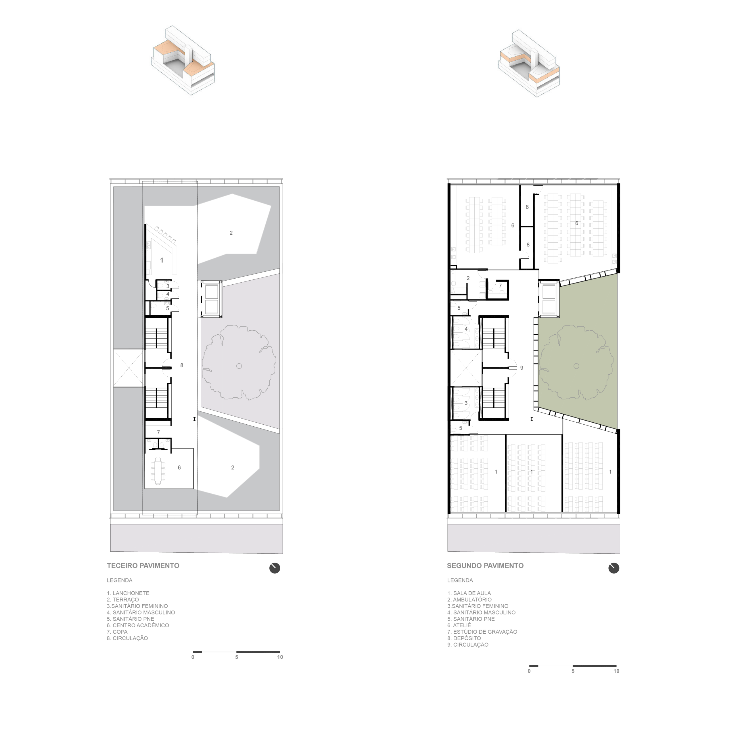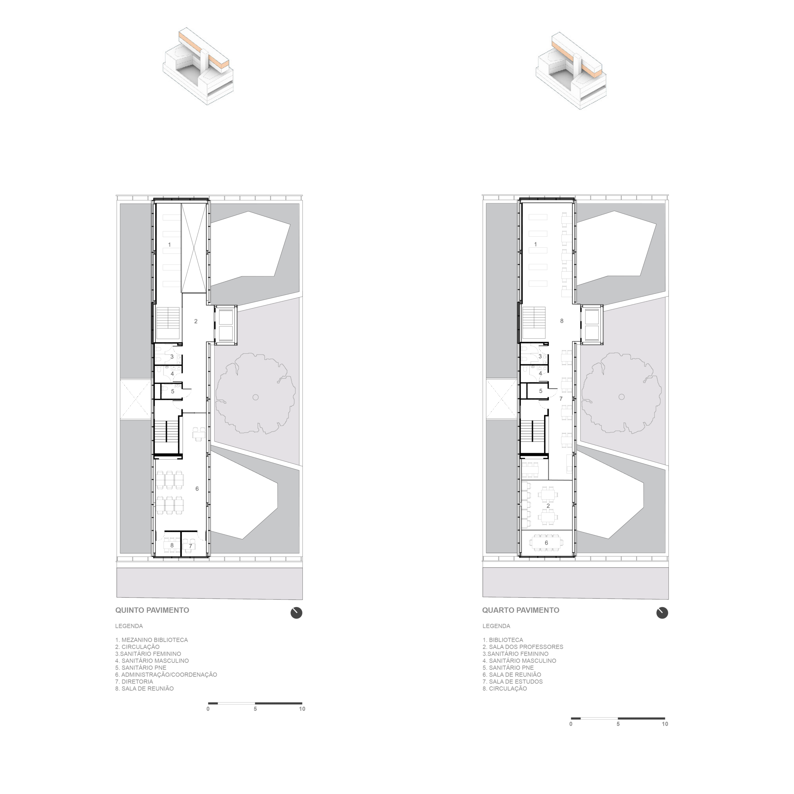 O telhado conta com um bloco suspenso para funções administrativas, e a biblioteca, localizada no ponto mais alto do edifício, simboliza seu papel como um farol de conhecimento e dedicação ao aprendizado.