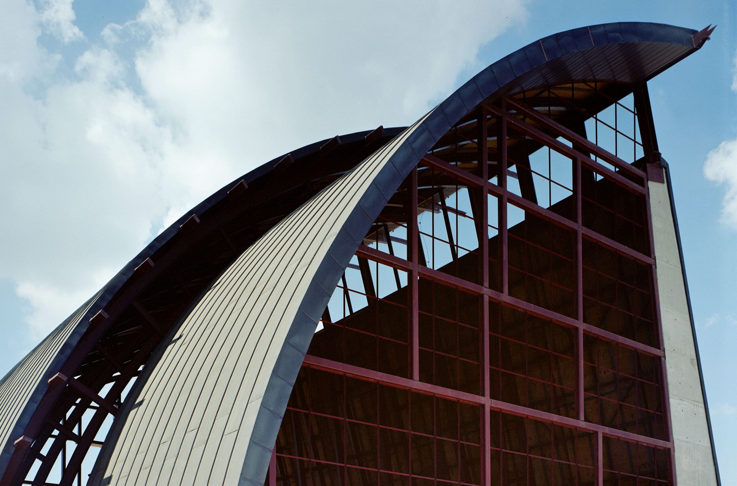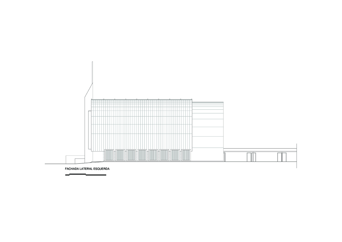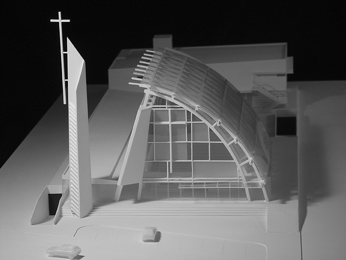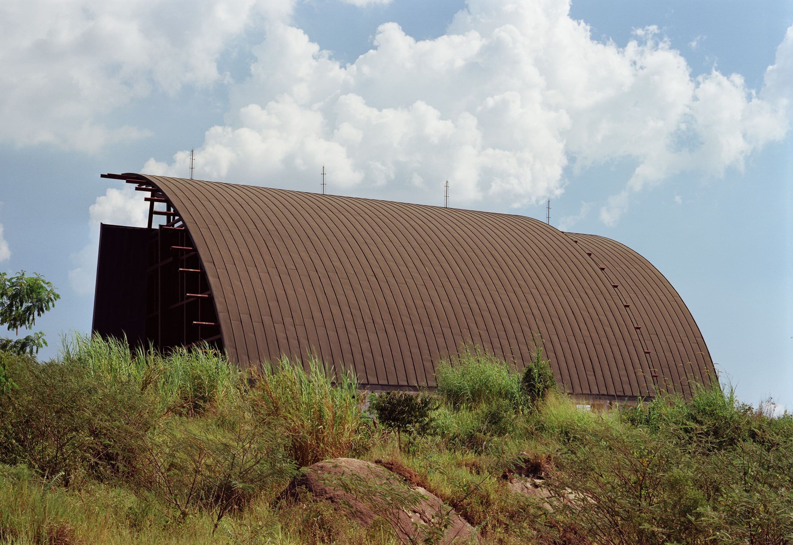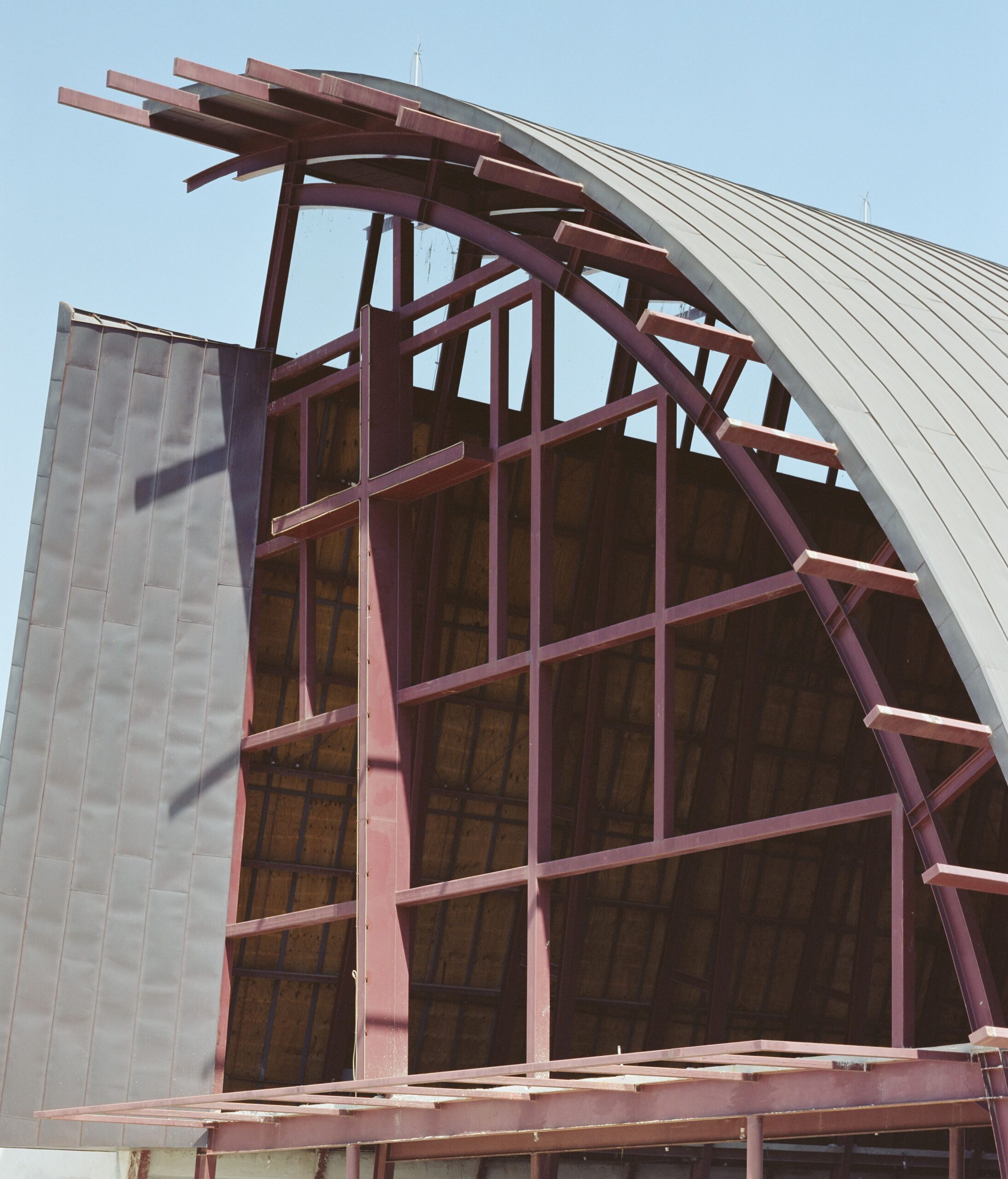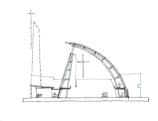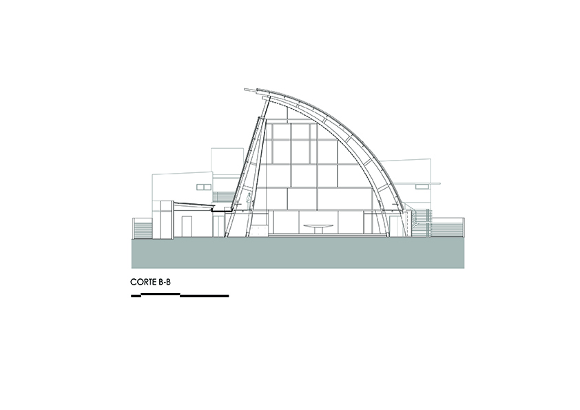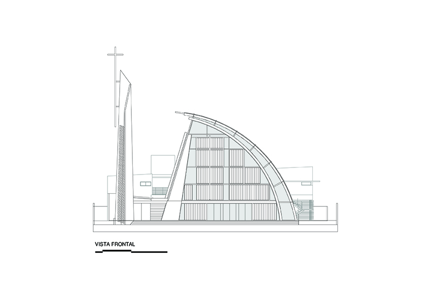 O projeto da Igreja Tamboré organiza-se a partir de um gesto estrutural claro e expressivo: uma grande cobertura curva metálica que define o espaço litúrgico principal e confere identidade ao conjunto. Essa estrutura em arco, levemente deslocada do eixo convencional, cria um interior contínuo, amplo e unitário, no qual a percepção espacial é conduzida pela própria forma da cobertura e pela modulação dos pórticos metálicos aparentes.