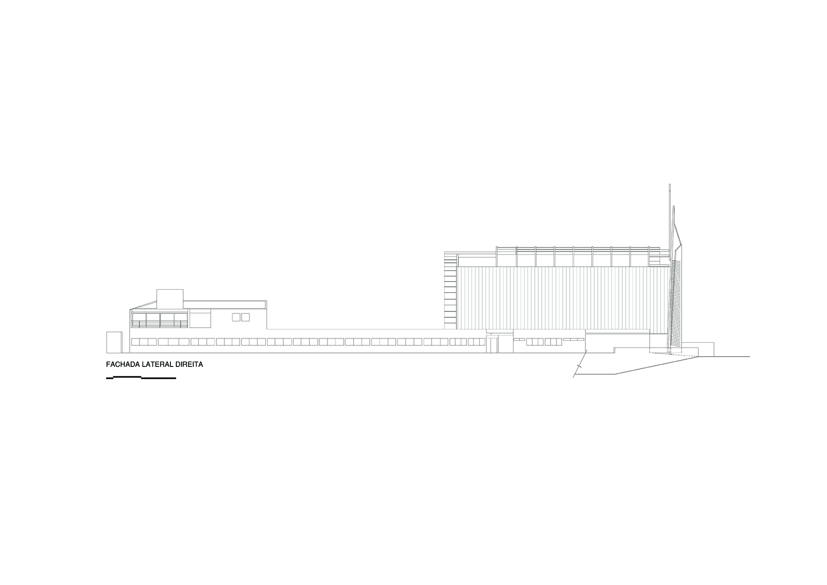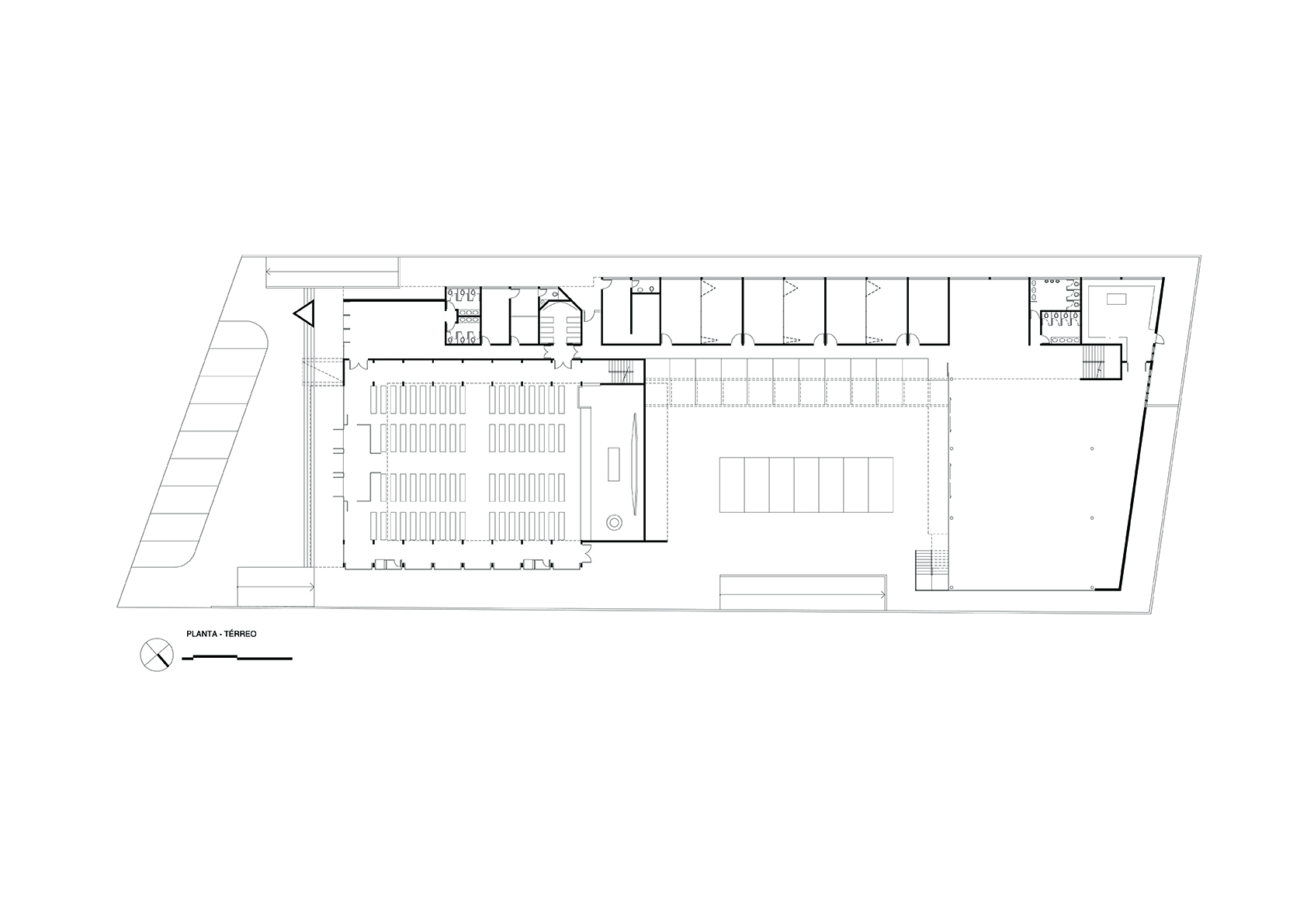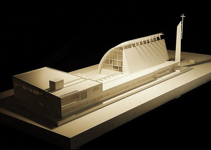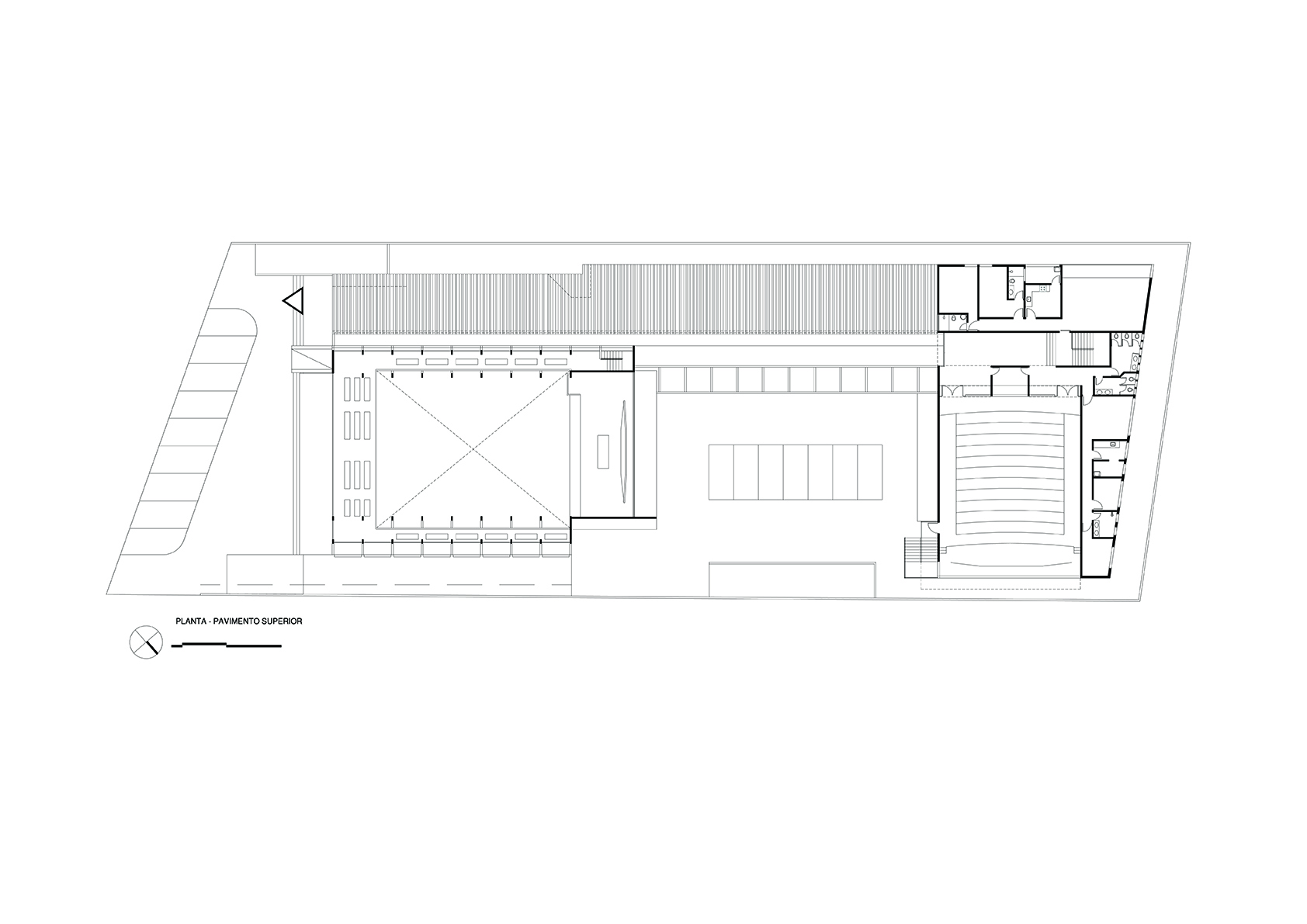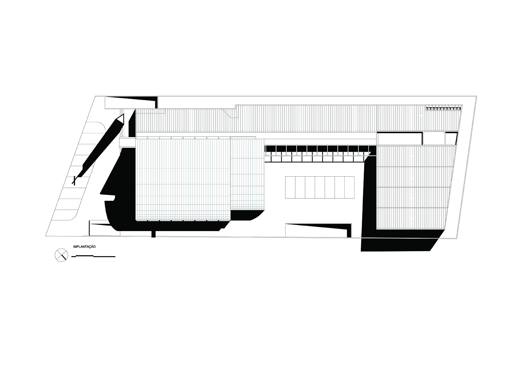 O projeto da Igreja Tamboré organiza-se a partir de um gesto estrutural claro e expressivo: uma grande cobertura curva metálica que define o espaço litúrgico principal e confere identidade ao conjunto. Essa estrutura em arco, levemente deslocada do eixo convencional, cria um interior contínuo, amplo e unitário, no qual a percepção espacial é conduzida pela própria forma da cobertura e pela modulação dos pórticos metálicos aparentes.