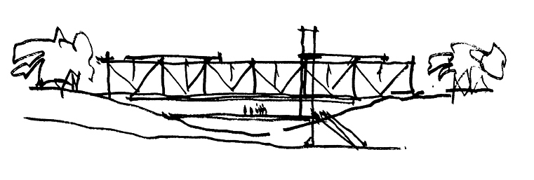 A observação da topografia do terreno nos conduz a um desejo quase irresistível de sobrepor o vale através de uma ponte, unindo as duas pequenas colinas que se apresentam como a característica mais marcante do lugar.