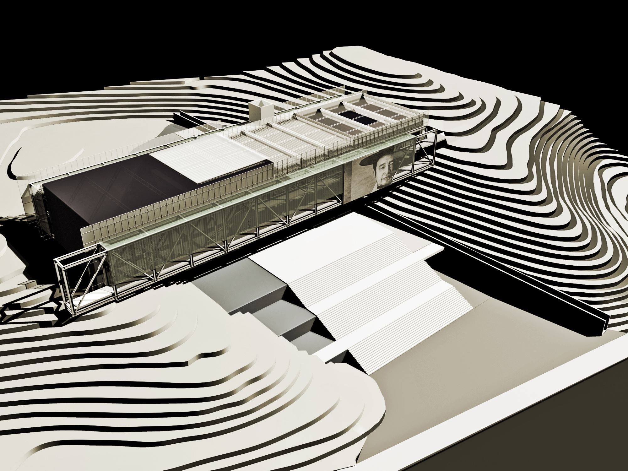 Procurando conciliar os aspectos subsequentes relativos ao programa arquitetônico/museológico e sua inserção no terreno, percursos internos e de conexão entre edifícios do NEIGHBORHOOD PARK, bem como diversos outros aspectos técnicos e funcionais, nos damos conta de que a ponte, enquanto partido arquitetônico, apresenta uma quantidade enorme de vantagens em relação a outras possibilidades. A ponte é também uma solução de impacto ambiental controlado, dado que se sustenta com apenas quatro pontos de apoio e permite uma desejável transparência para o edifício, em face do entorno e do verde.