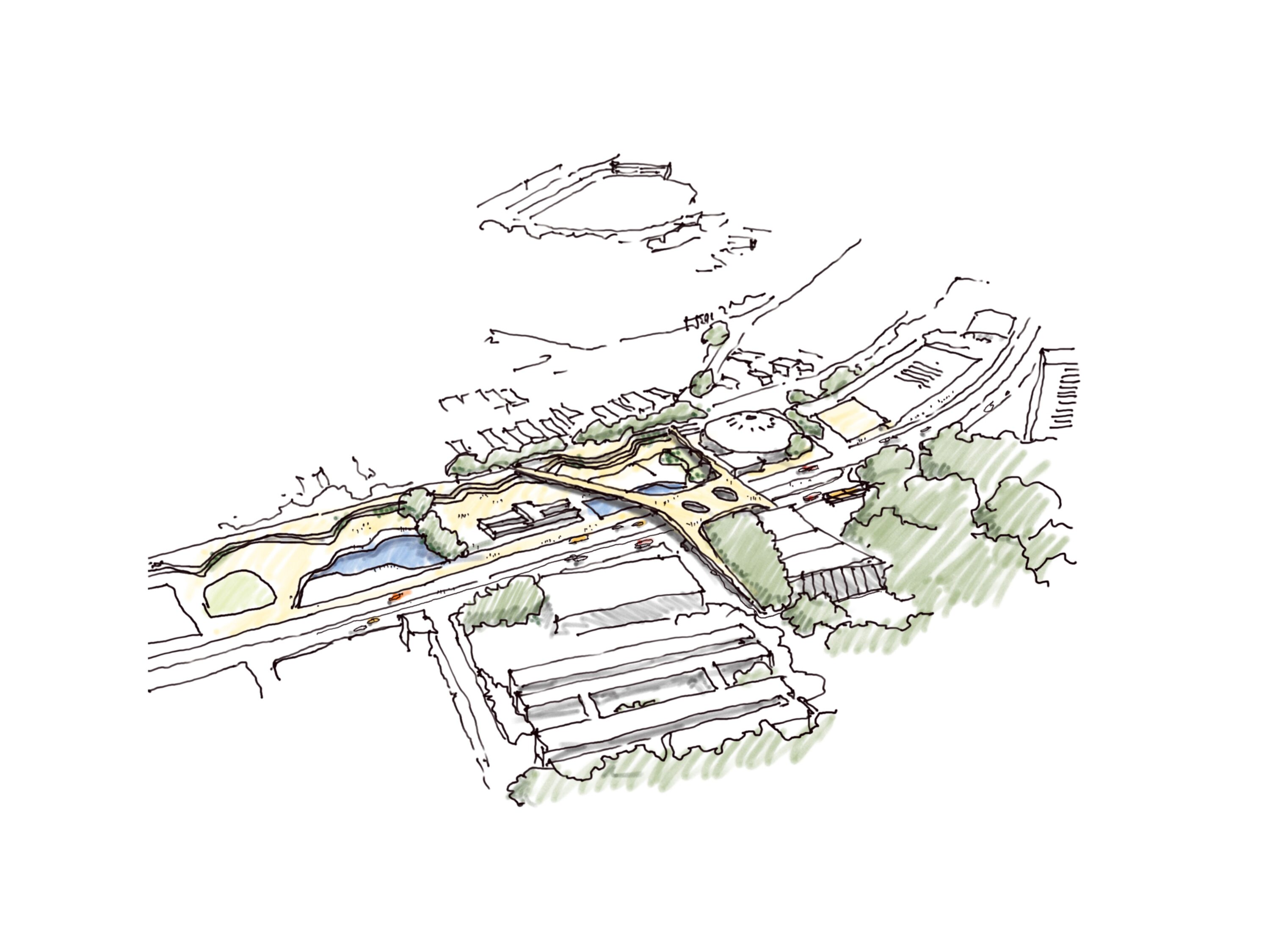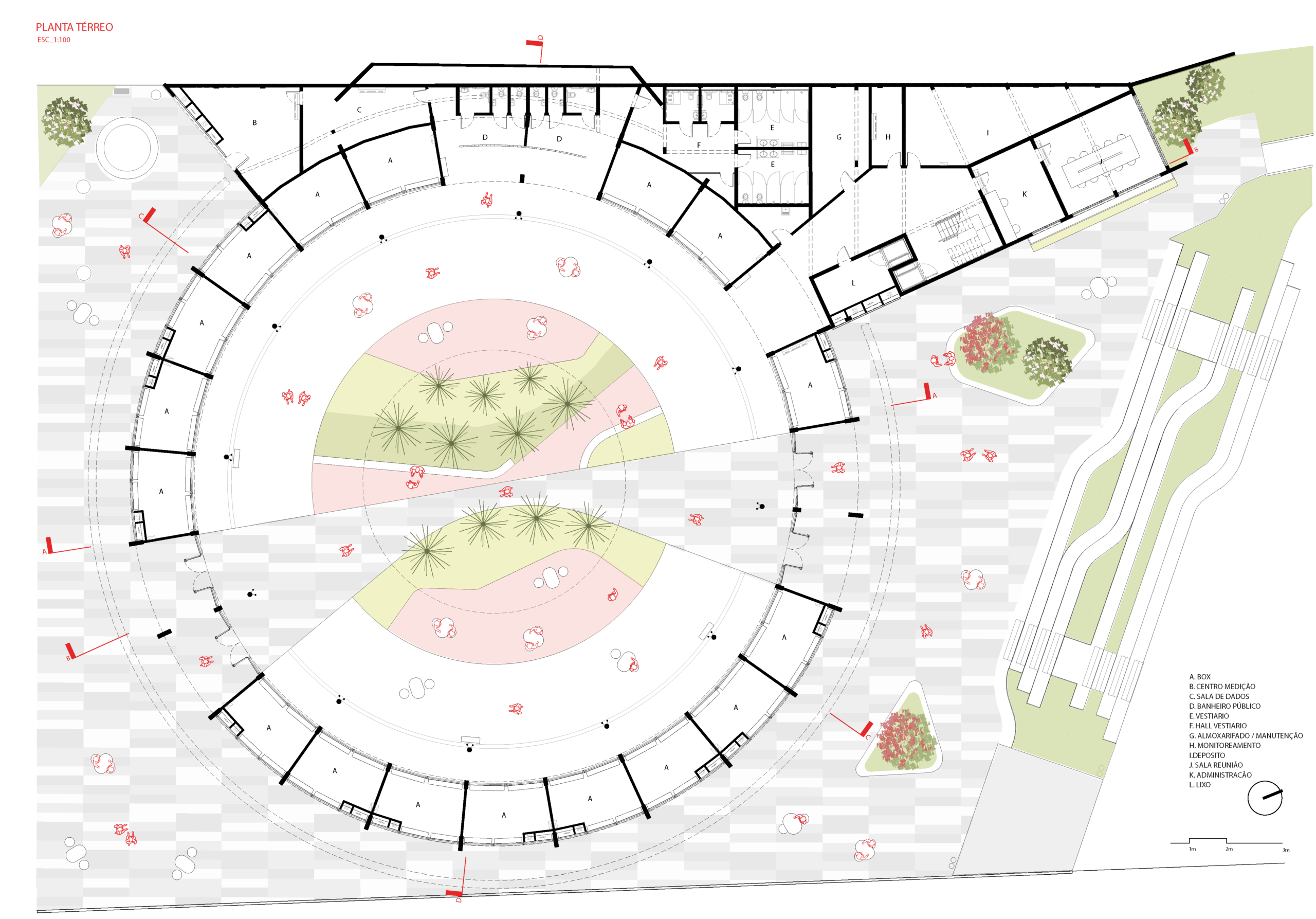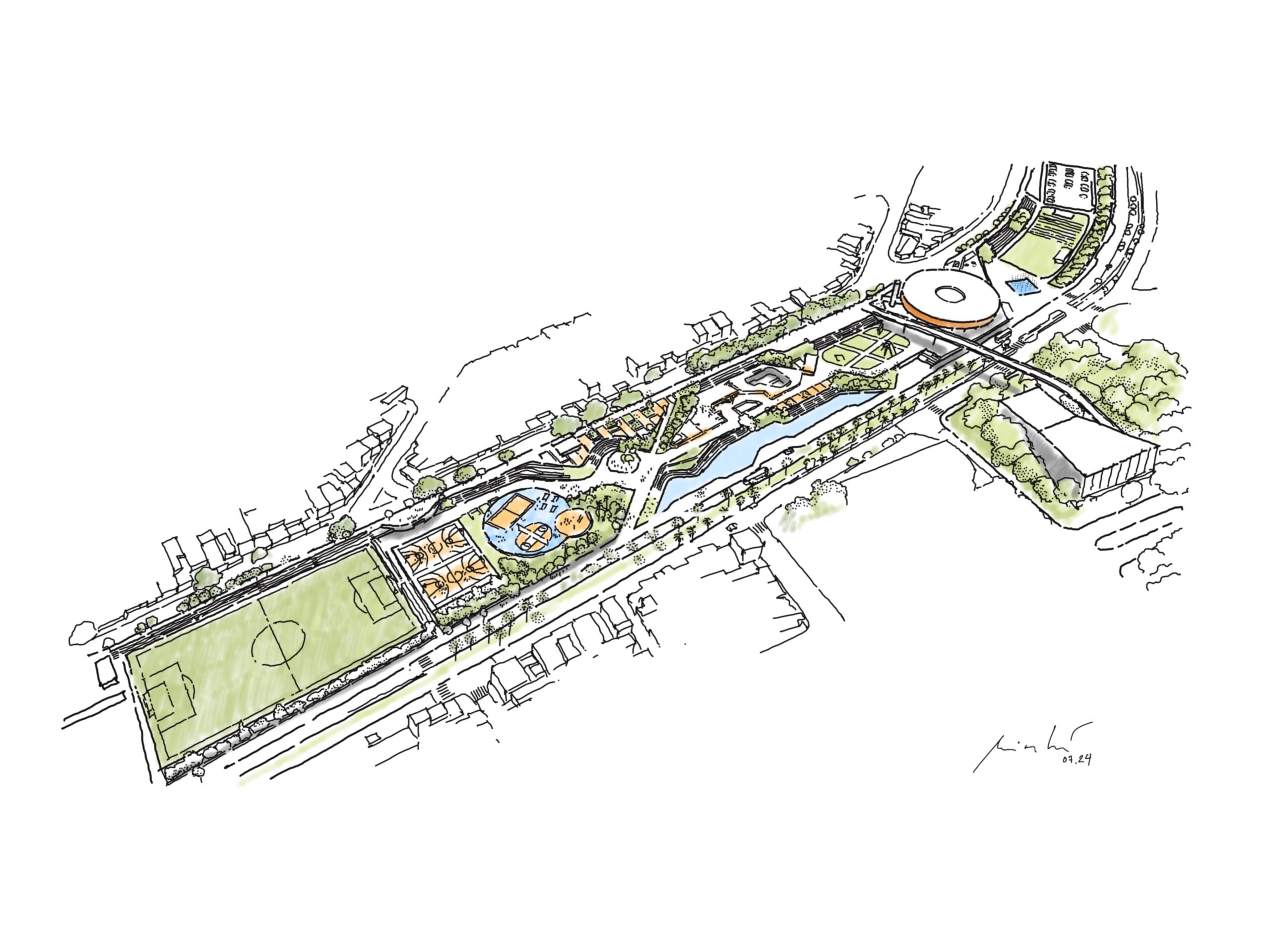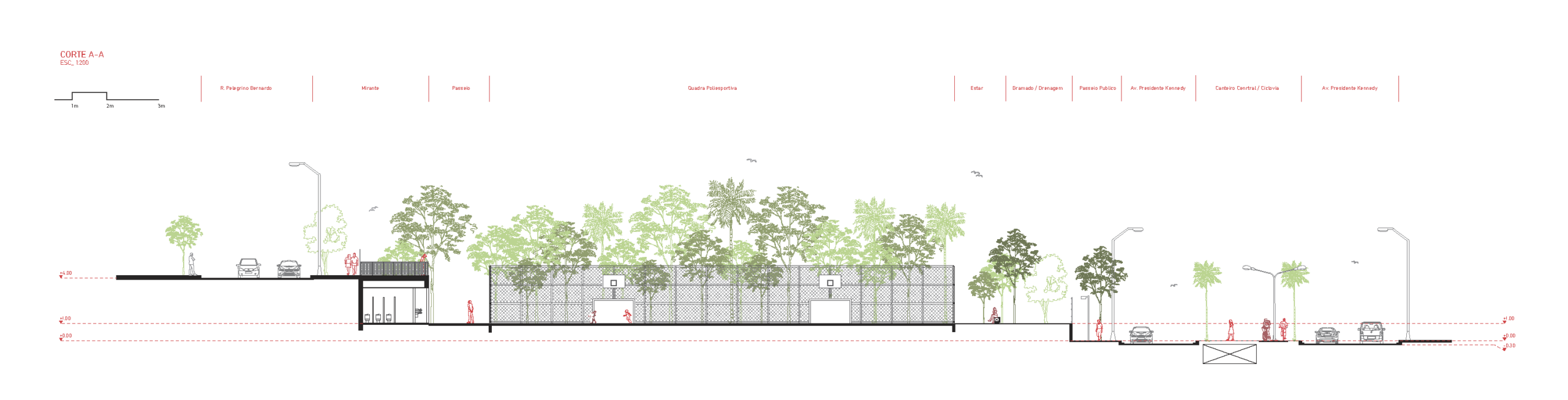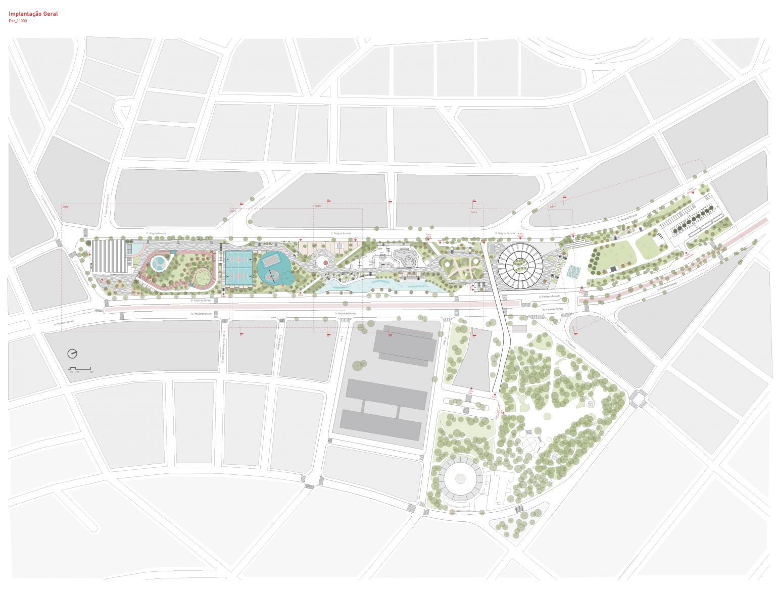 Implantado em um fundo de vale, o parque acompanha o curso do Córrego dos Moinhos, que corre sob a Avenida Presidente Kennedy. A partir das condições topográficas do terreno, o projeto organiza o programa em platôs interligados por rampas e passagens, garantindo fluidez e acessibilidade ao longo de todo o percurso. A solução transforma o desnível natural em elemento de desenho urbano, utilizando a própria geografia como ferramenta de conexão entre as margens da avenida e os diferentes equipamentos públicos.
