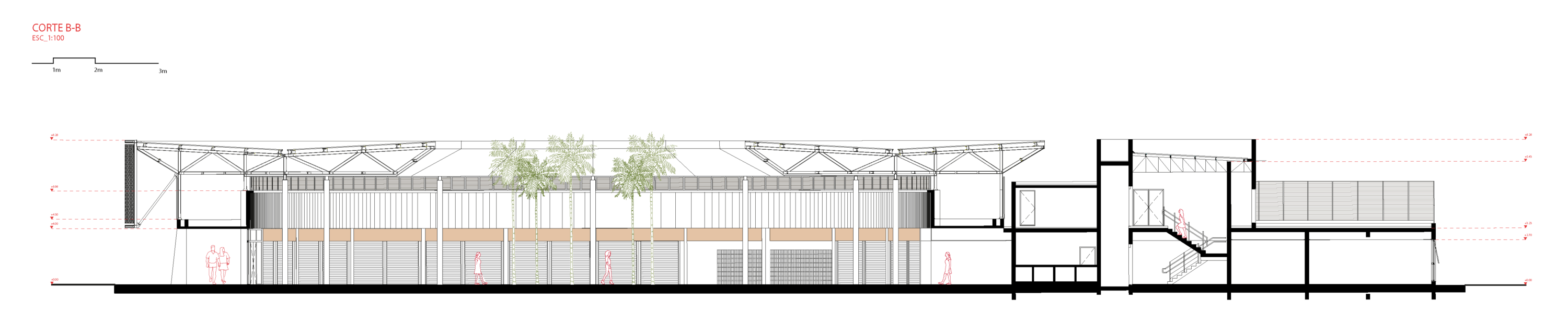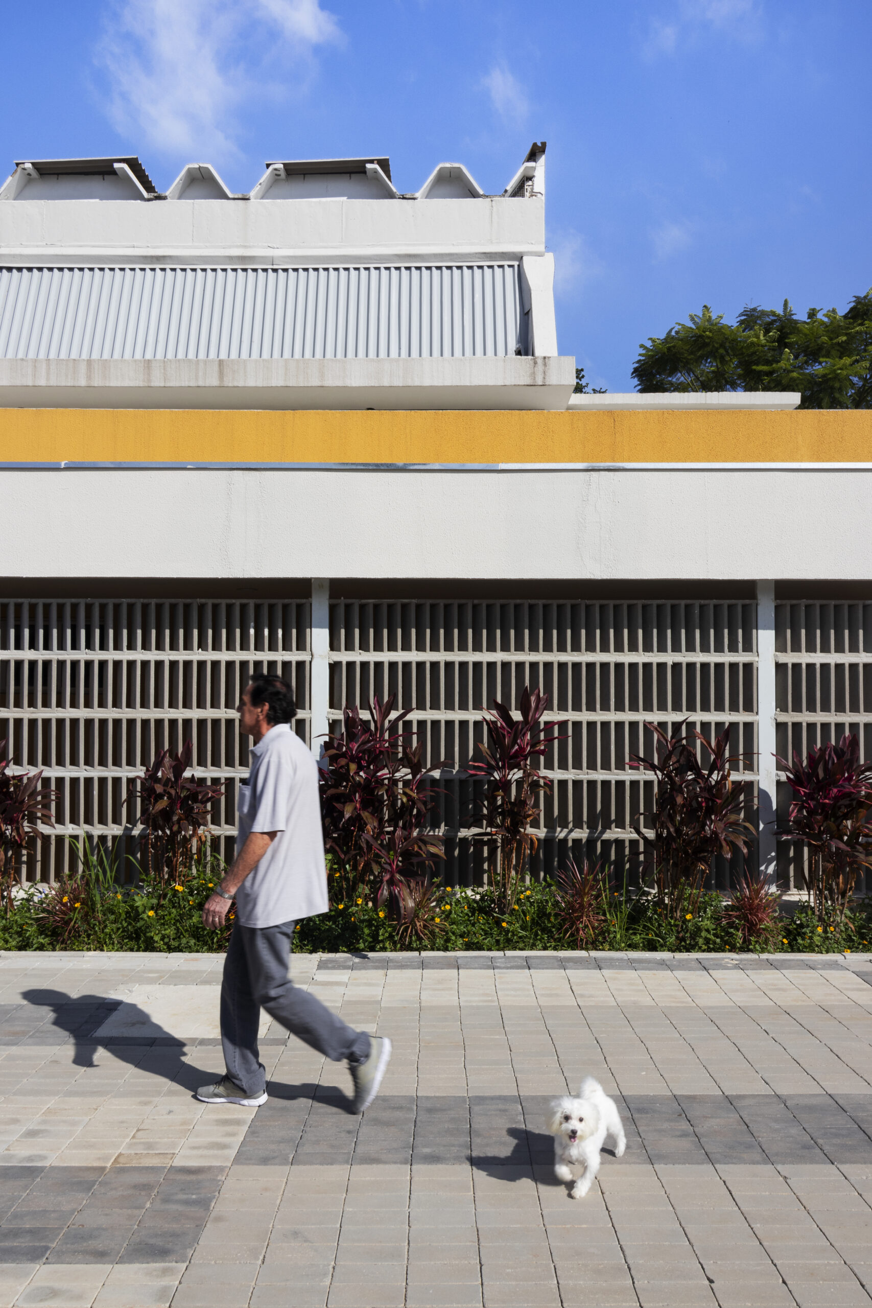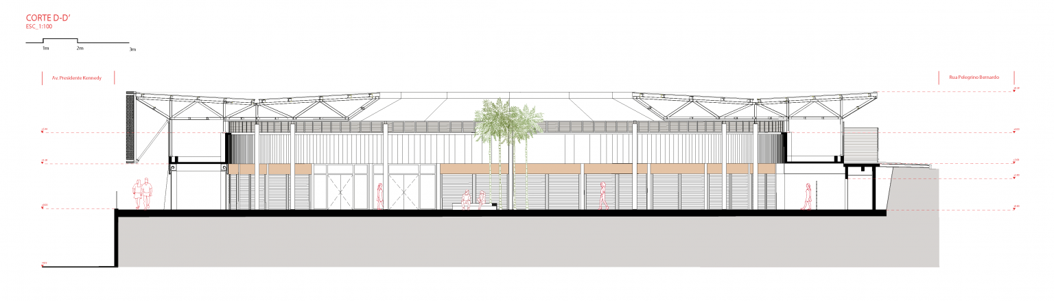 Com orçamento público controlado, o projeto adota materiais simples e duráveis, como concreto aparente, blocos intertravados e pintura, valorizando o uso cotidiano. O detalhamento cuidadoso e o desenho preciso dos espaços garantem conforto, diversidade e clareza na leitura do conjunto. Entre os novos equipamentos, destacam-se a pista de skate profissional, quadras esportivas, playground, cachorródromo, pista de cooper, praça das esculturas e o mercado municipal requalificado.
