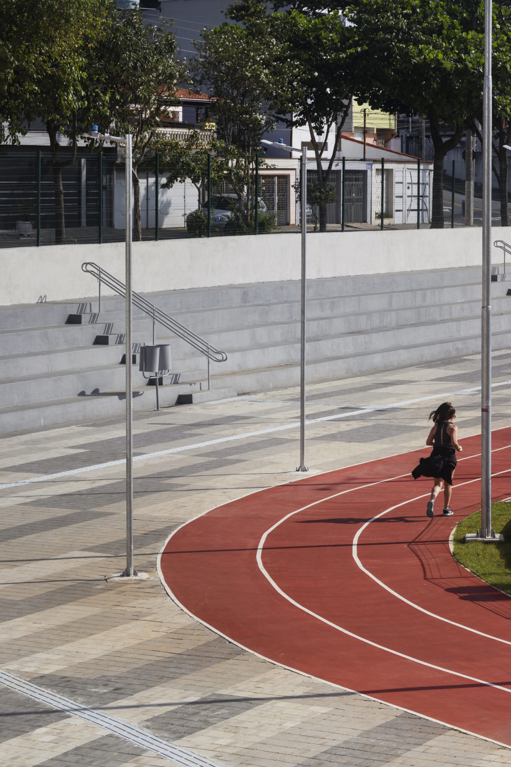 “Primeiro pensamos em como reestabelecer a conexão do terreno, antes com muros altos e extensos, com o seu entorno. Disso surgiram as linhas mestras para o desenho dos pisos e a organização em platôs. Trabalhamos as bordas para mitigar o impacto da avenida na paisagem e para dar alguma privacidade às residências no entorno imediato do parque.” descreve Victor Piza, sócio arquiteto da Consoante Arquitetura e Integração.