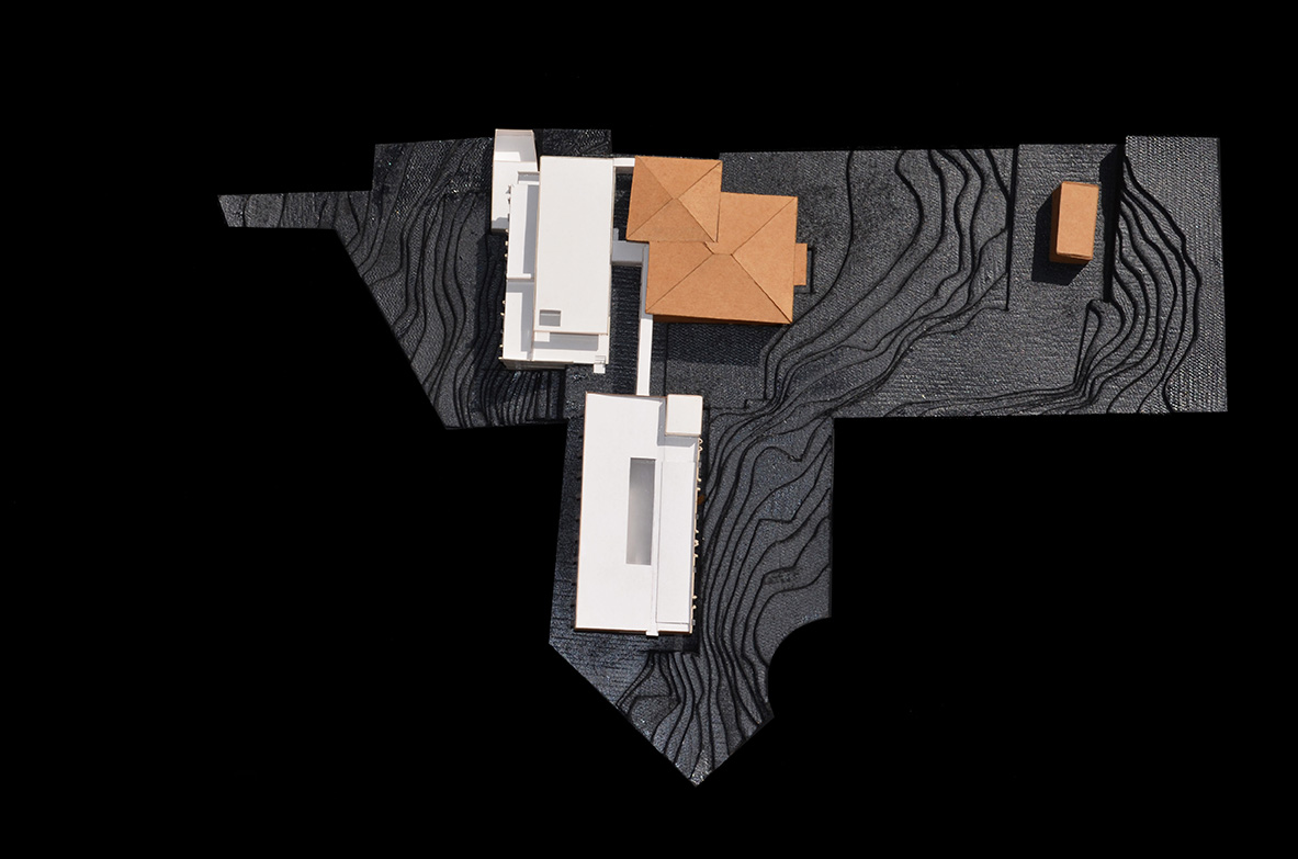 A topografia do terreno é peculiar. Em duas linhas que são perpendicularmente conectadas, o terreno tem claramente dois platôs, as localizações mais favoráveis para edificações que, entretanto, já estavam ocupadas pelas construções existentes. Para a expansão sobraram as áreas de maior inclinação – em alguns locais a inclinação atinge 33%, com uma queda de cerca de 20 metros. O que inicialmente parece um problema, foi o cerne da solução de usos e fluxos: o acesso ao setor de apoio se dá pelo nível mais baixo, e o acesso ao setor residencial pelo nível mais alto.