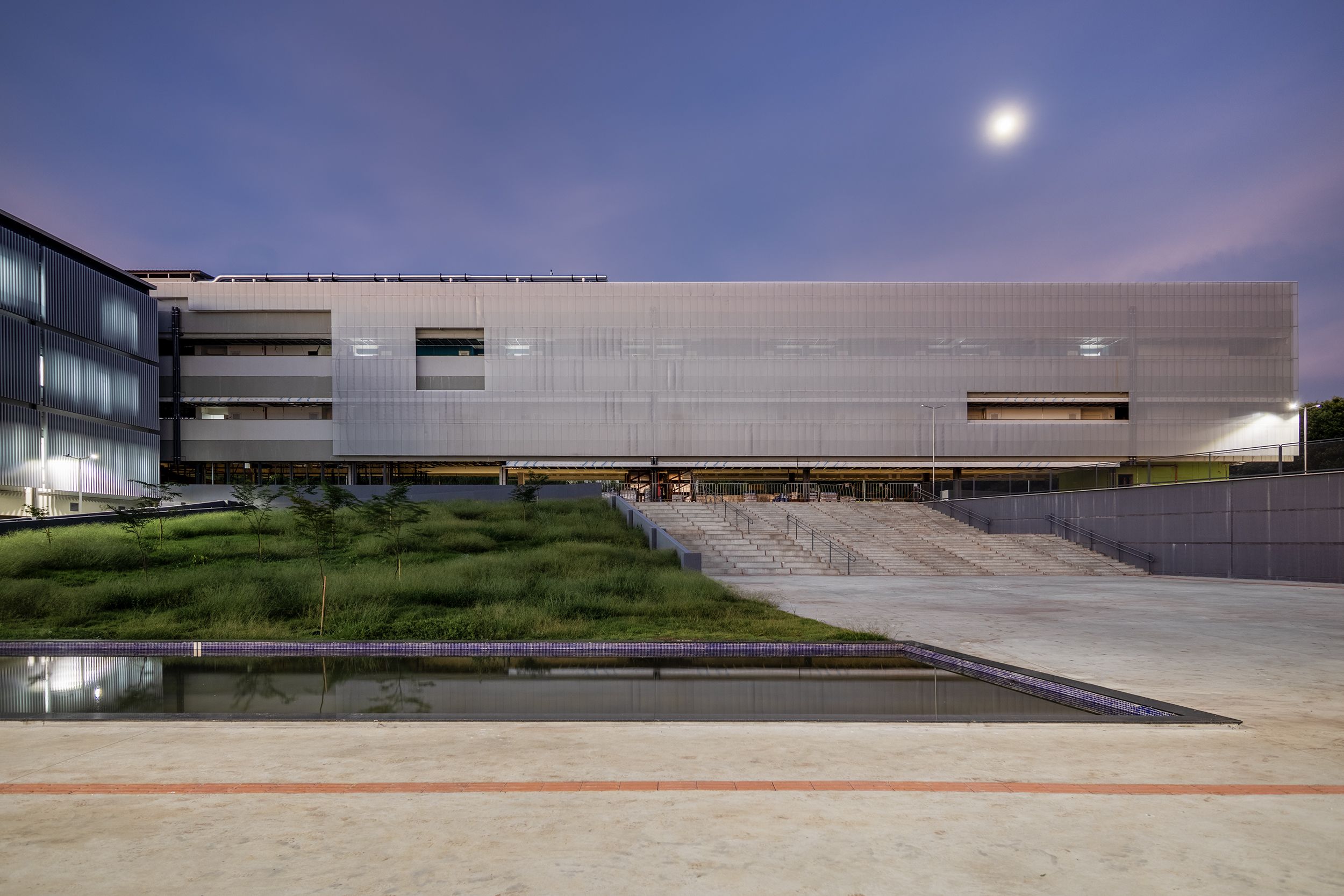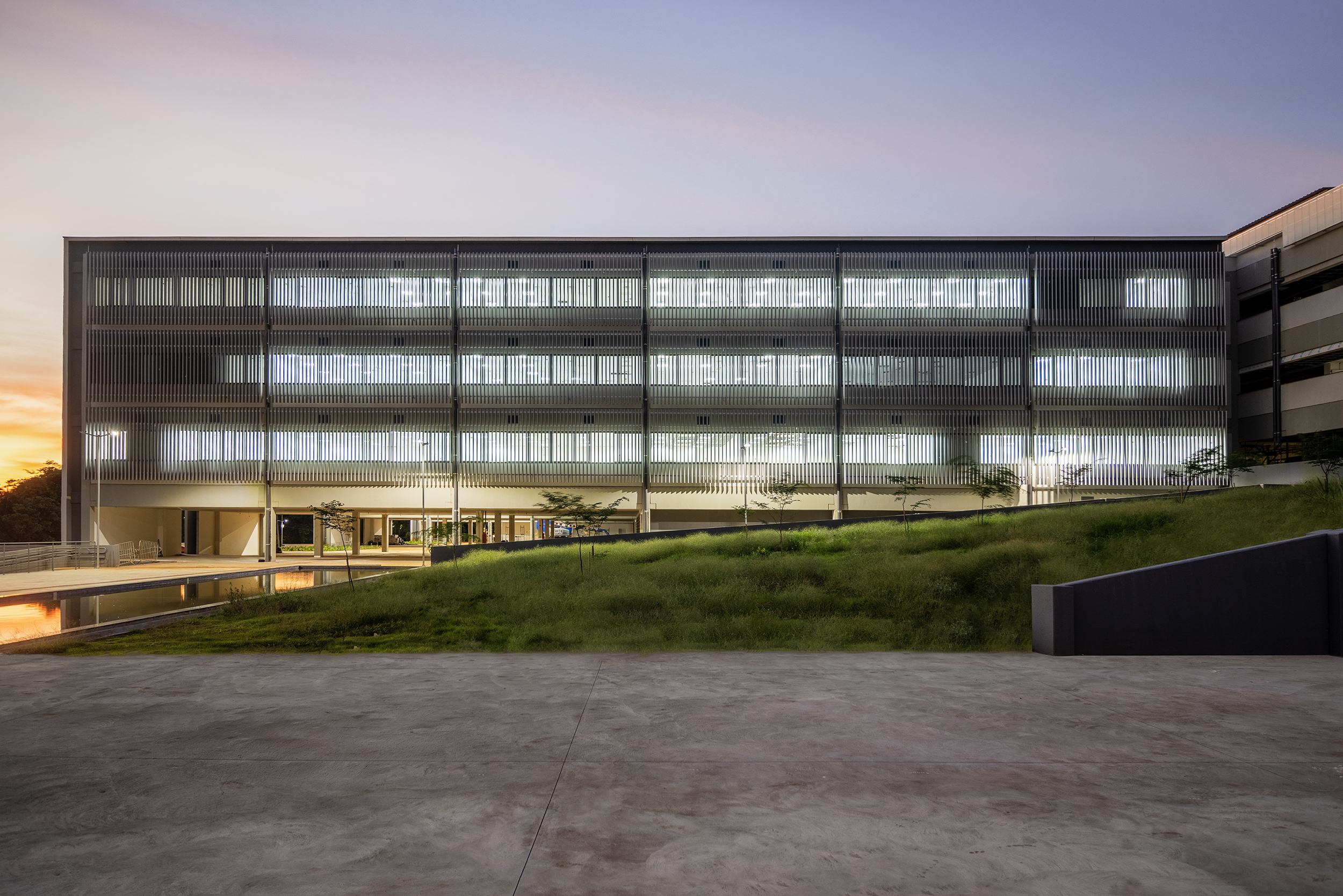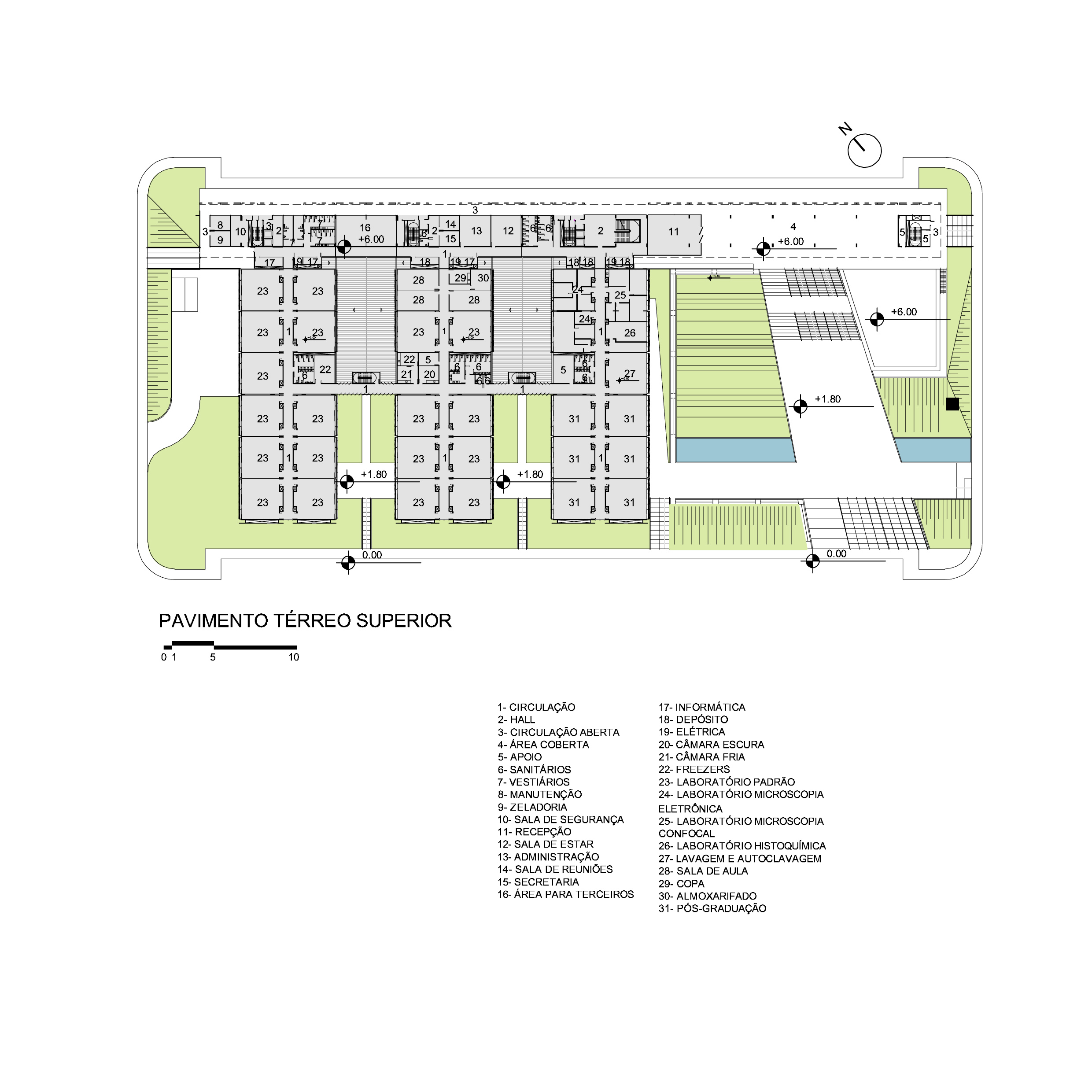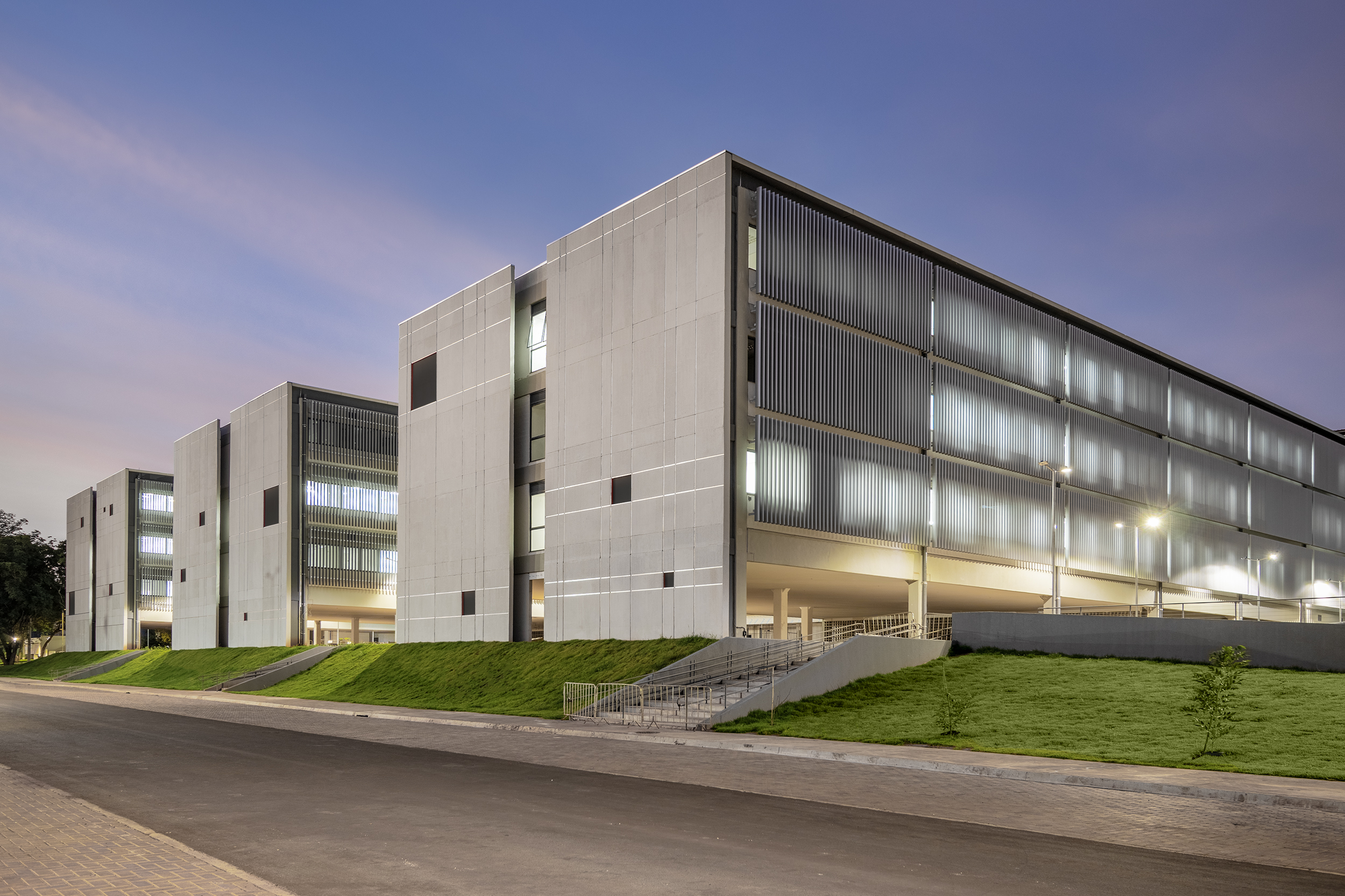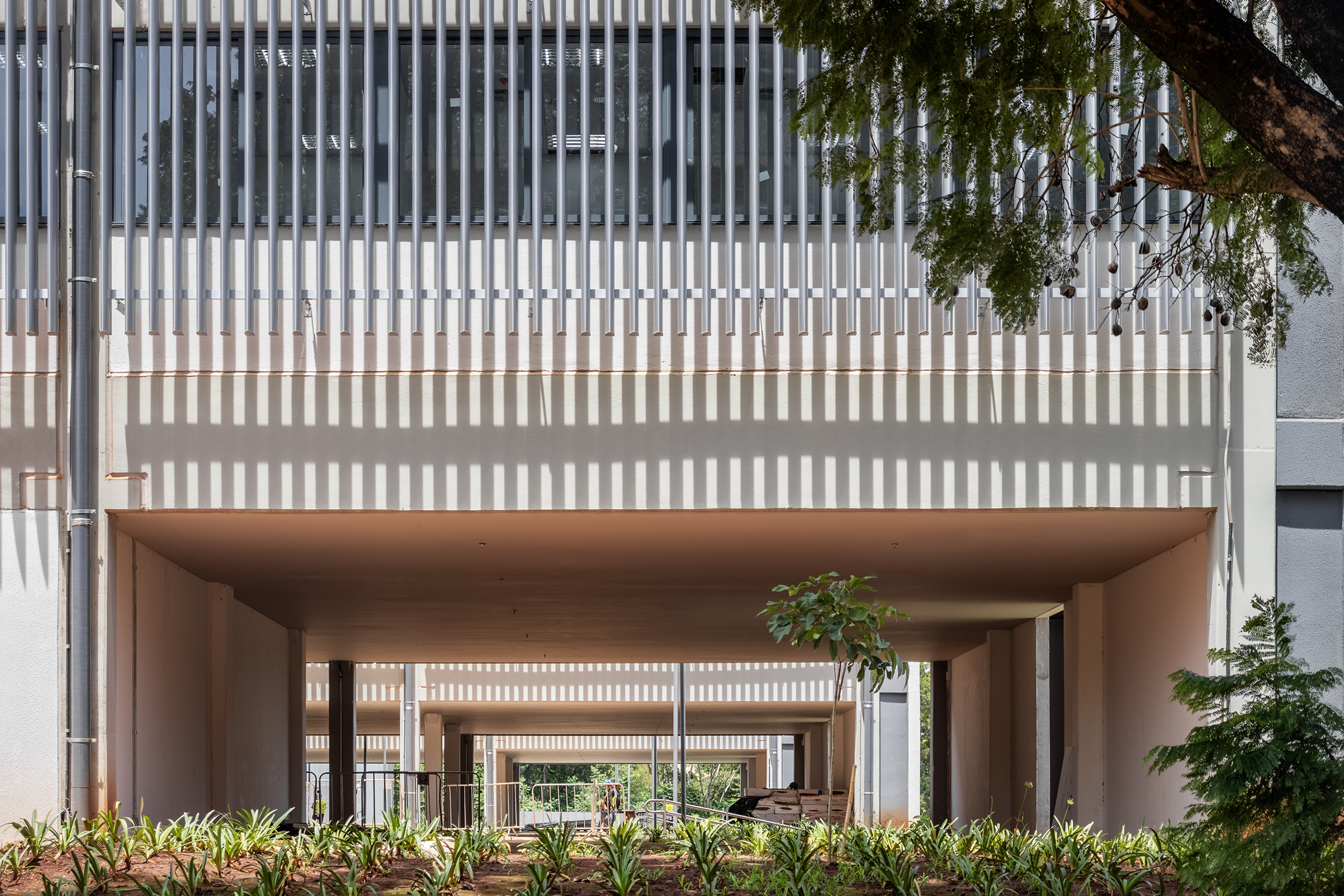 Da barra principal, destinada à administração, salas de aula e de professores, derivam três transversais a ela, cujo programa é integralmente de laboratórios. A especificidade do programa das três lâminas levou à ocupação lógica dos espaços, na distribuição dos laboratórios de acordo com suas funções e demandas programáticas. Todos as barras são resolvidas em estrutura de concreto.